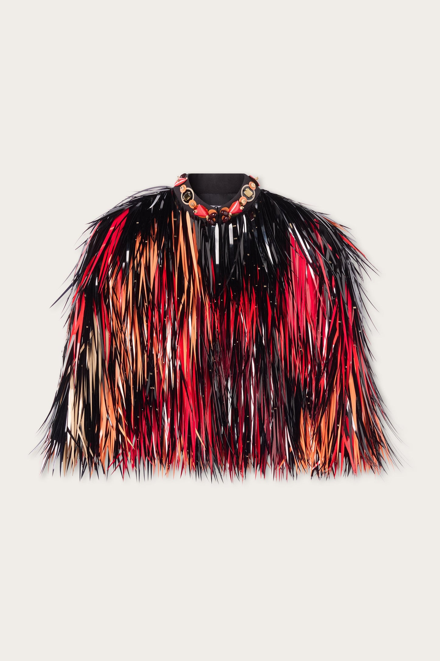 The spiky story is created by having custom colored and shaped sequins recreating the Marmo Big Pucci print. Each sequin has been attached by hand. The effect is rich and floaty because of the movement created by the long sequins. The result is a rich and flowing effect, amplified by the movement of the sequins and their extraordinary lightness. The profile is defined by a striking three-dimensional border, while the mix of shiny crystals, wood, metal, and plastic adds material depth and couture character.