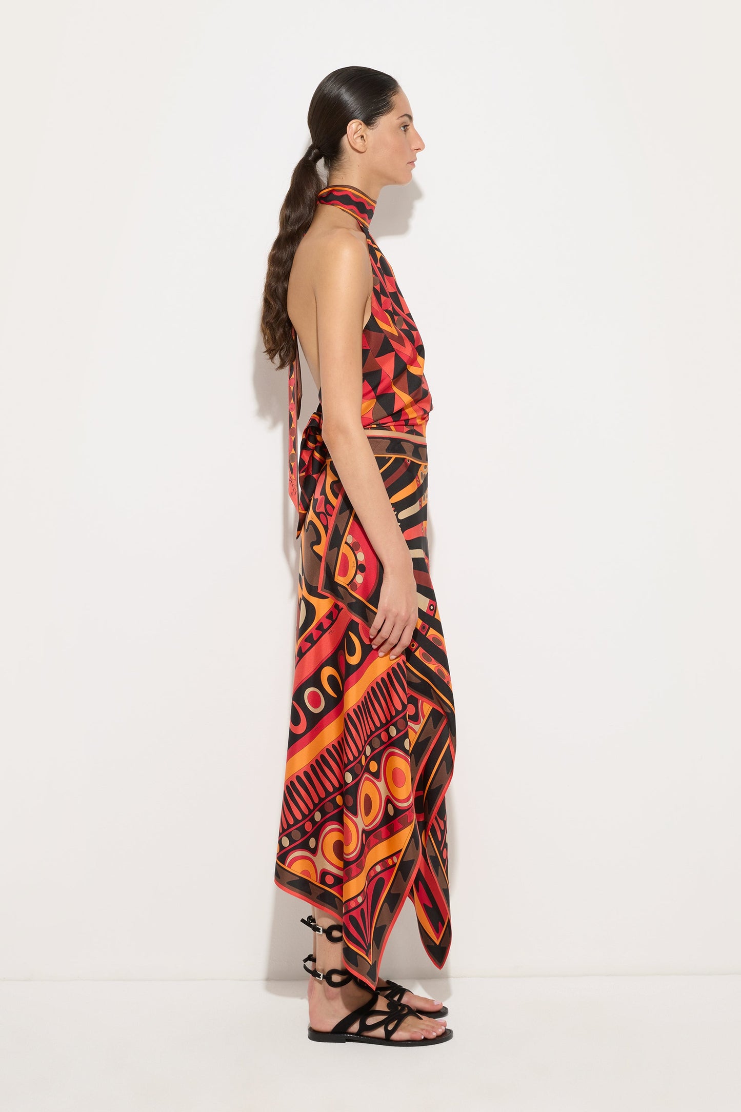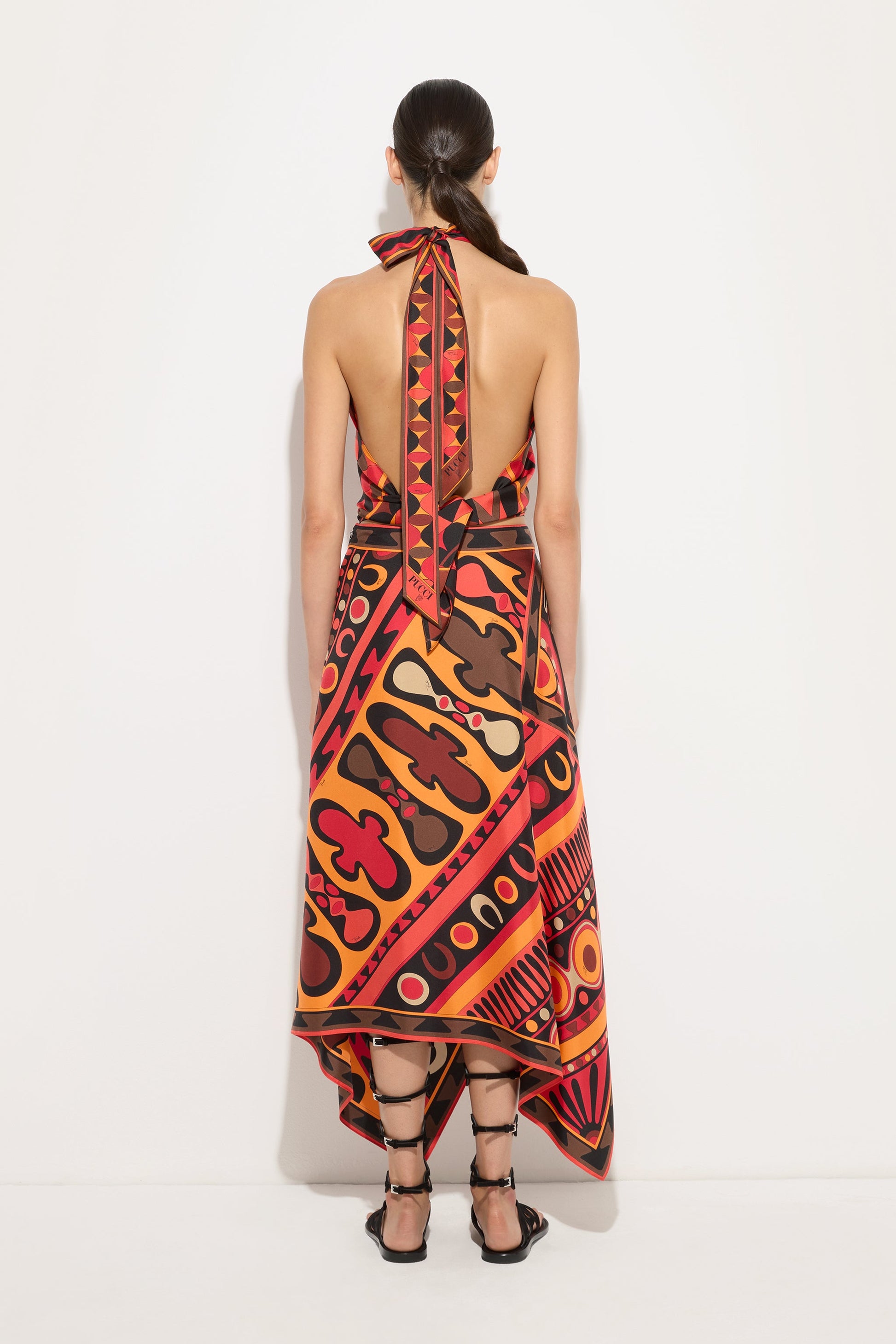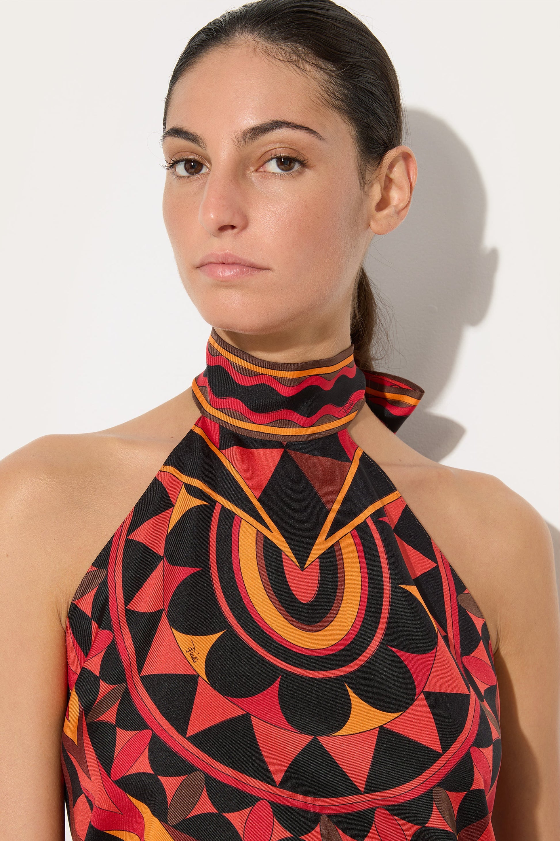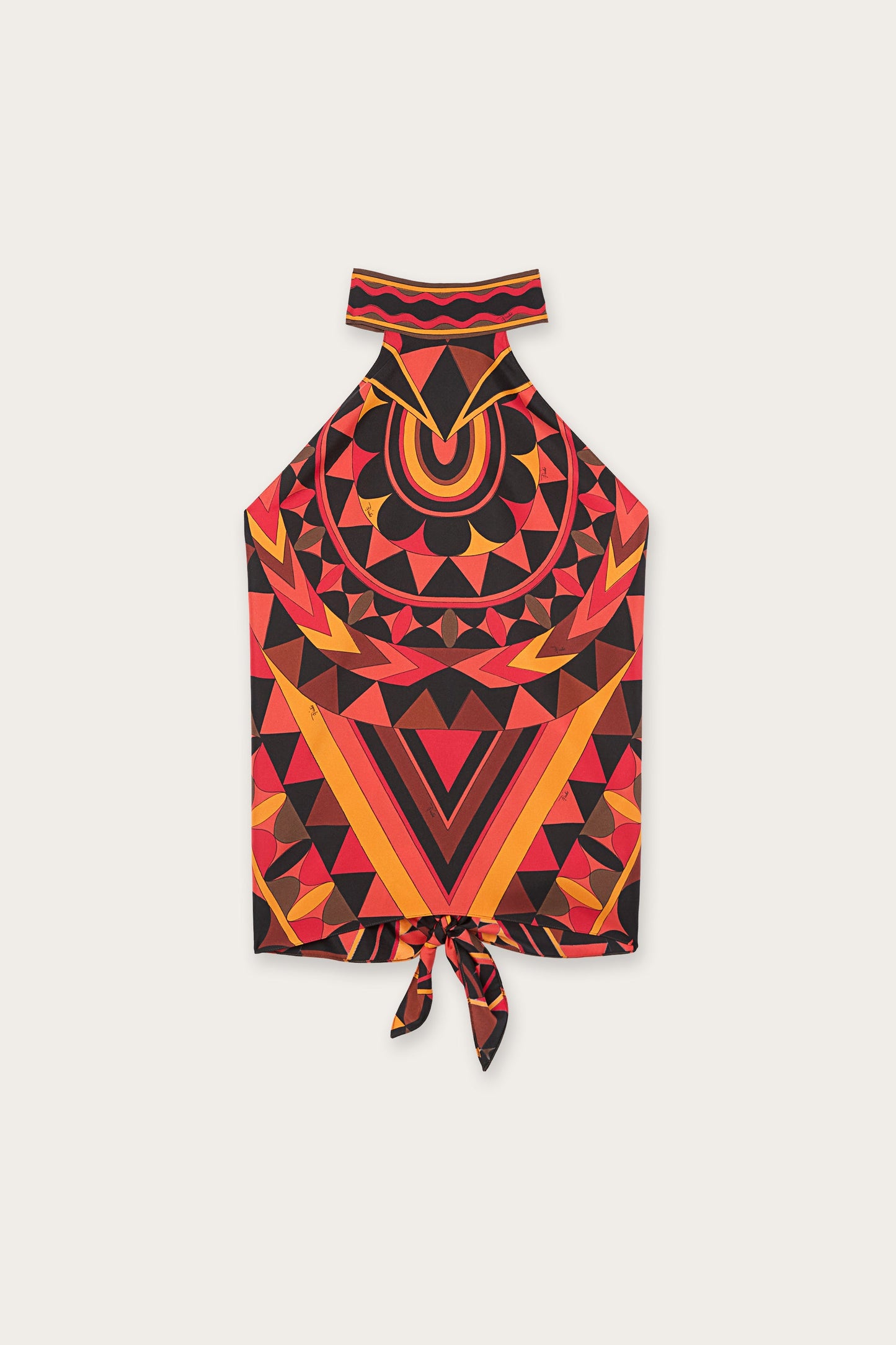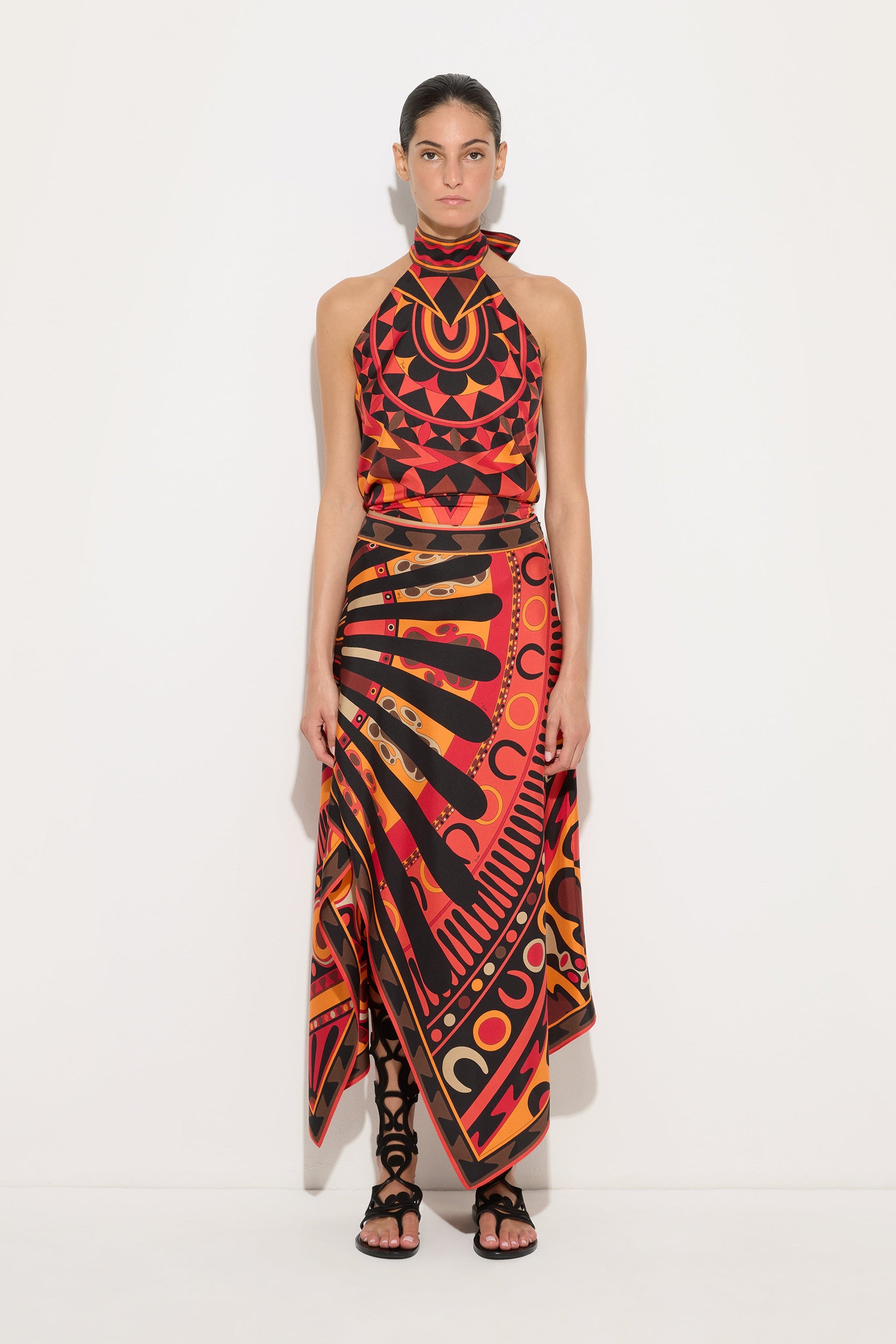 A top with a bold, contemporary design, defined by its strapless line and high neckline that frames the décolleté with elegance. Made of silk, it glides over the silhouette with lightness and fluidity, while the orange and black Manuba print adds intense and distinctive visual energy. An iconic piece, perfect for sophisticated looks.