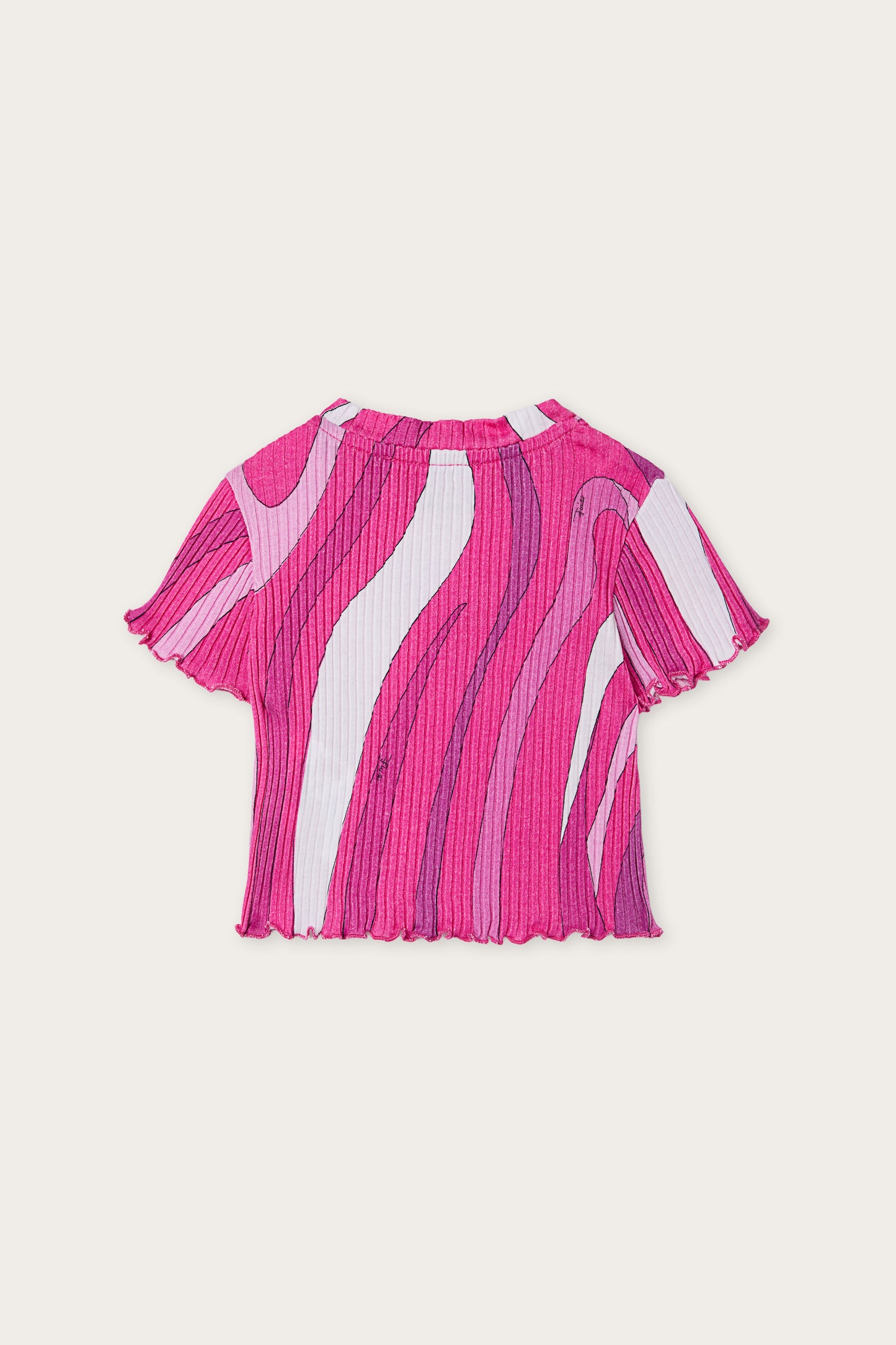 A ribbed T-shirt featuring a slim fit with slightly ruffled hems.The Marmo print in shades of pink adds a lively and dynamic accent.The ribbed knit provides natural stretch, allowing the garment to fit comfortably to the body.