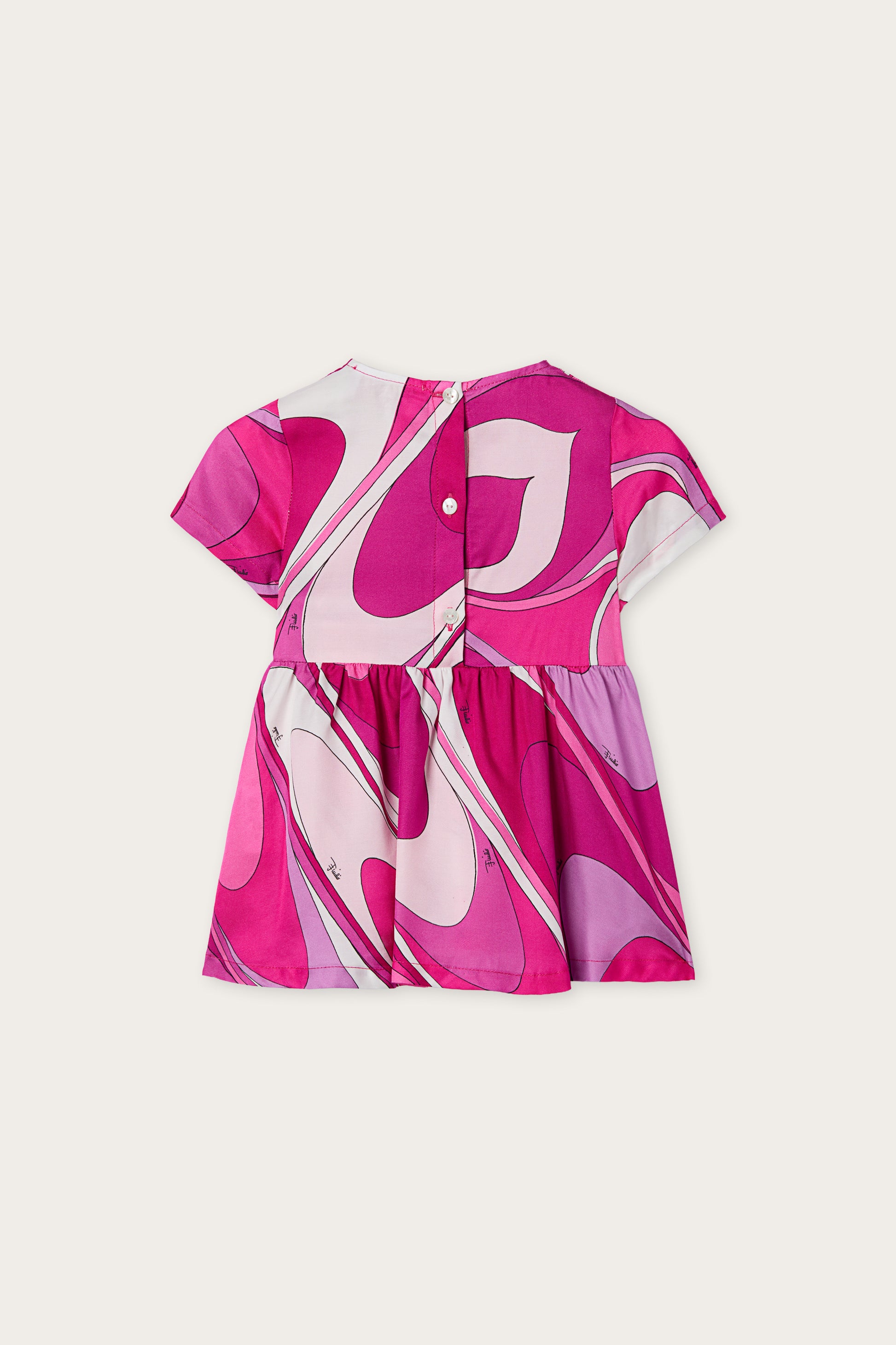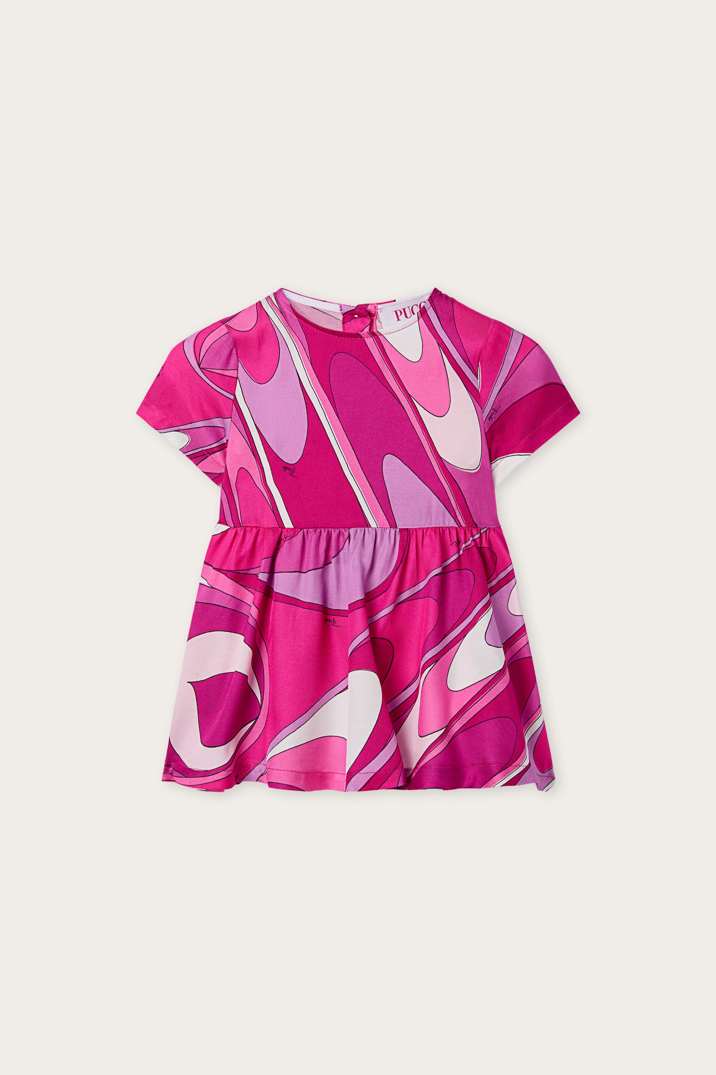 A T-shirt-style dress in viscose twill, featuring a simple and comfortable silhouette.The Onde print in shades of purple and white adds a lively graphic accent.The flowing fabric moves lightly with your body, offering a soft and natural fit.