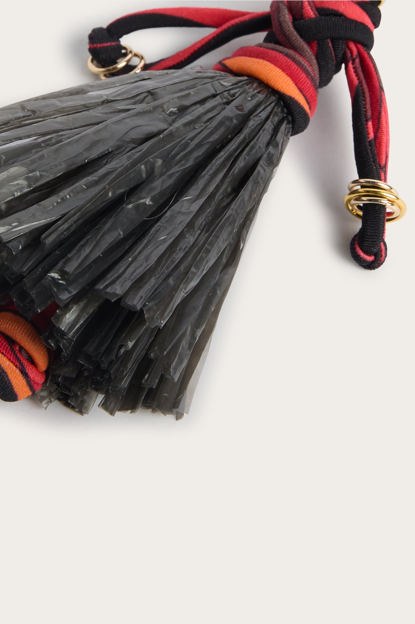 An ironic and distinctive accessory, designed to add a touch of Pucci to bags and keys. Printed Lycra meets raffia details in a light and contemporary play of materials, while the orange and black Iride print amplifies the graphic energy of the design. Compact but striking, it is the perfect detail to personalize any look.