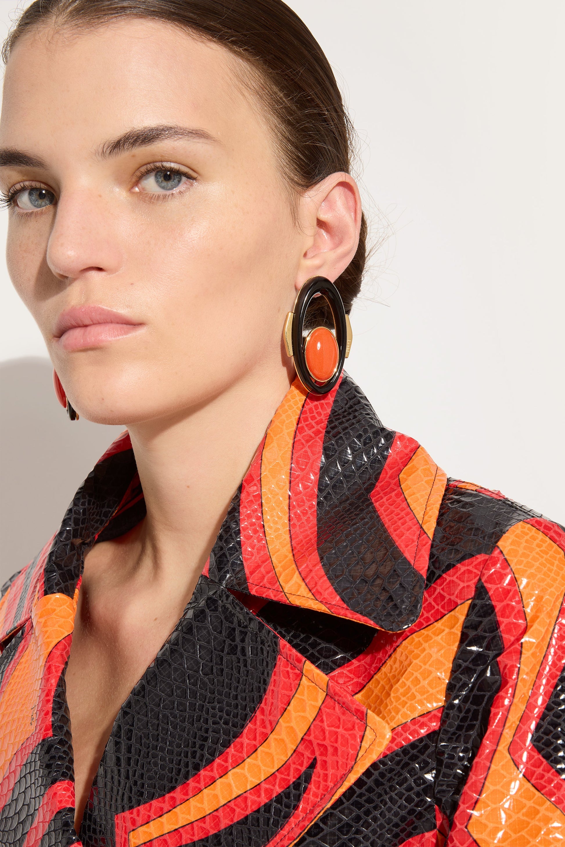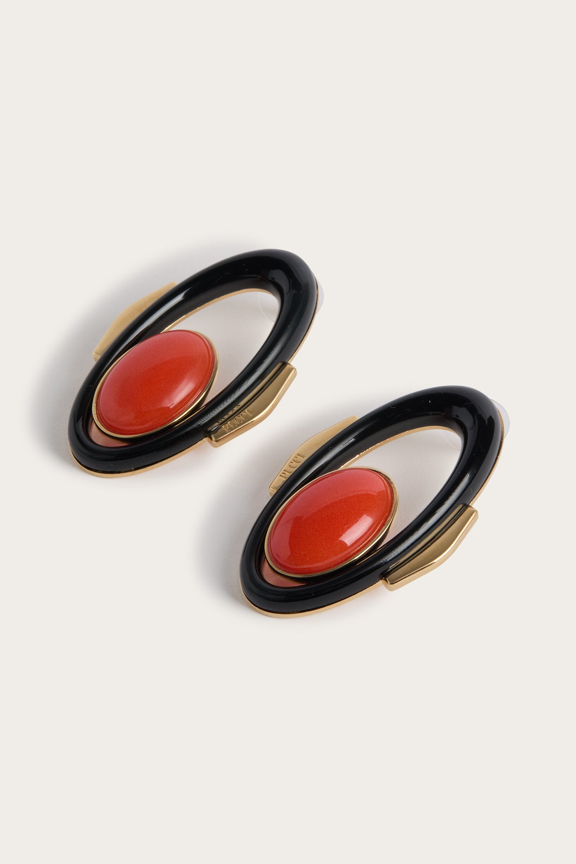 A bold and bright design, created to add a contemporary accent. The gold-finished brass of these earrings is combined with vibrant cabochon resin in a play of contrasts between precious metal and intense color. The stud shape gives structure and presence, making them perfect for enhancing the face with a statement detail. The pair consists of a left and right earring, designed to interact with each other with balance and character.
