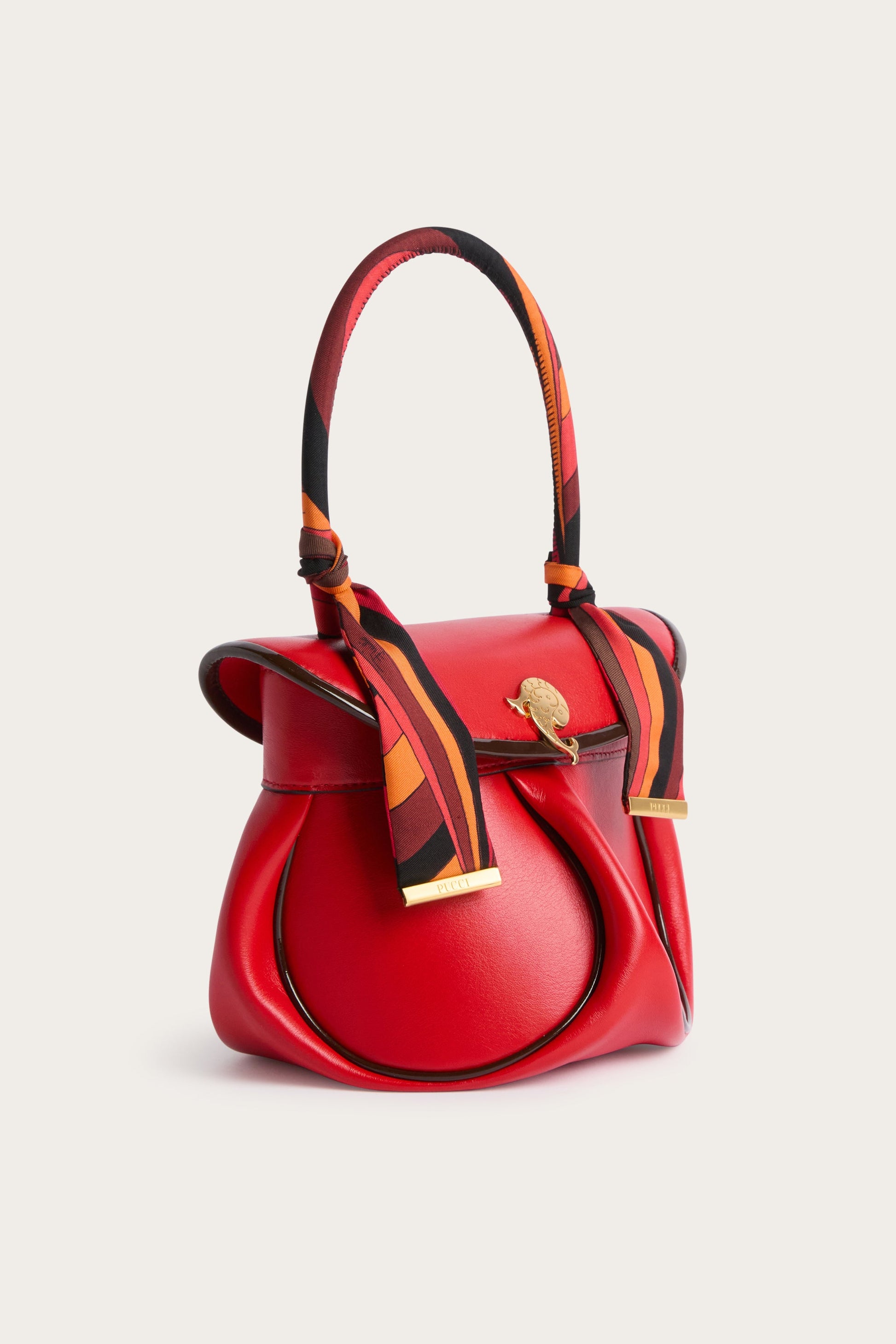 A sophisticated hobo bag, where precious materials and iconic details define contemporary elegance, in perfect Pucci style. Made of leather with patent leather trim, it features silk twill handles that add a distinctive and refined touch. The Alcantara lining completes the interior with a soft and luxurious feel. The branded foulard ends and gold foil logo on the back of the flap sign the design with discreet but recognizable accents. A versatile and structured model, designed to accompany everyday life with personality and character.
