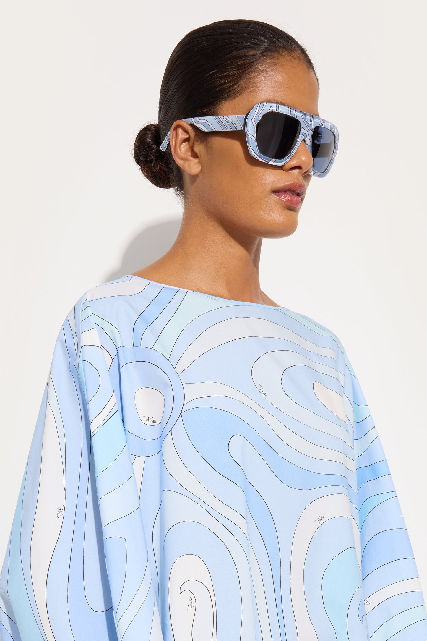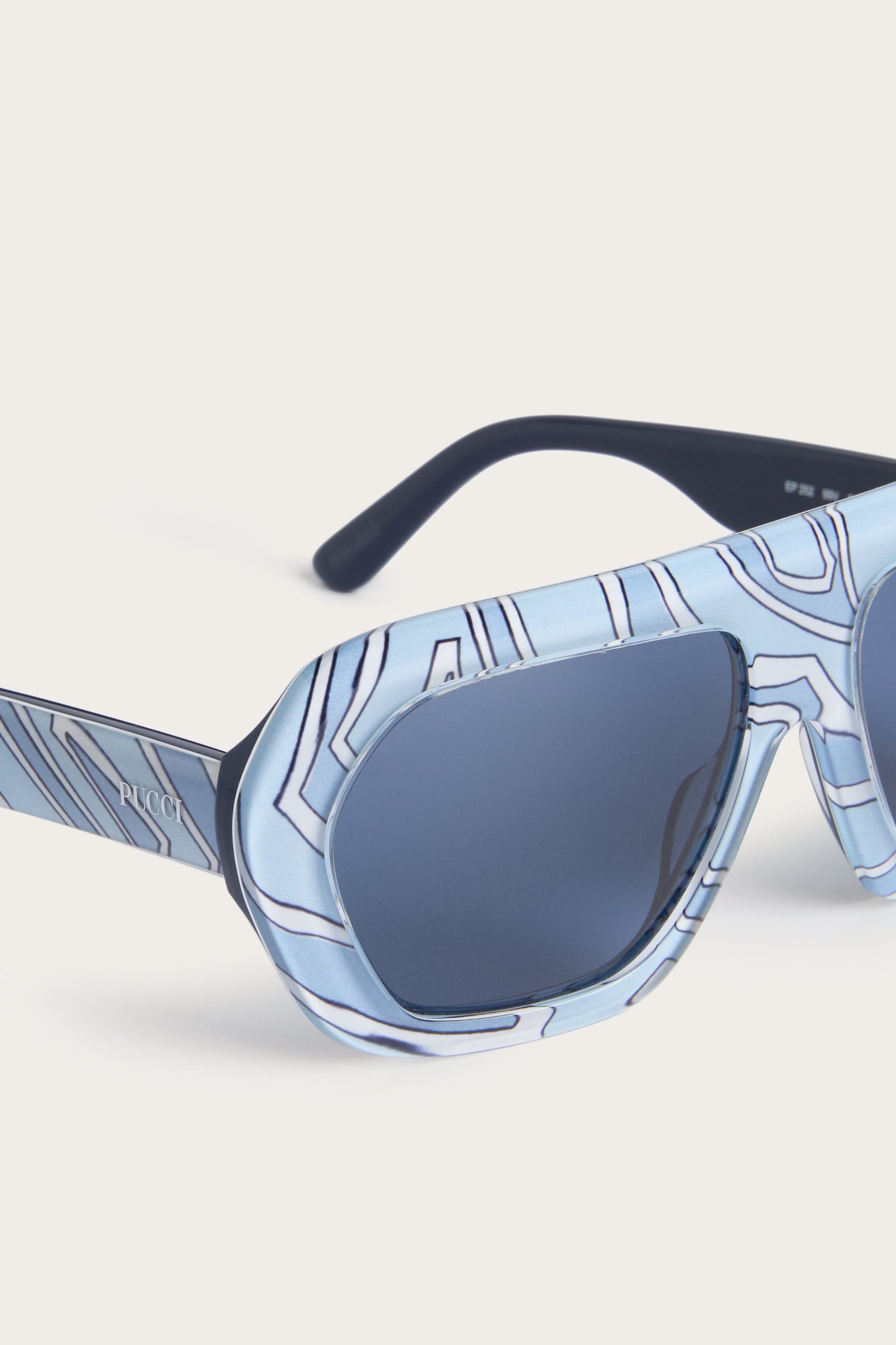 Oversized geometric frame that makes a bold statement, giving the eyewear a distinctive and iconic character. The temples are slim for a defined and elegant look, contrasting the bold and slightly puffy front, and feature Pucci lettering logo.