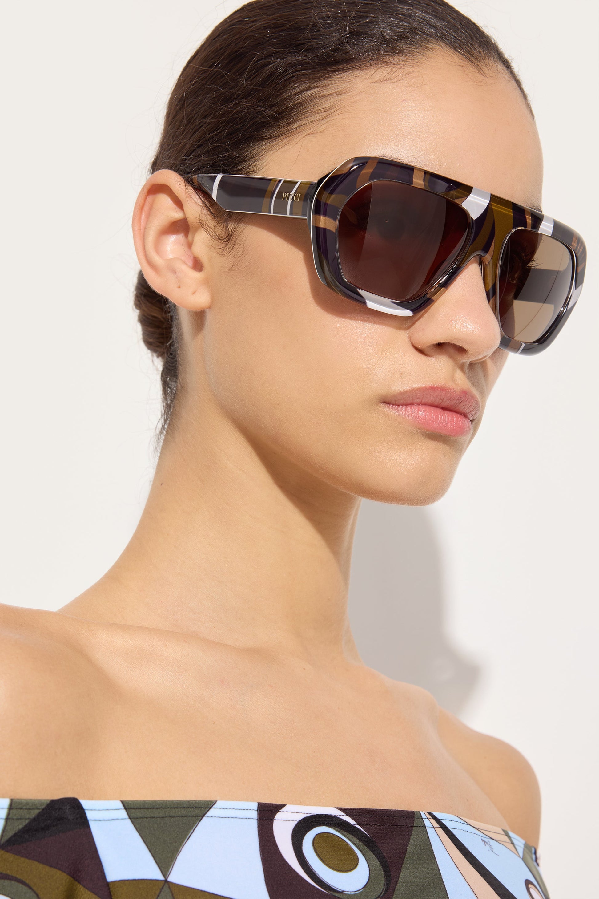 A striking model that interprets Pucci's graphic energy with a bold, feminine design. The oversized geometric acetate frame defines the look with personality, while the slightly curved front amplifies the dramatic effect. The temples create an elegant contrast with the bold front and are finished with the Pucci logo for an iconic, contemporary result.