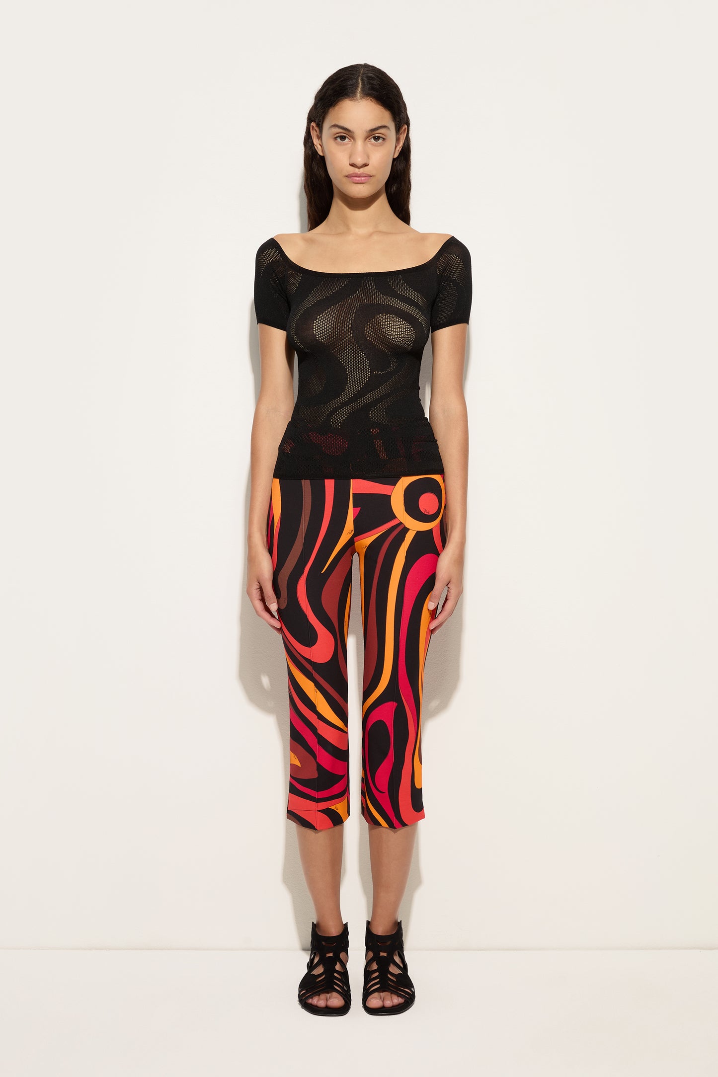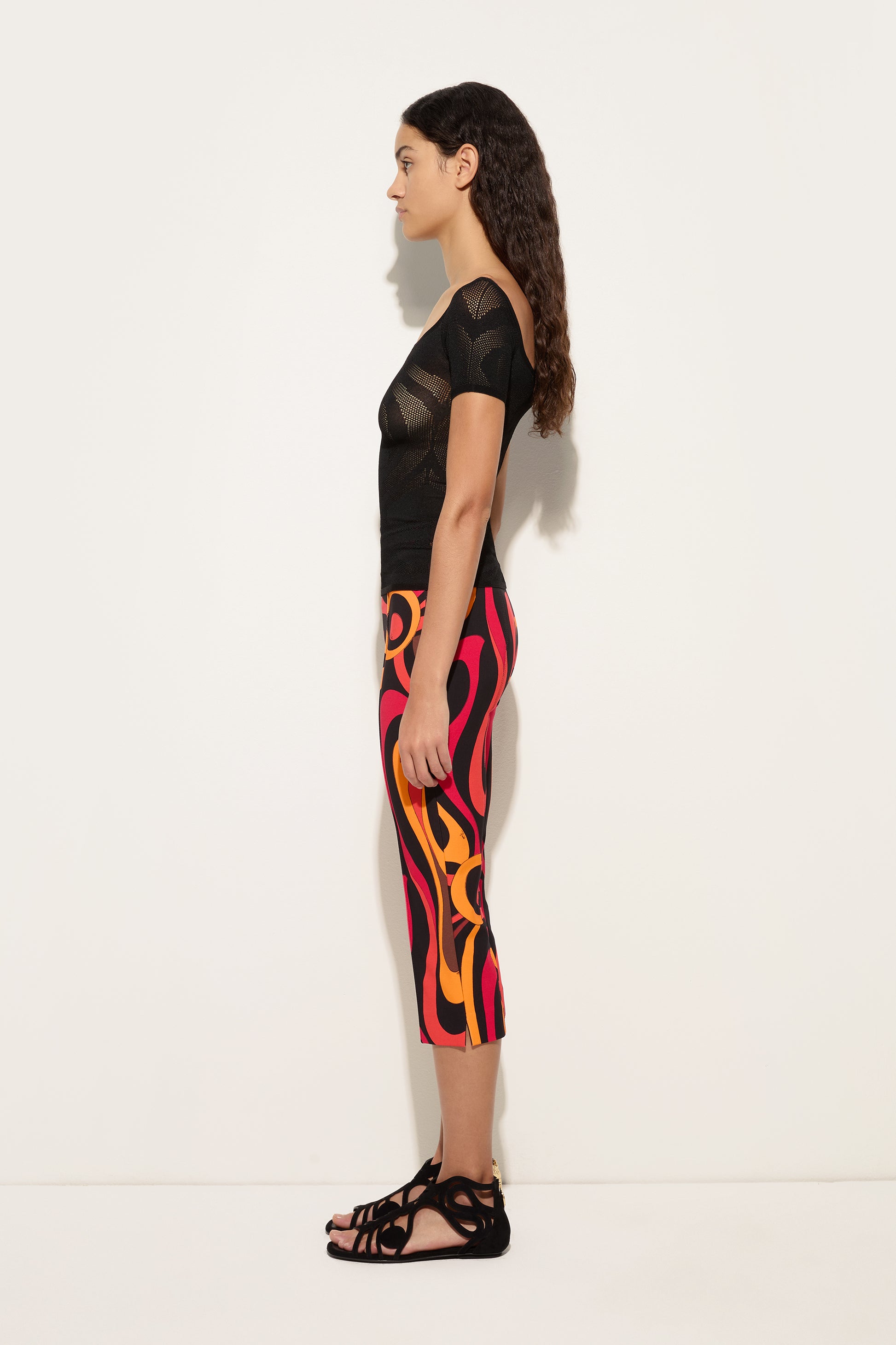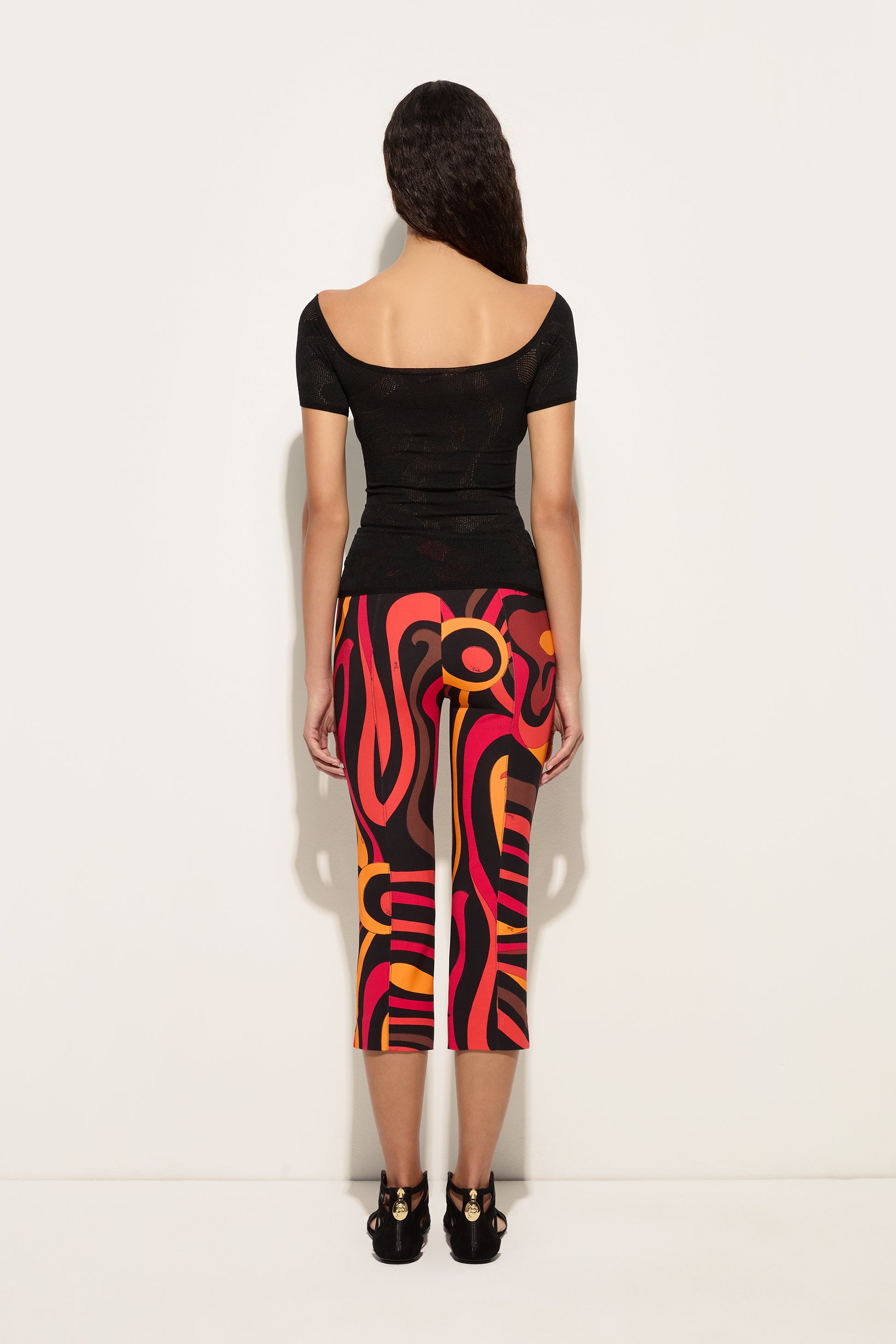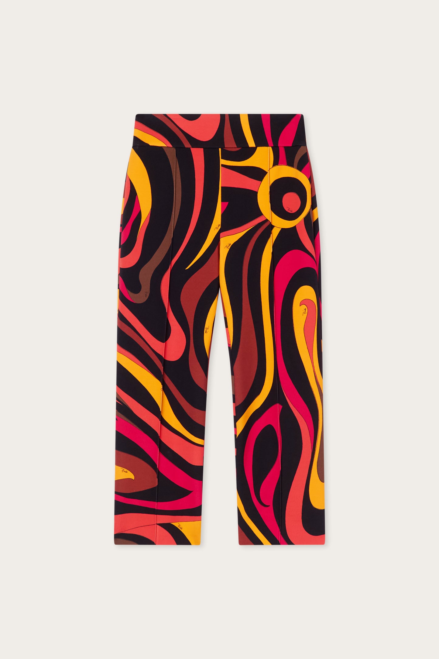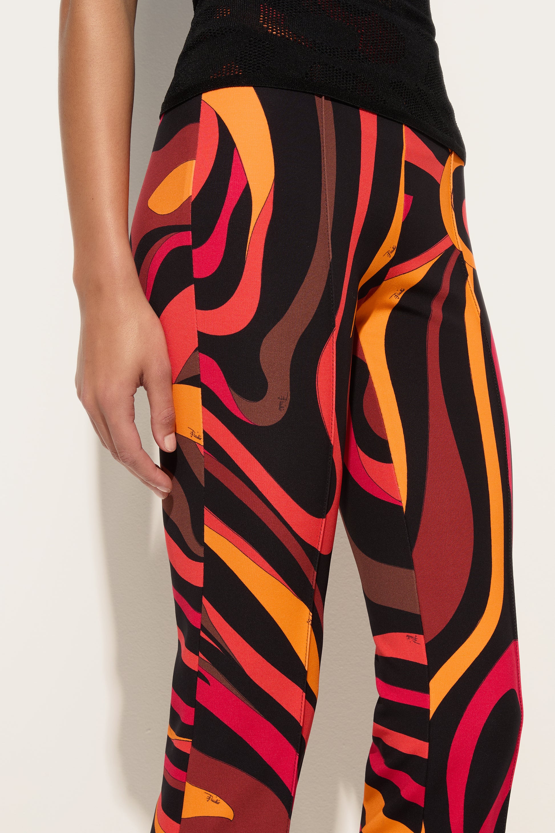 Essential lines, Pucci energy. These straight-cut, mid-rise pants interpret the Marmo print in orange and black with a fresh, contemporary attitude. The viscose jersey provides softness and comfort, following your movements with natural fluidity and maintaining a clean, versatile fit. Perfect to wear with matching or contrasting tops for bold summer looks.