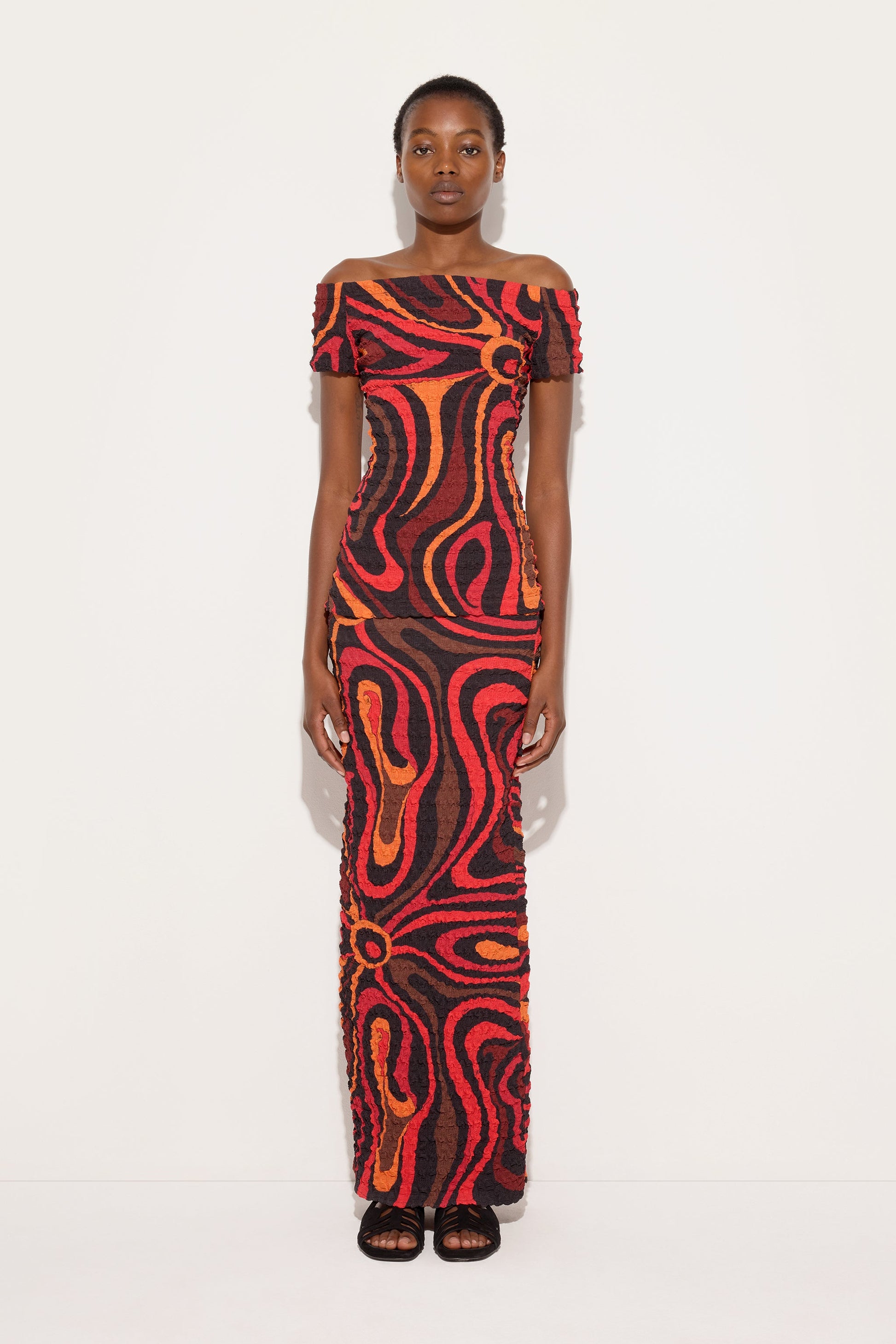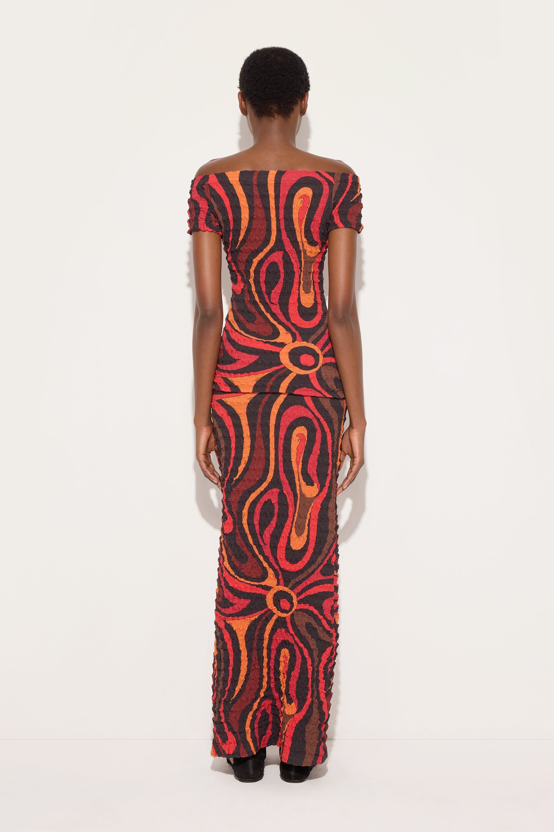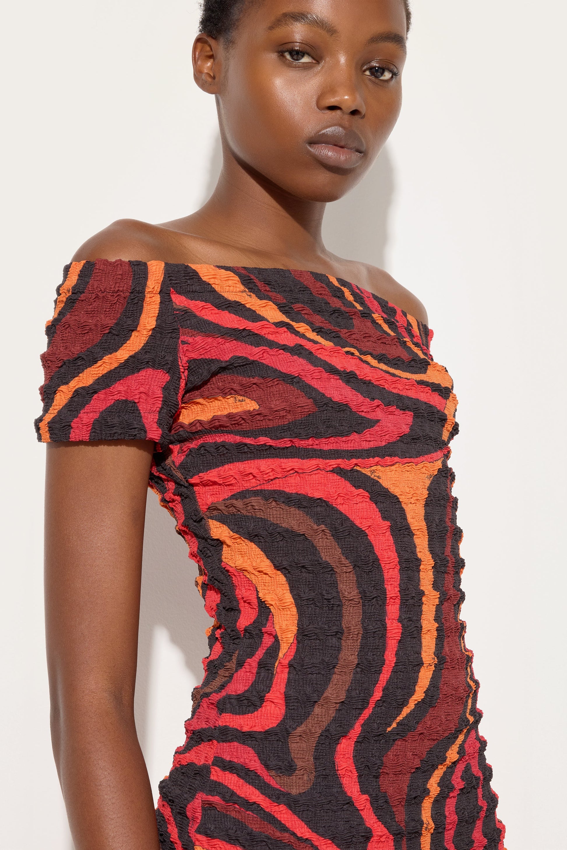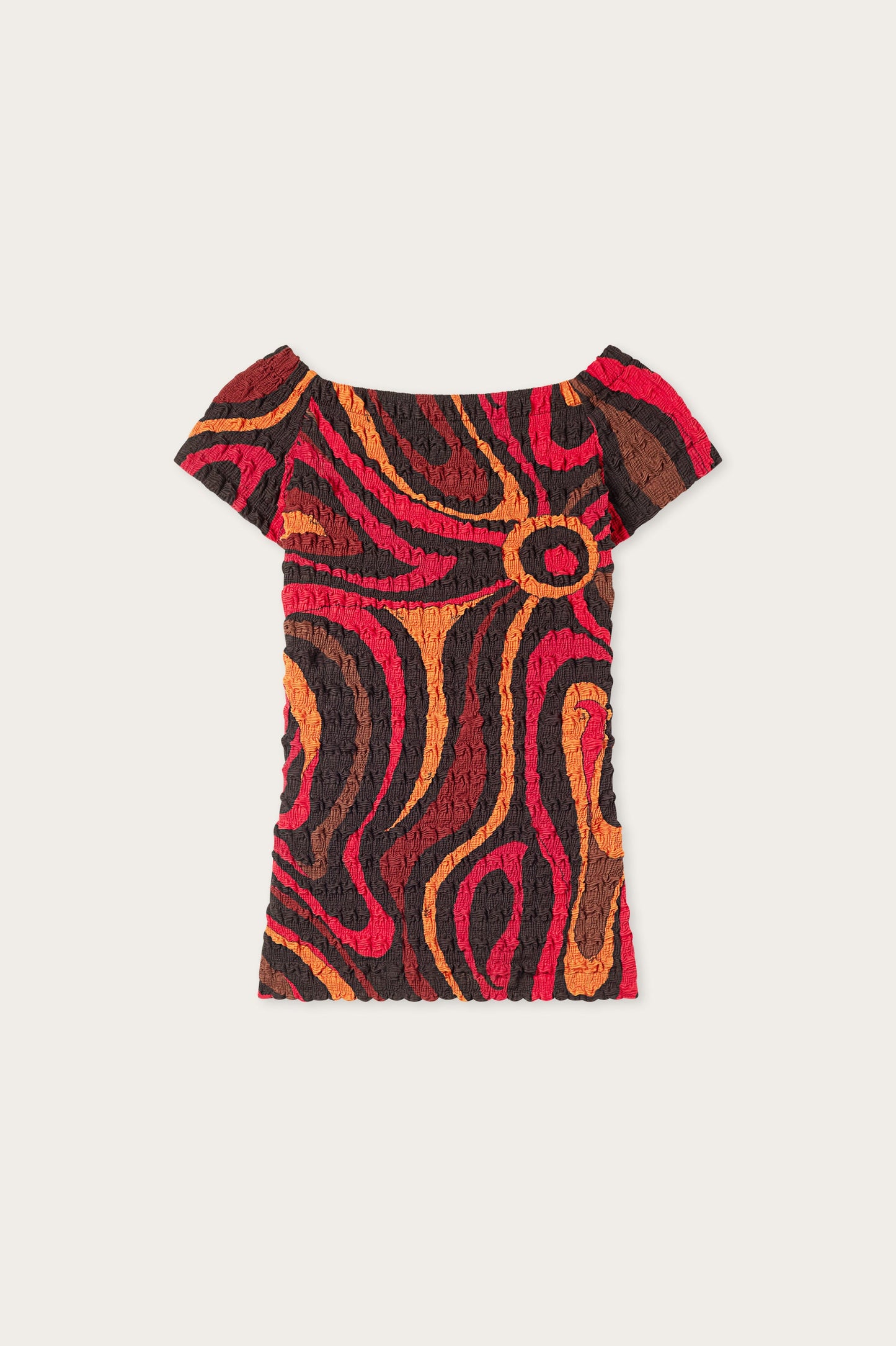 A bold top that combines clean lines and striking details. The off-the-shoulder design and short sleeves create a clean, contemporary silhouette, while the Shibori technique adds depth and unique shades. The orange and black Marmo print amplifies the chromatic energy with a vibrant and bold contrast. A model designed to stand out naturally, combining technique and color.