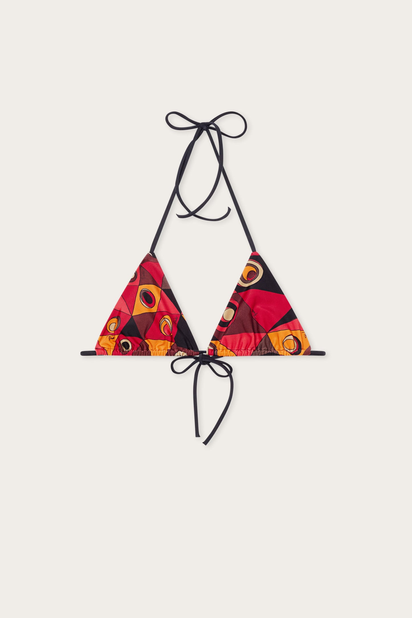A bikini with a bold design that highlights the Occhi print through a simple, contemporary design. The triangle top is completed by thin straps tied at the back, allowing for a natural fit adjustment. The color composition in shades of orange and black enlivens the surface with a dynamic visual rhythm, while the stretch Lycra, combined with the inner lining, ensures comfort and support during movement. A model designed to stand out with lightness and character.