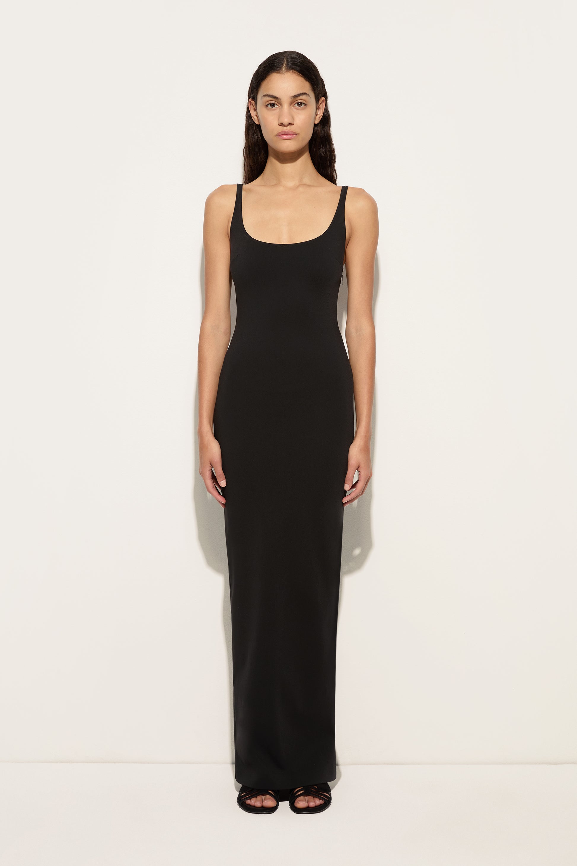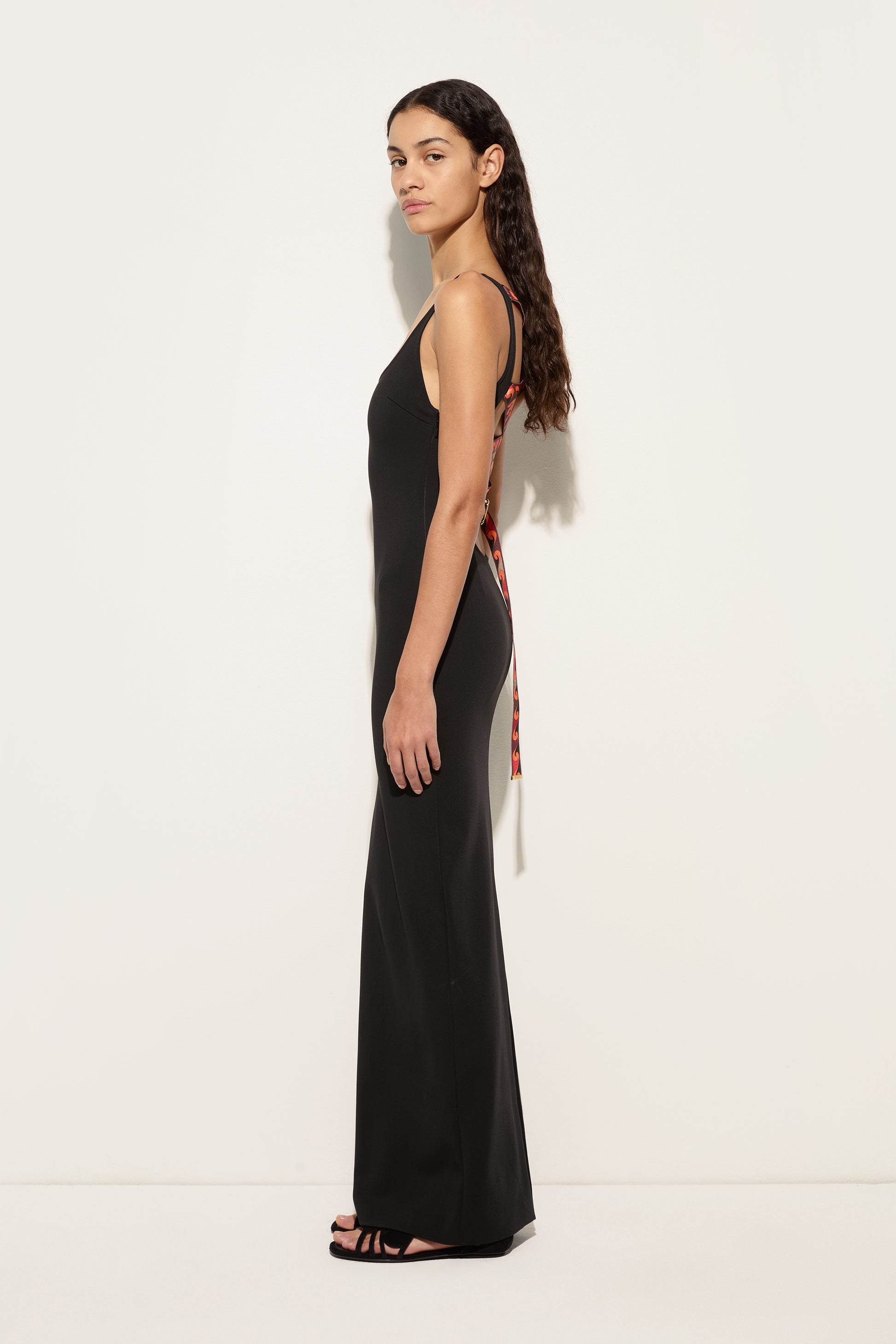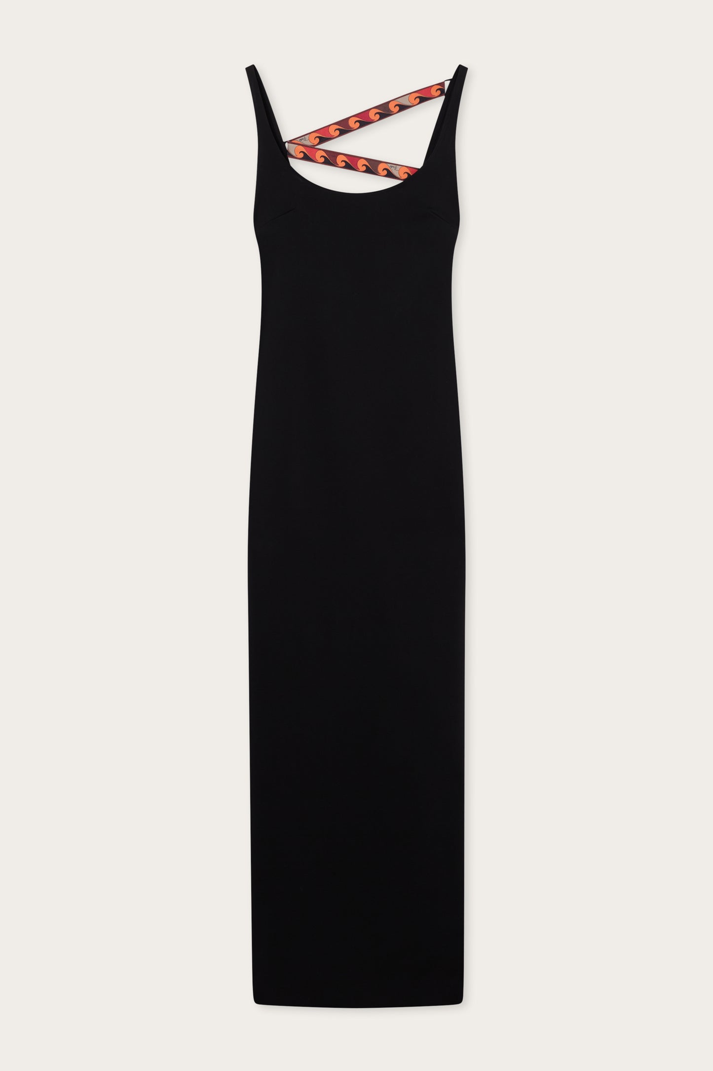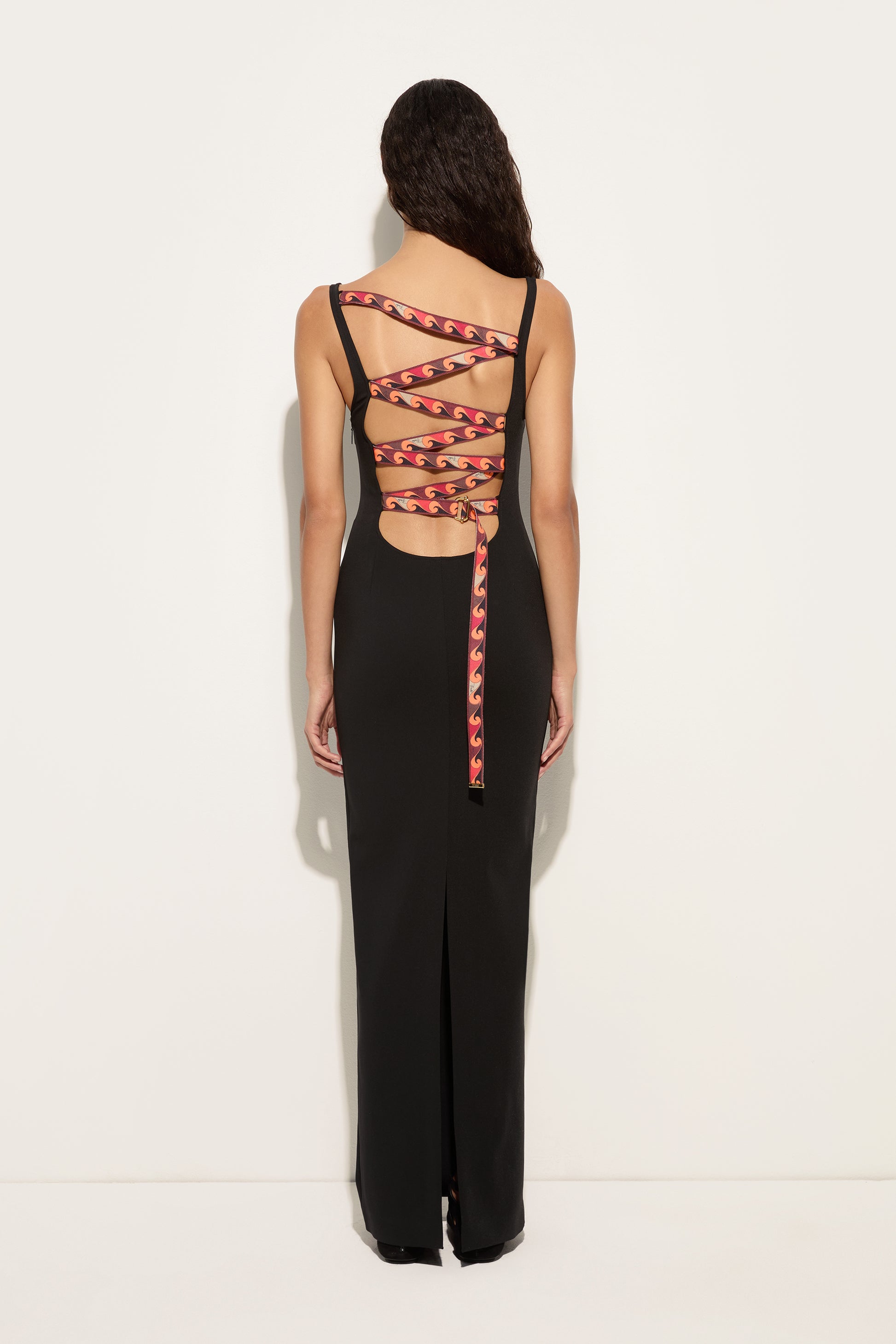 A minimalist silhouette that flatters the body with precision and fluidity. Crafted from super-stretch cady, this dress features a straight, fitted cut with a square neckline that frames the décolleté in a clean, contemporary way. The printed gros-grain details on the back add a subtle graphic accent, while the side zipper closure maintains the linear construction. The fabric’s structure, with viscose yarns woven into the weft on an elastane warp, ensures a second-skin effect and a comfortable fit.