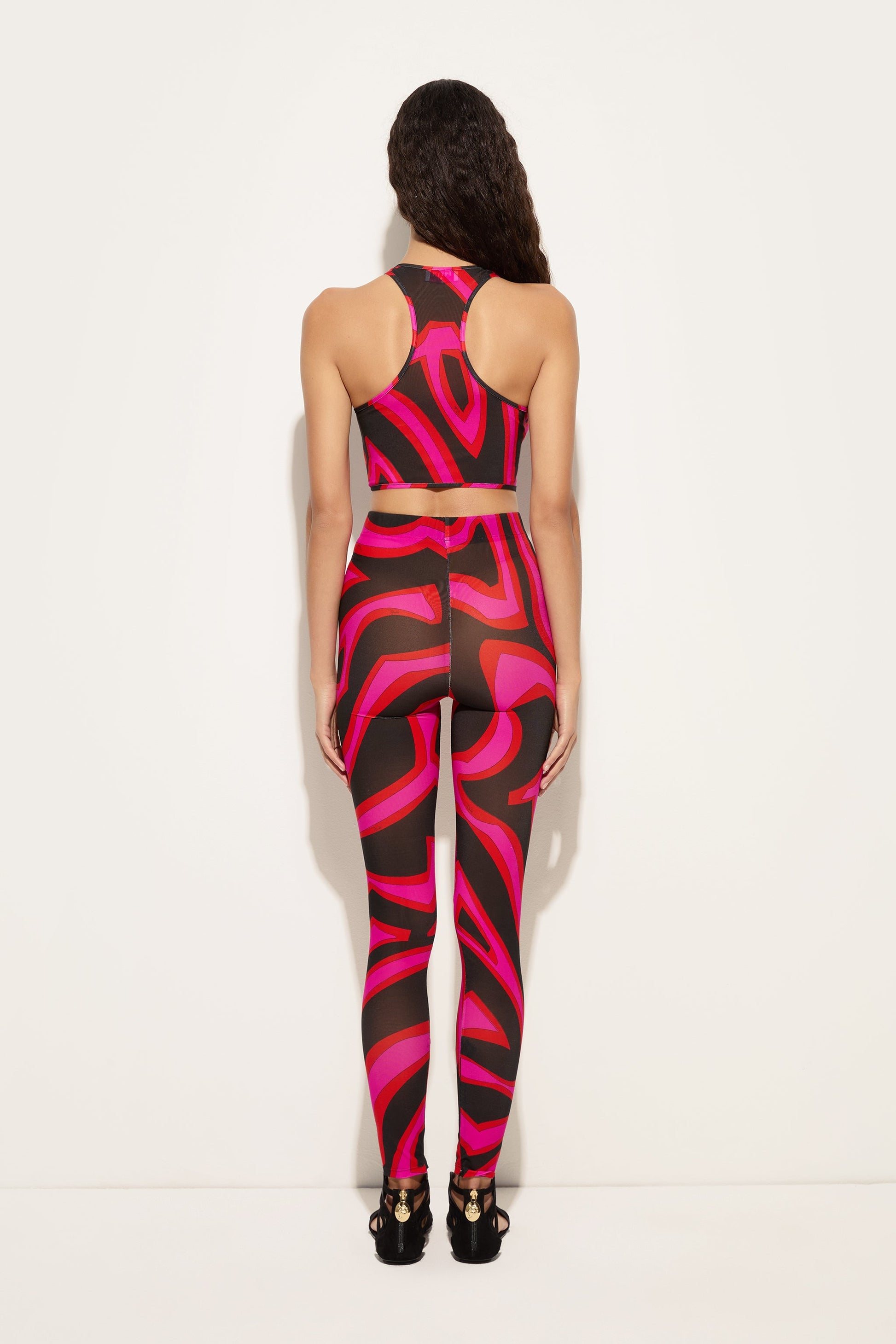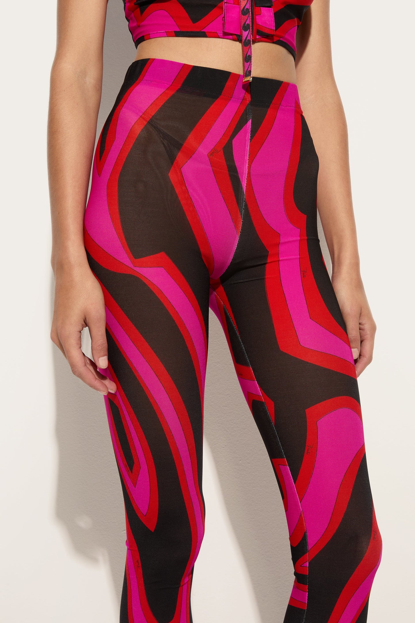 Leggings with a dynamic and contemporary character, designed to fit the silhouette with precision. Made from printed Lycra, they accompany movement with elasticity and comfort, while hidden zips at the ankles add a technical and functional detail. The Labirinto print in fuchsia and black amplifies the graphic energy of the garment, perfect for active and urban looks.