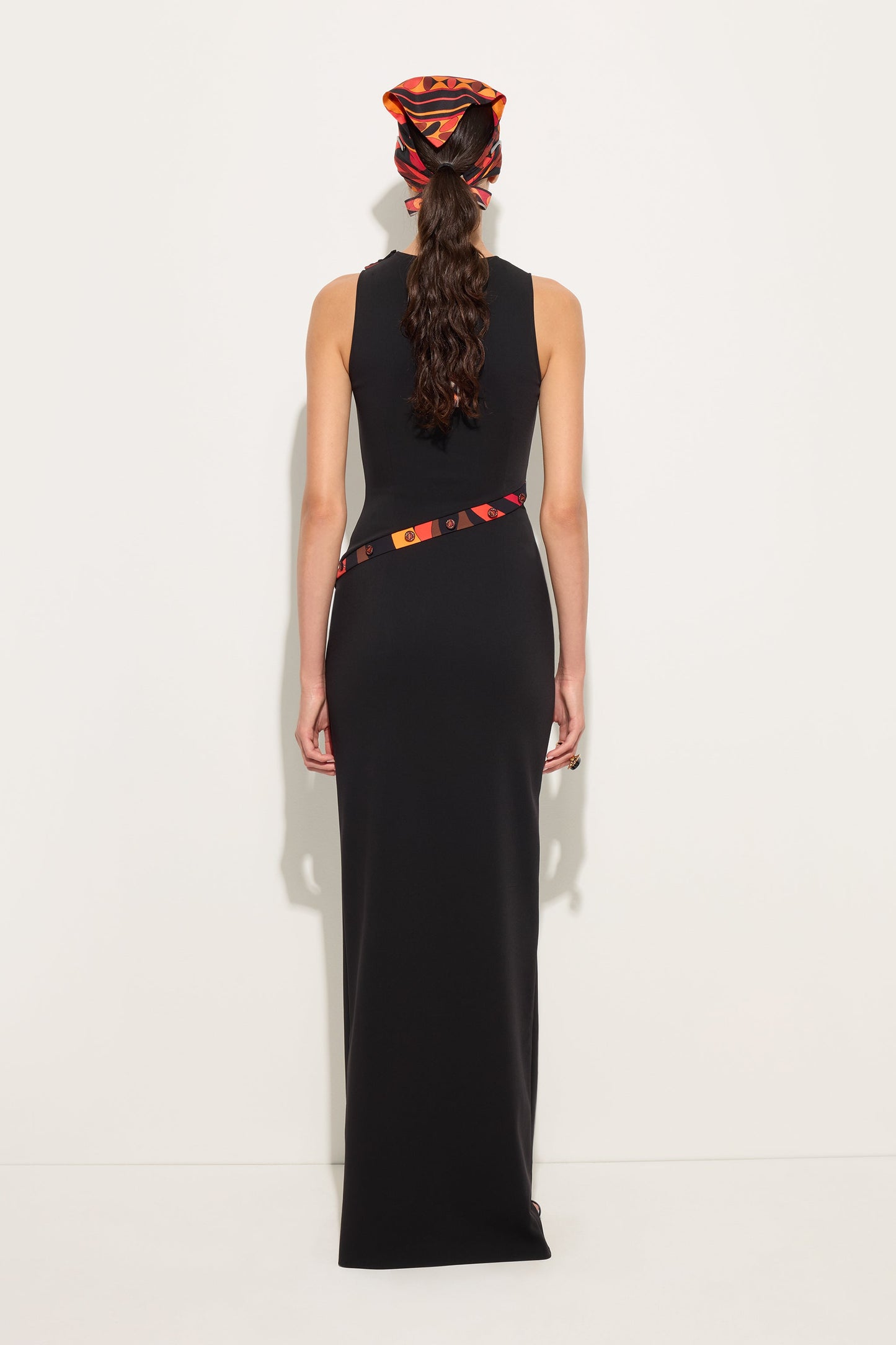 A long dress with a bold and sophisticated character, designed to follow the silhouette with precision. The printed details starting from the shoulder introduce a distinctive graphic accent, while the buttons covered in printed fabric embellish the design with material consistency. The side slit, finished with matching buttons and contrasting fabric that continues below the opening, adds movement and elegant sensuality. Made from super-stretch cady, it combines structure and comfort.