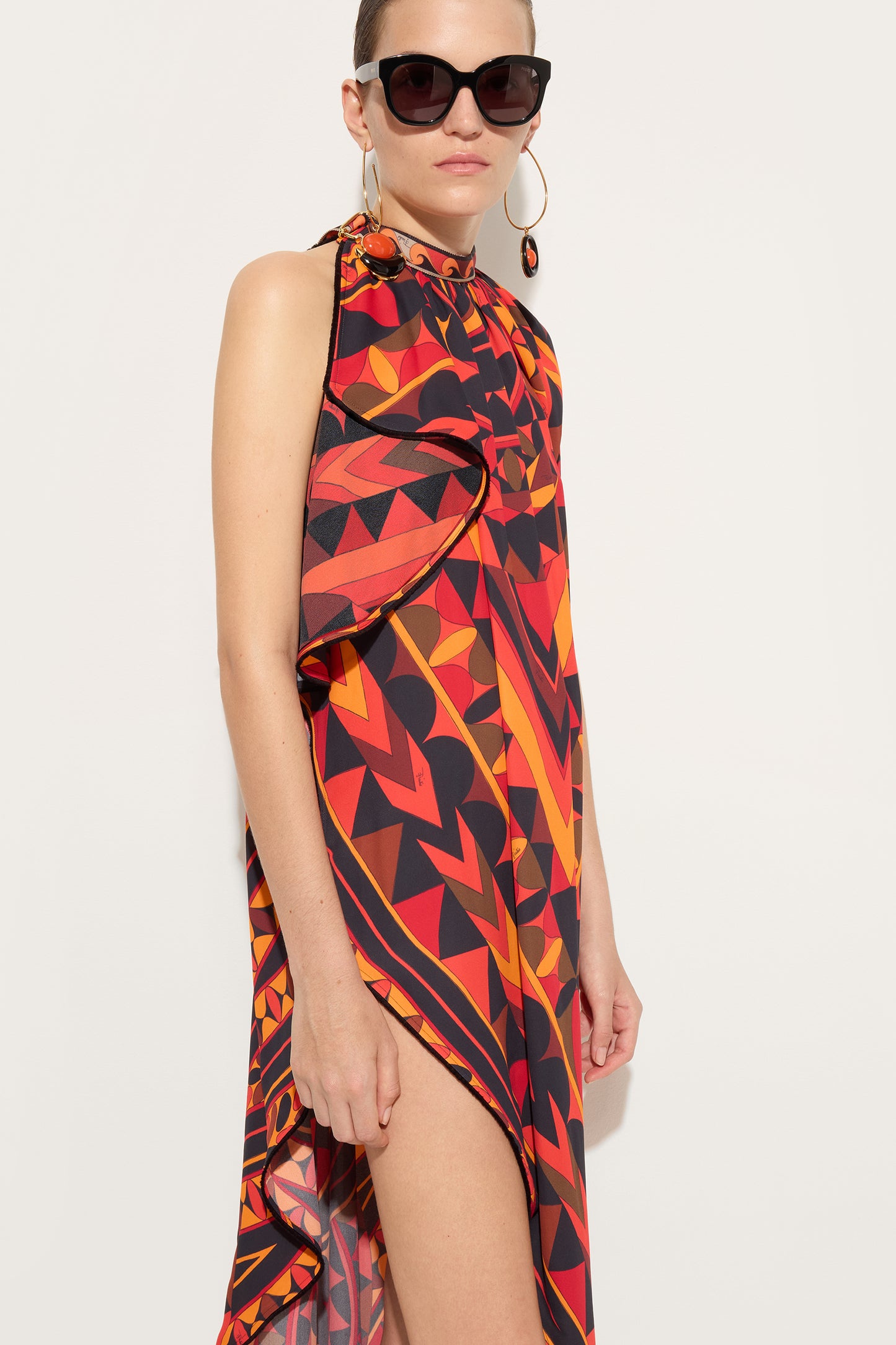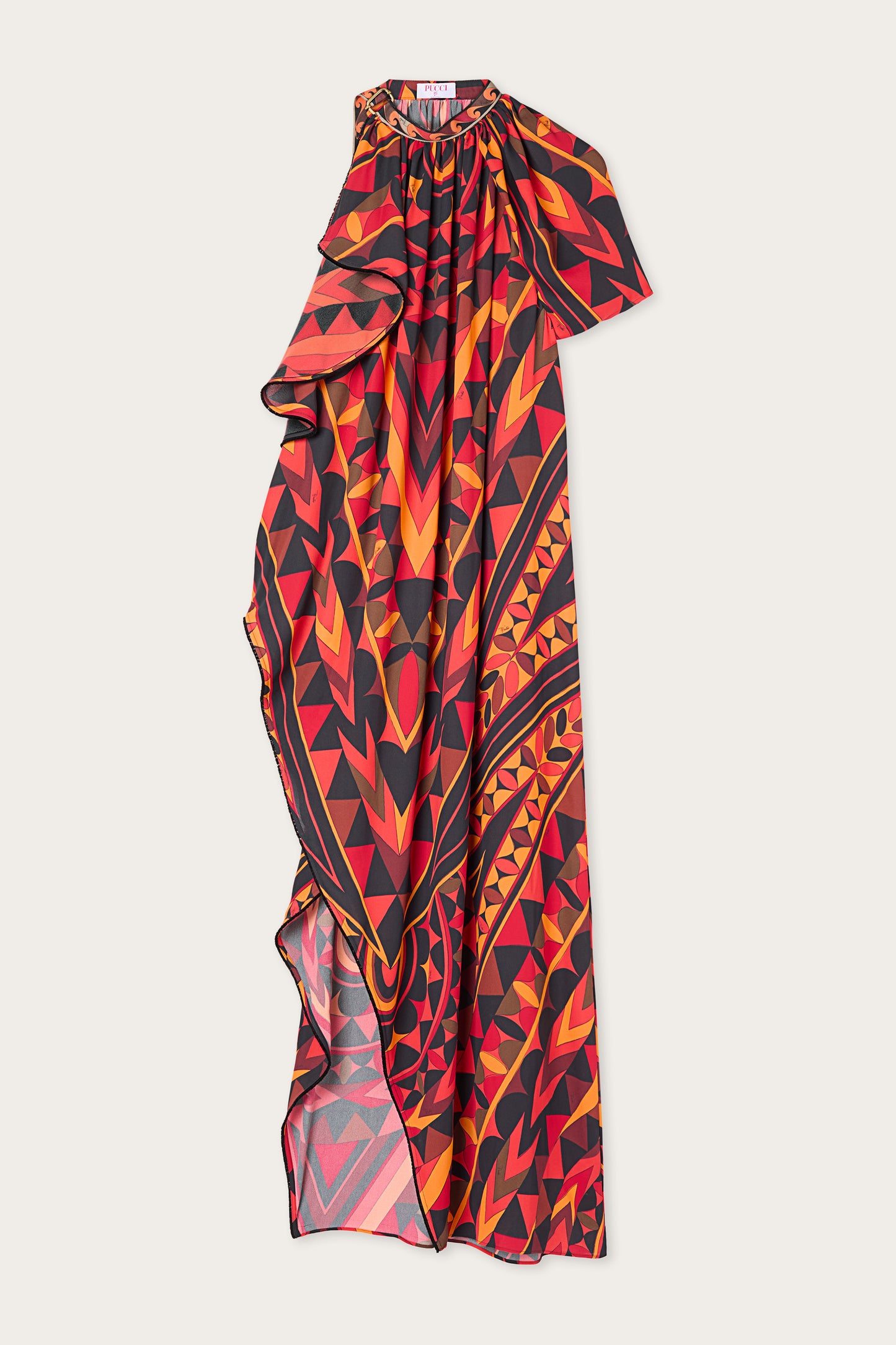 A lightweight, flowing dress that enhances movement with natural elegance. Crafted from double silk georgette, it features a slightly textured finish that adds depth and body to the fabric. The design is defined by a layered neckline with a ribbon and metal buckle, a distinctive detail that adds a contemporary touch. The side slit adds dynamism to the silhouette, while the orange and black Manuba print completes the piece with a bold graphic statement.