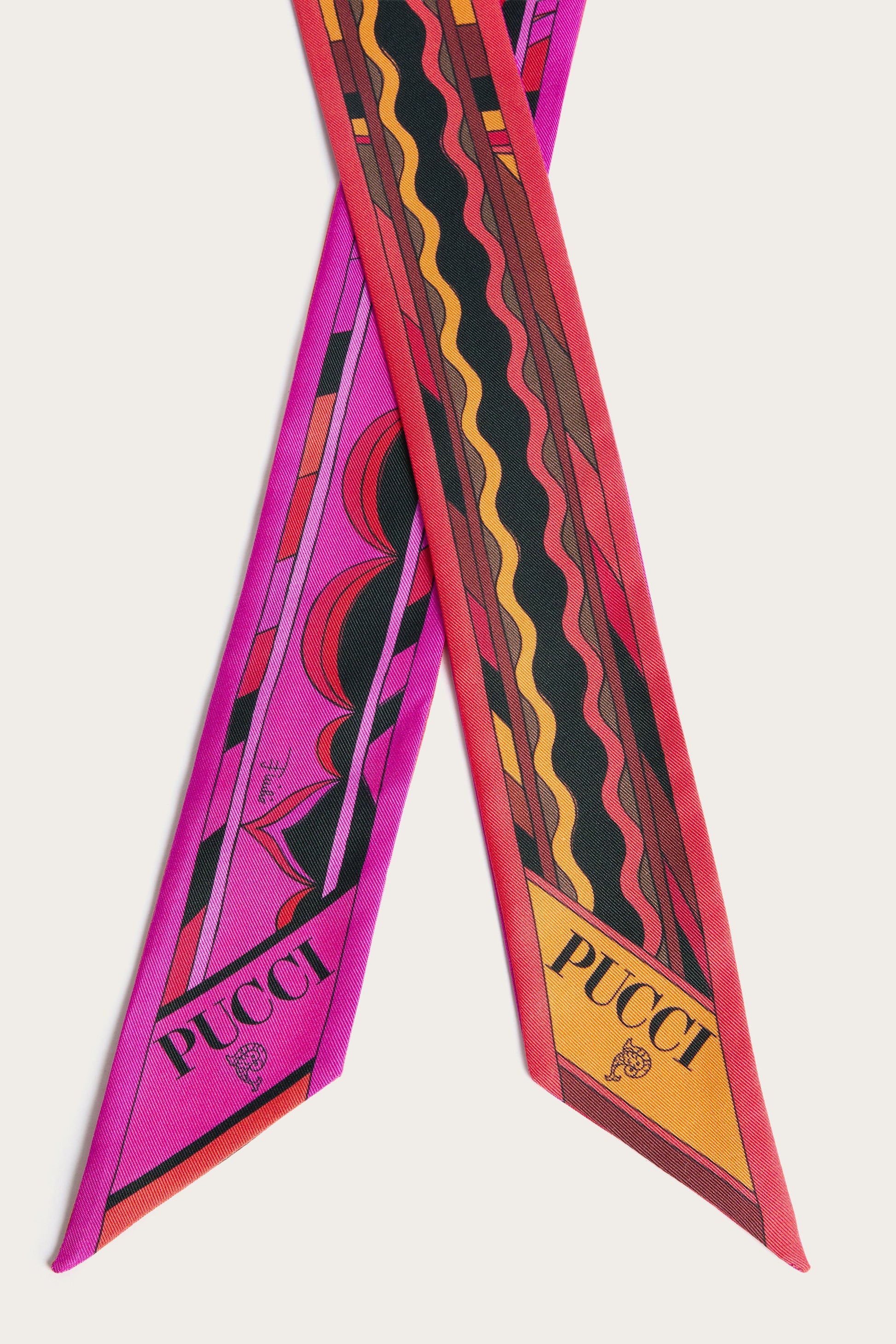 An elegant and versatile accessory, perfect for adding a touch of color to any look. This silk twilleau features pointed edges and a refined mix of prints. Lightweight and sophisticated, it can be worn in a variety of ways: as a headband, around the wrist, or tied to a bag for a distinctive detail that expresses the unmistakable Pucci style.