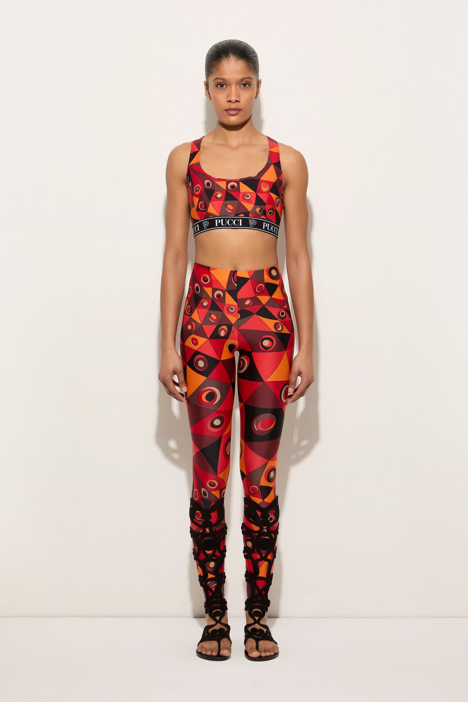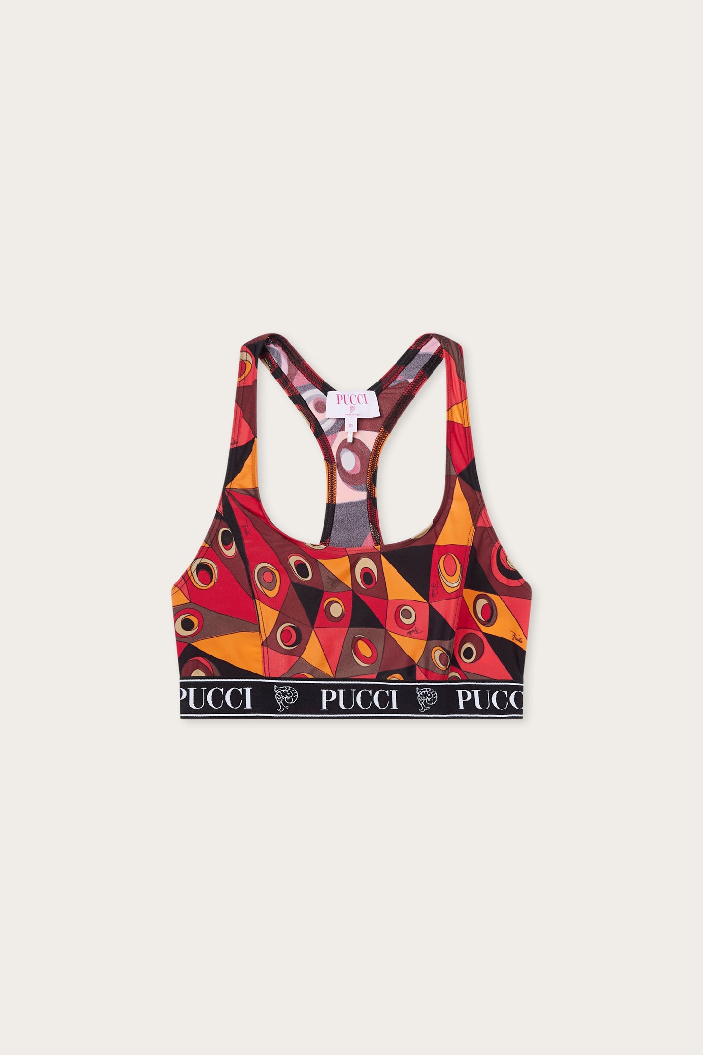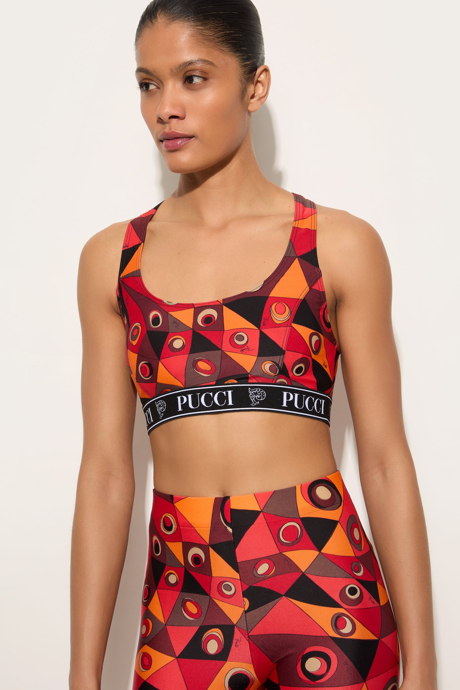 A sports bra with high-performance design, created to offer support and freedom of movement. Made from stretch Lycra, it features an elastic band and wide straps that ensure comfort and stability during activity. The Occhi print in shades of orange and black runs across the garment with a bold graphic rhythm, transforming a functional item into a piece with a strong visual character. A balance between performance and iconic identity.