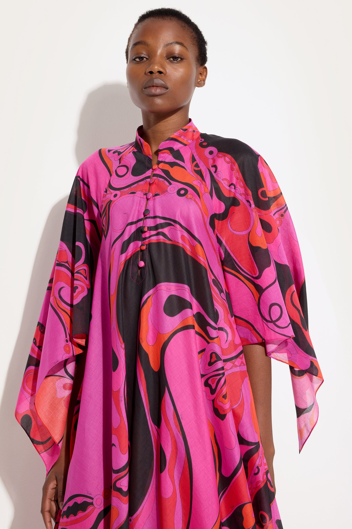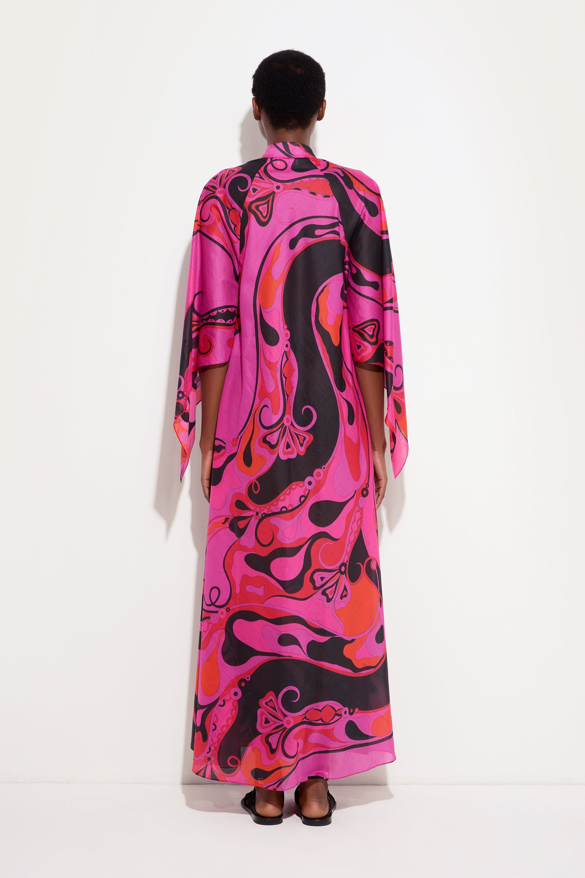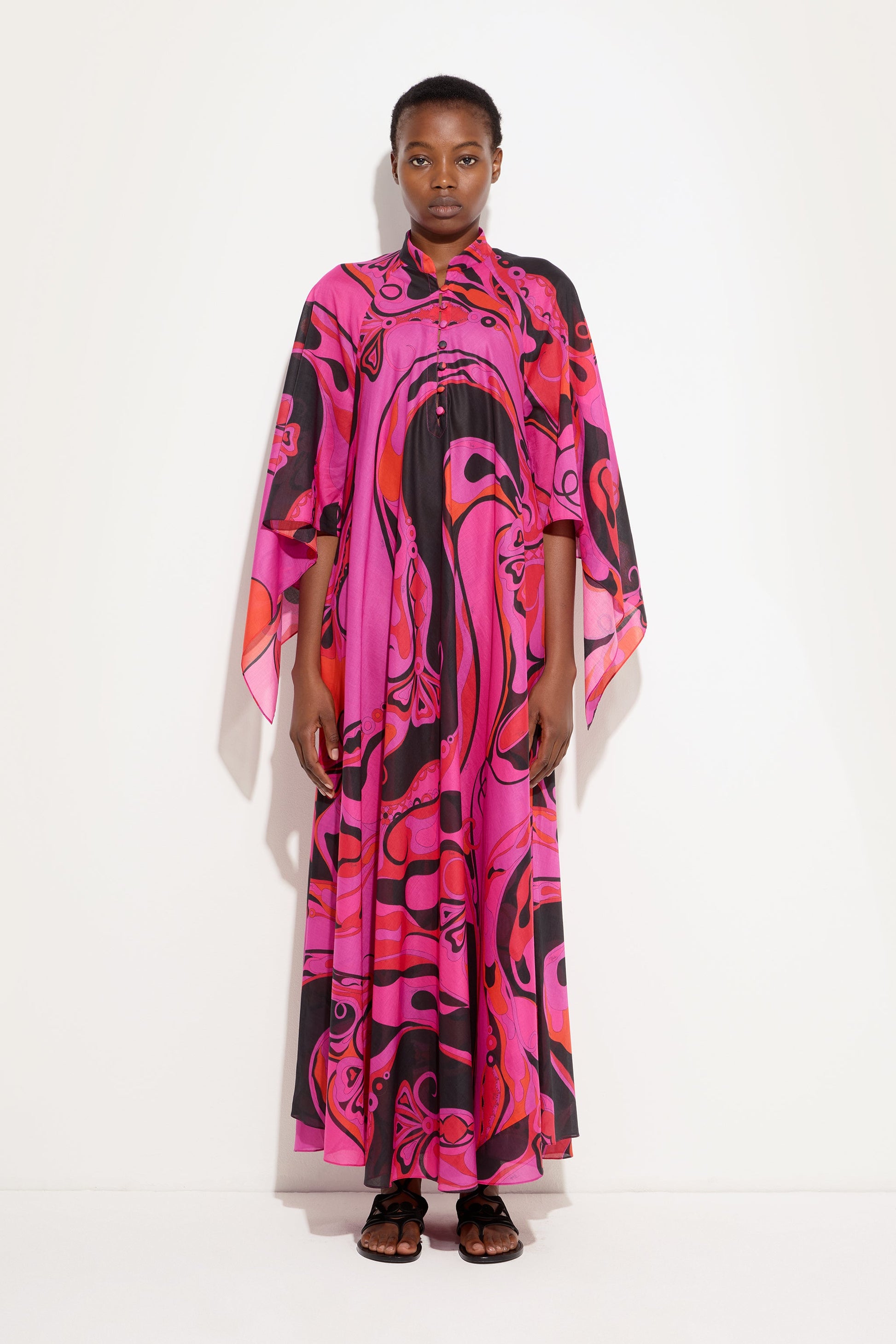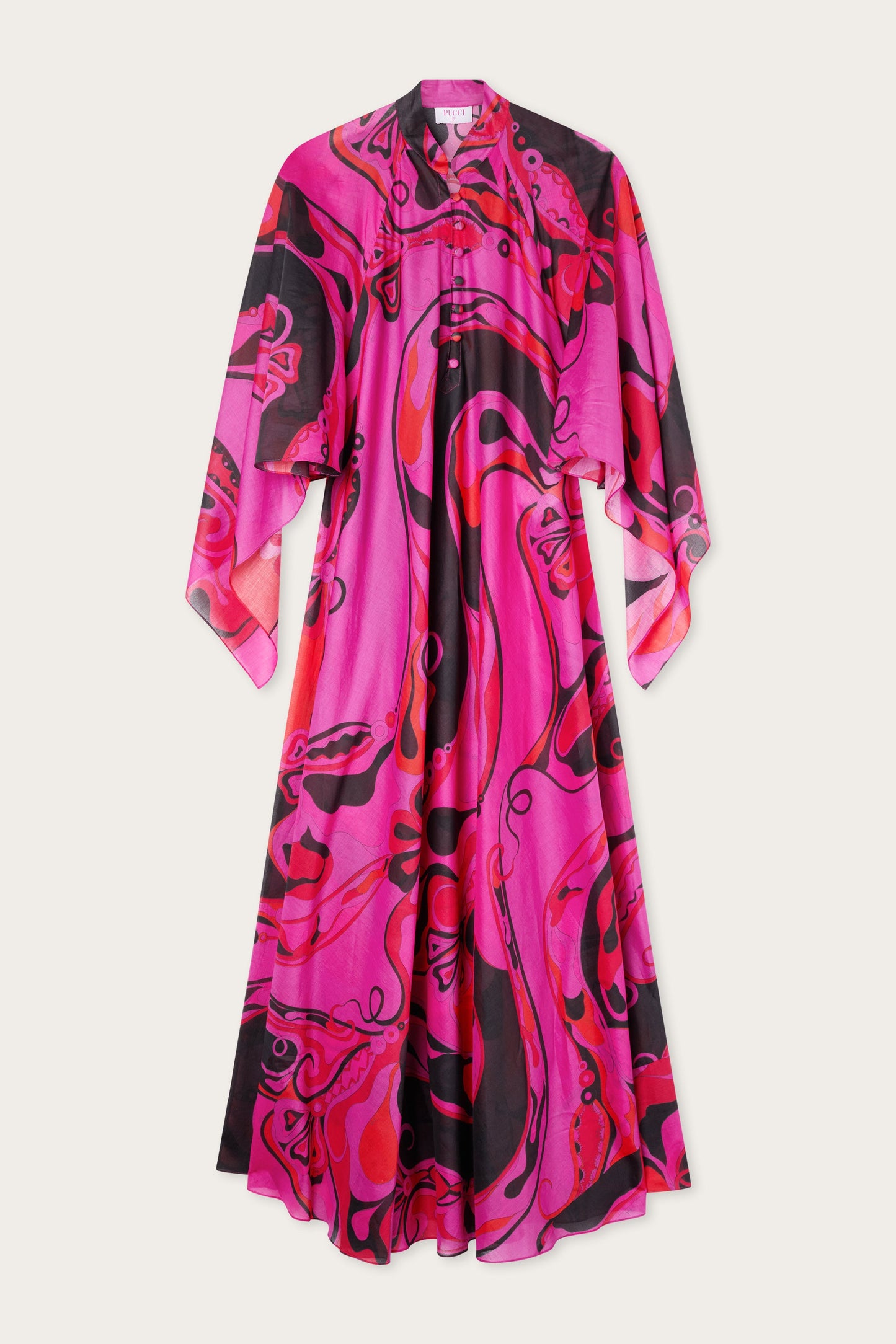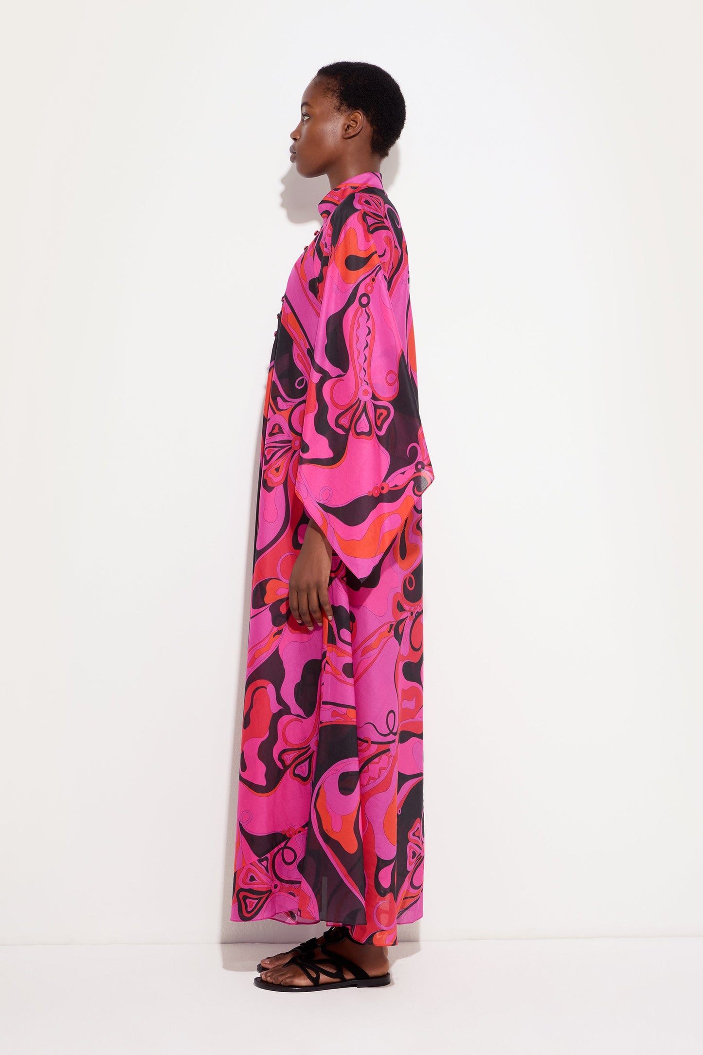 A long, lightweight, and airy kaftan designed to move naturally. The long, soft sleeves amplify the sense of movement, while the V-neckline slims the silhouette with essential elegance. Made from cotton muslin, it is cool and comfortable against the skin. The fuchsia and black Orchidee print adds a vibrant graphic accent, perfect for a sophisticated summer look.