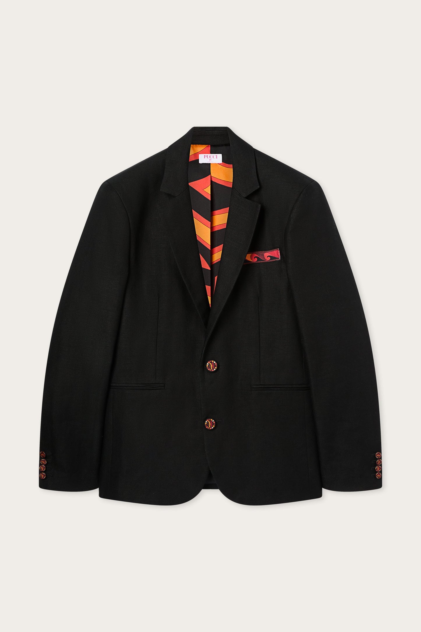 A bold jacket that combines contemporary silhouettes with iconic details. The oversized silhouette is defined by a deep lapel collar, a front button closure, and two patch pockets that reinforce the garment’s tailored aesthetic. Printed details on the collar and pocket edges introduce a refined visual contrast. A balance between structure and aesthetics, designed to reinterpret tailoring with a modern twist.