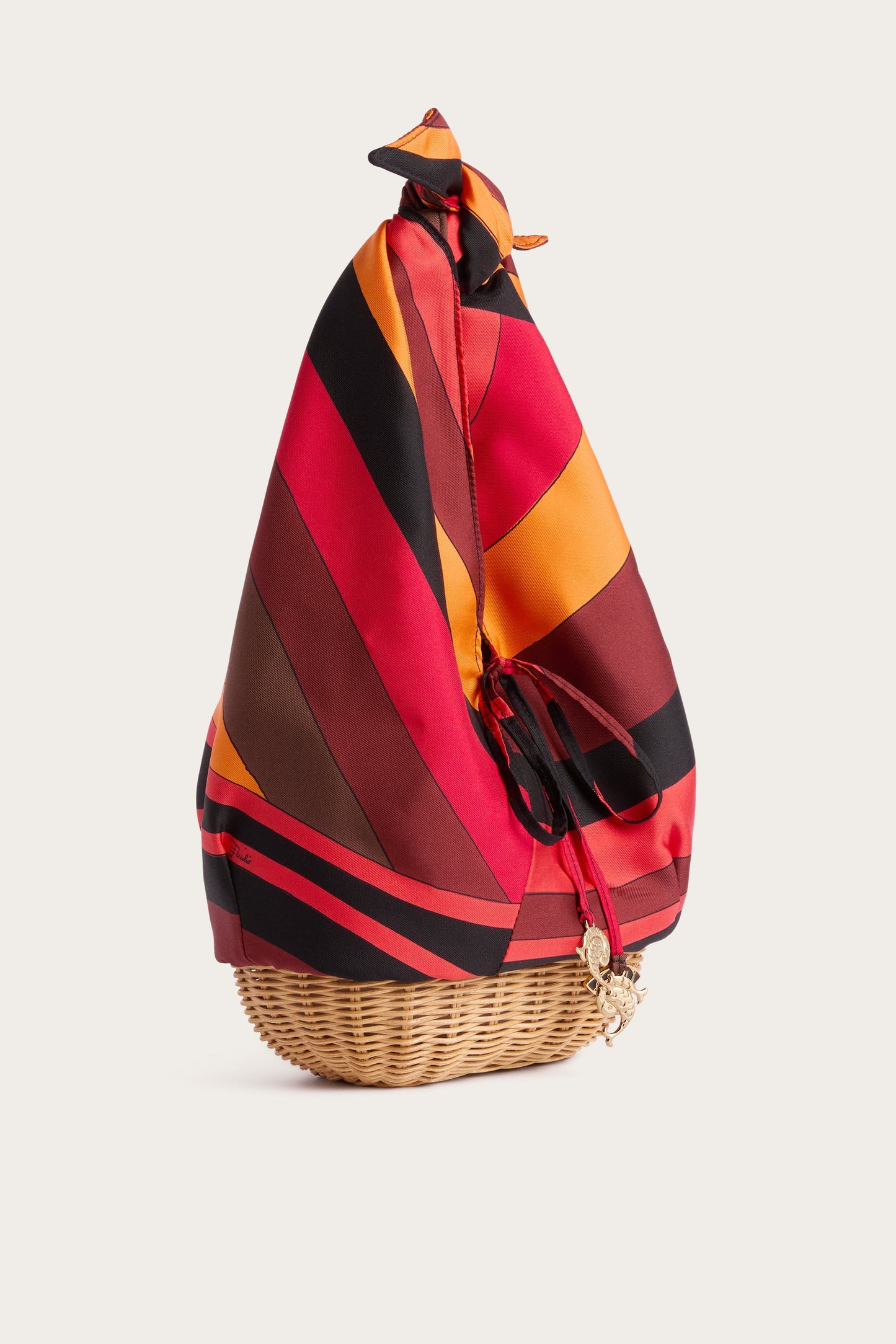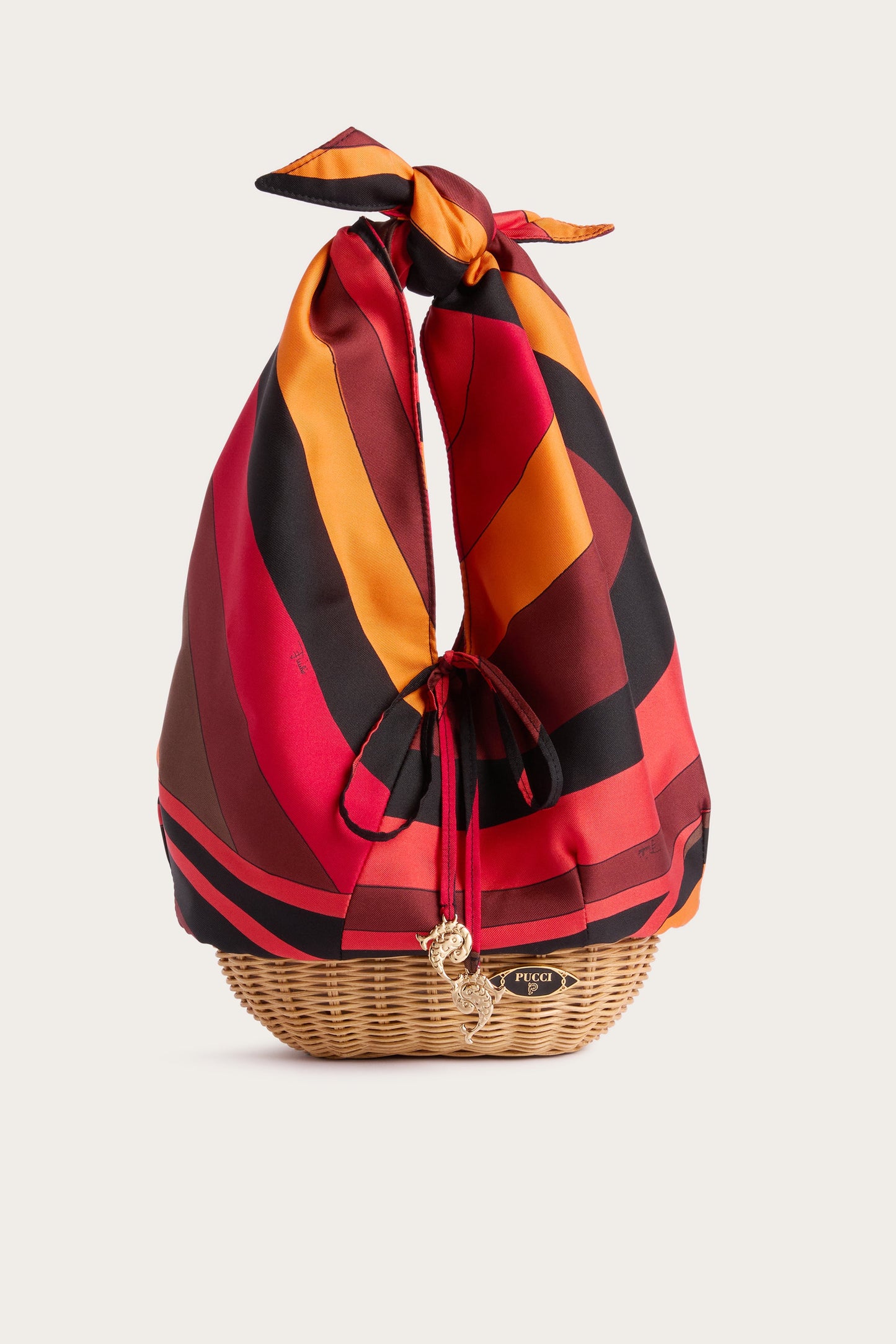A sophisticated bag that combines the lightness of silk with the natural texture of wicker. Made from printed silk twill, it features a bamboo handle that gives the design a summery, contemporary allure. Inside, the nappa leather patch with logo adds a refined detail, while the Pucci enamel plates, the fish-shaped one and the metal spiral ring complete the model with iconic accents. The Iride print in shades of orange and black makes the look intense and vibrant, emphasized by the palladium galvanic finish.