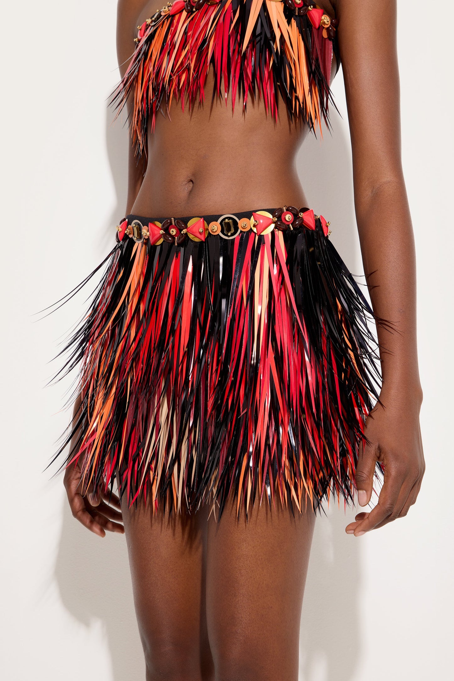 A dramatic skirt with a strong couture impact, where embroidery takes center stage. The pointed motif reinterprets the Marmo print through sequins unique in shape and color, applied individually by hand. The result is a rich and airy effect, amplified by the movement of the sequins and their extraordinary lightness. The three-dimensional hem decisively defines the silhouette of the garment, while the jeweled belt completes the design with a precious and distinctive accent.