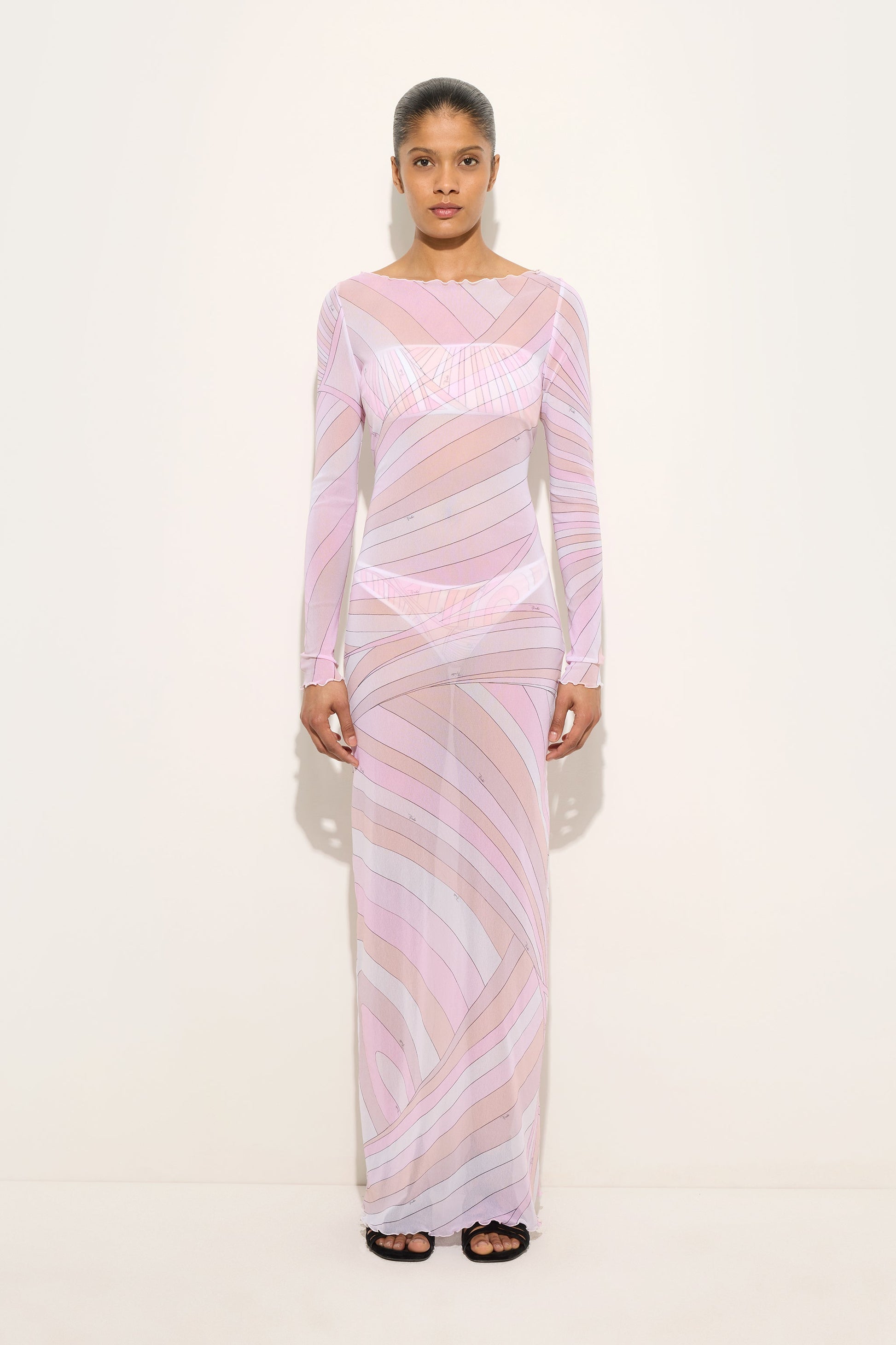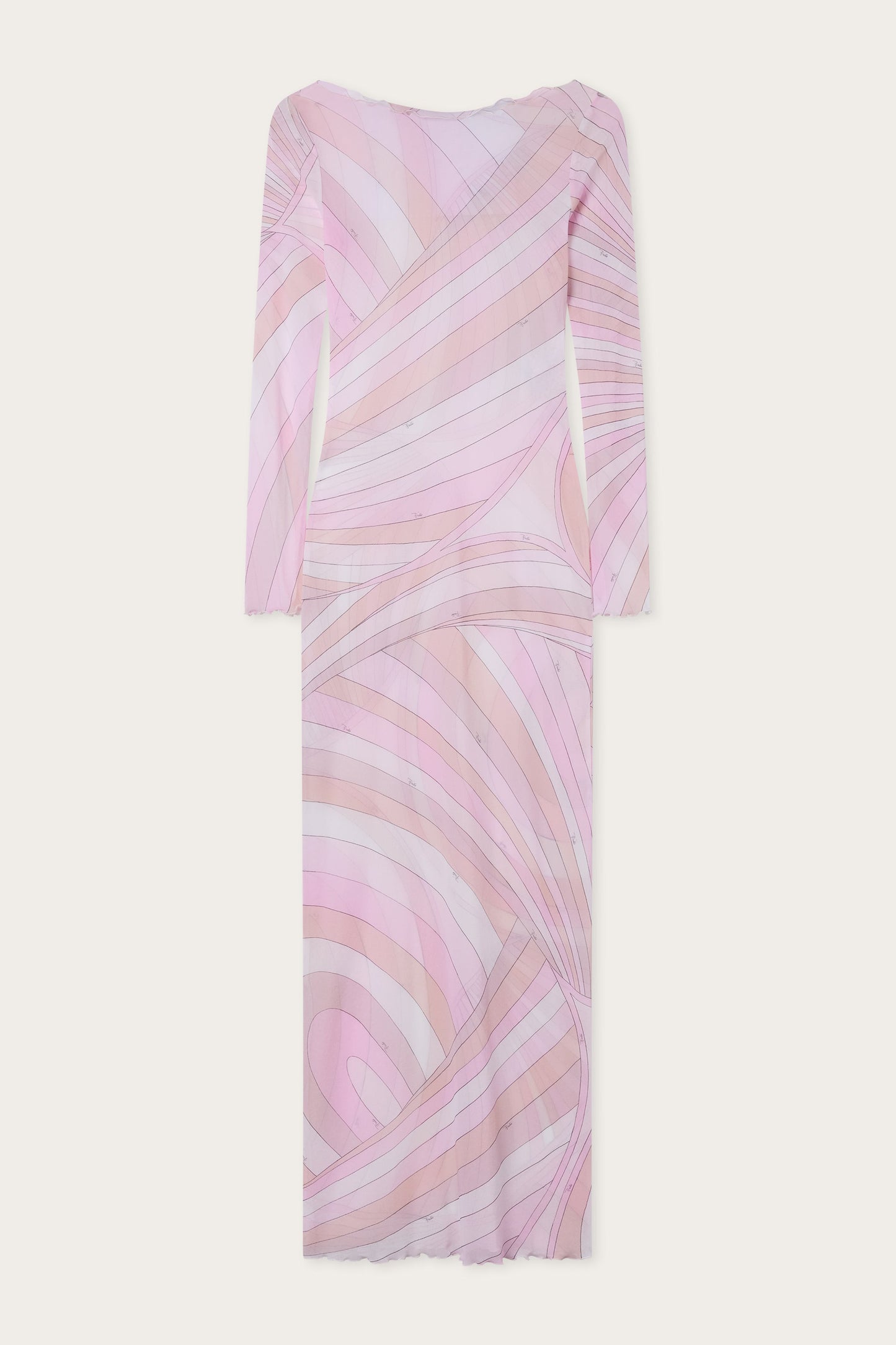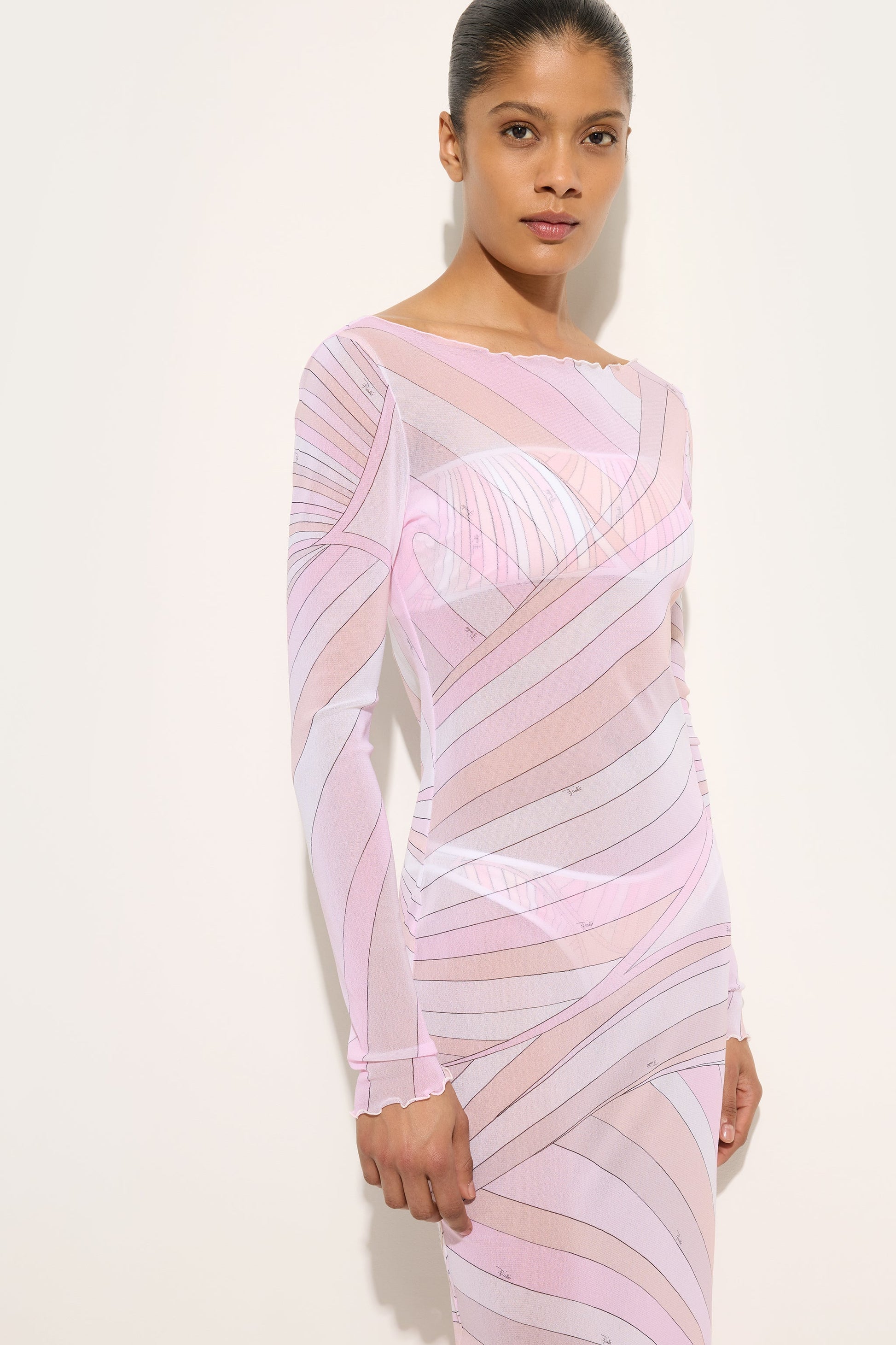 A fitted tulle dress featuring long sleeves and a boat neckline. The Iride print in shades of pink and nude adds a delicate, luminous graphic accent. The lightweight, stretch tulle creates a second-skin effect, hugging the body with comfort and natural ease.
