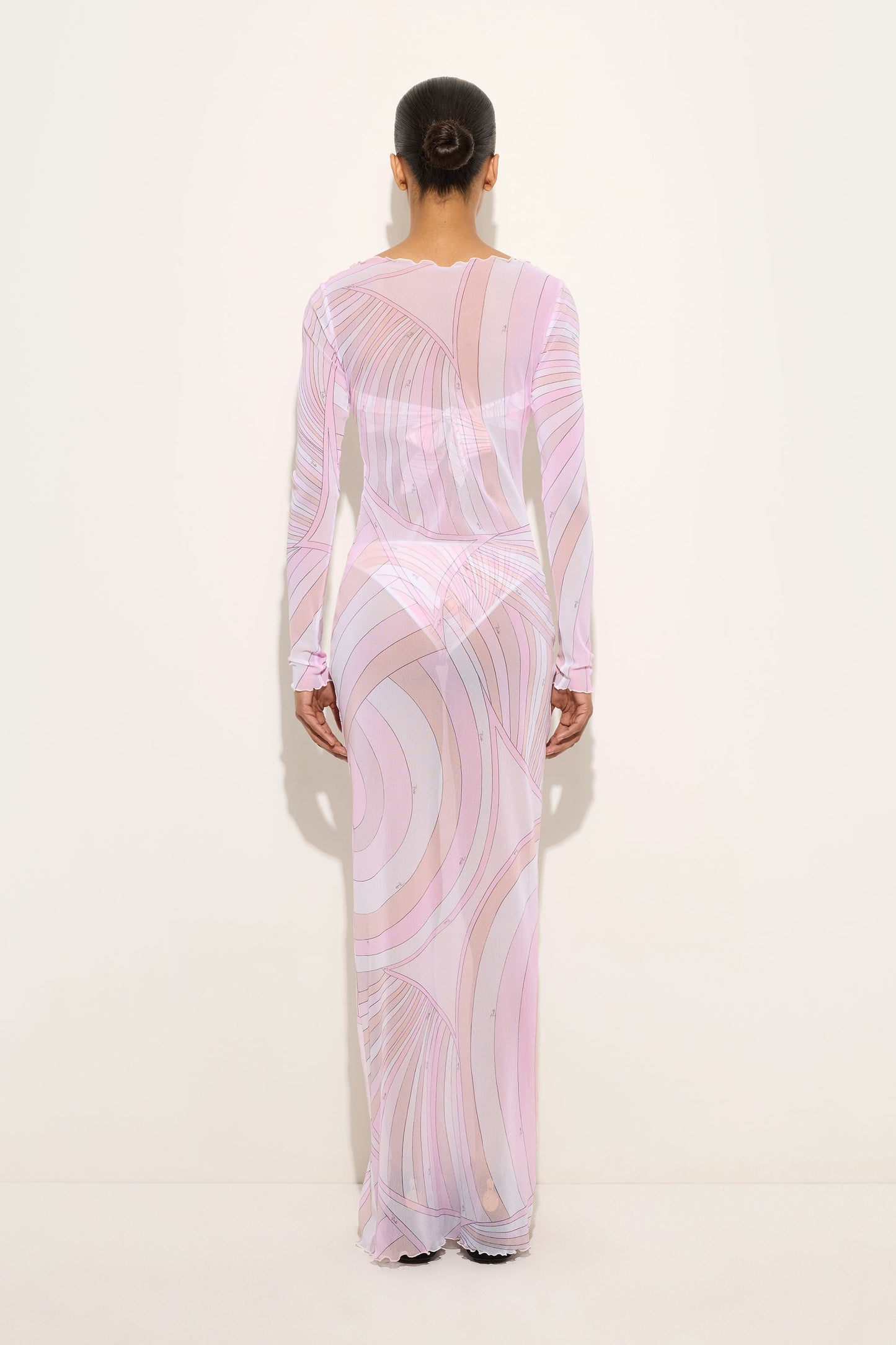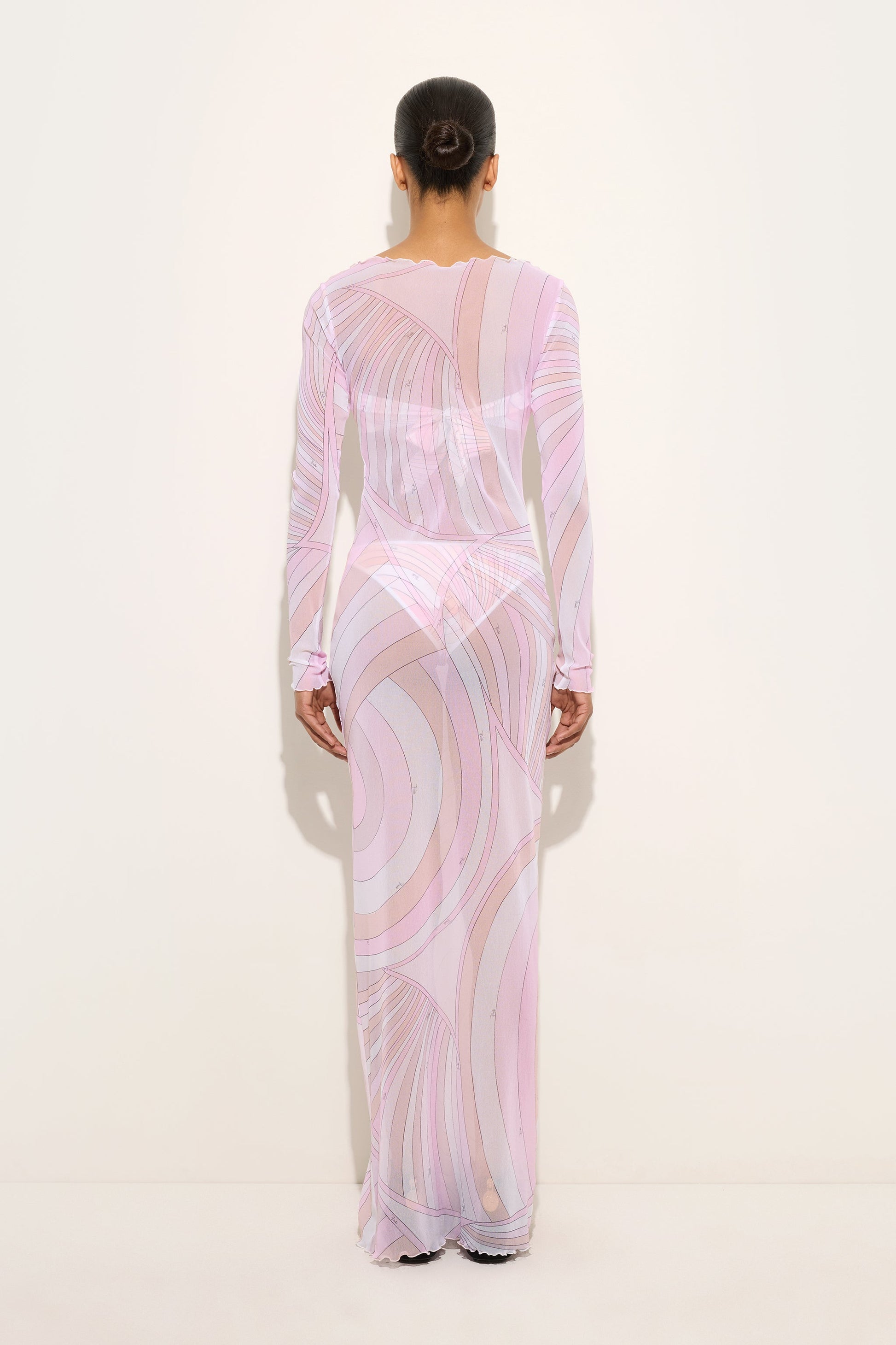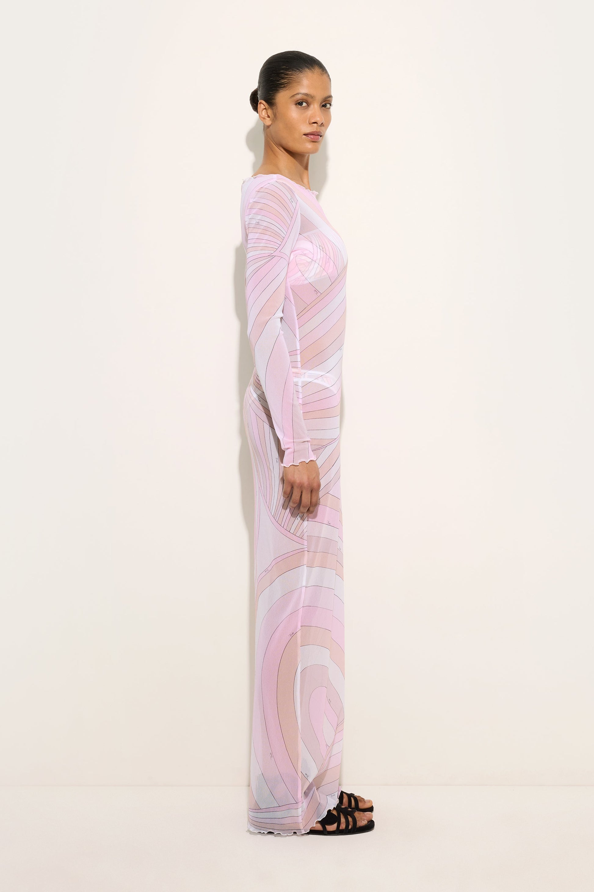 A fitted tulle dress featuring long sleeves and a boat neckline. The Iride print in shades of pink and nude adds a delicate, luminous graphic accent. The lightweight, stretch tulle creates a second-skin effect, hugging the body with comfort and natural ease.