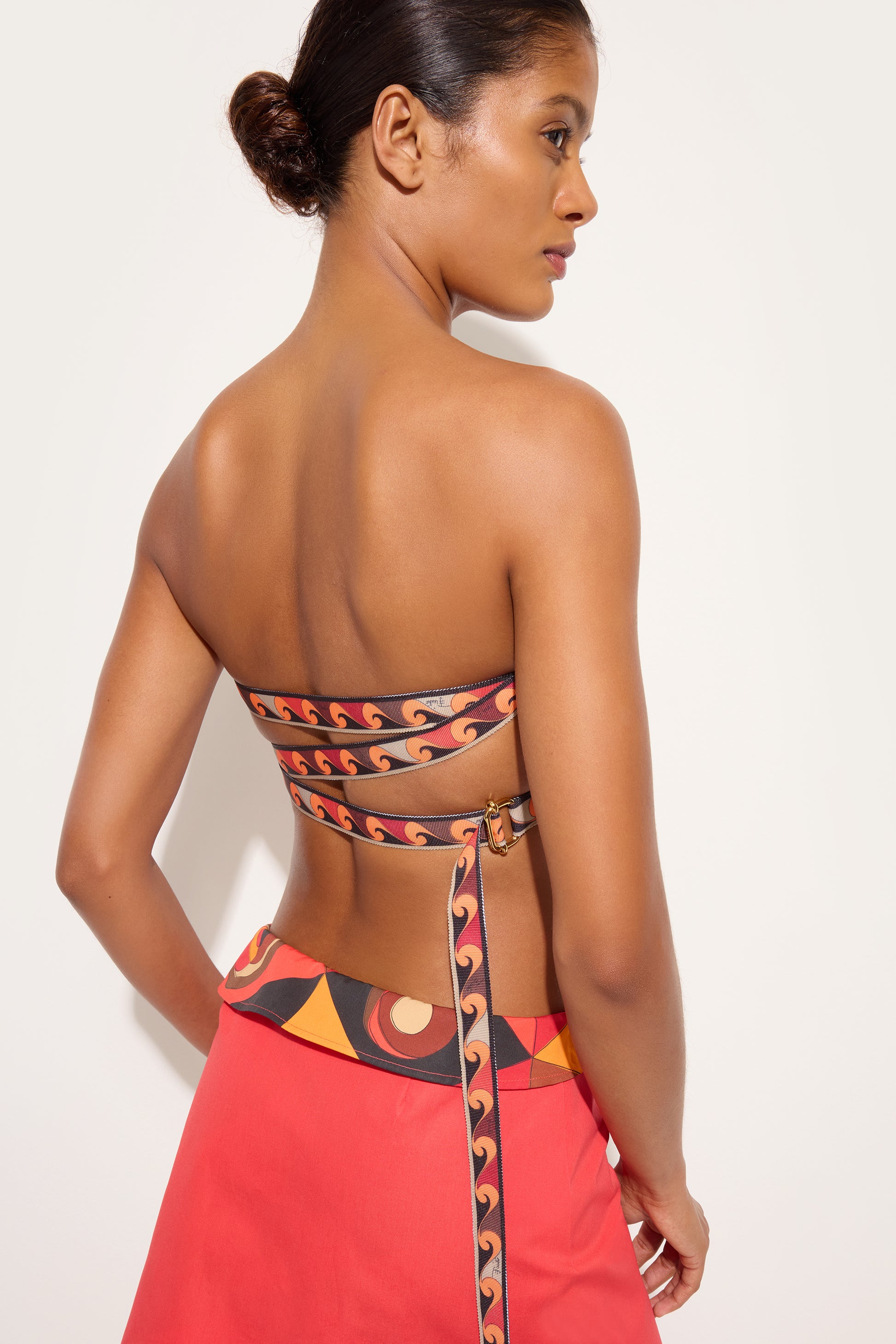 A bandeau top with a contemporary feel, designed to enhance the silhouette with clean lines. Crafted from cotton toile, it is defined by grosgrain ties at the back with a logoed metal buckle that adds a distinctive and functional accent. The orange and black Kwango print introduces a bold contrast, perfect for completing summer looks with a strong visual impact.