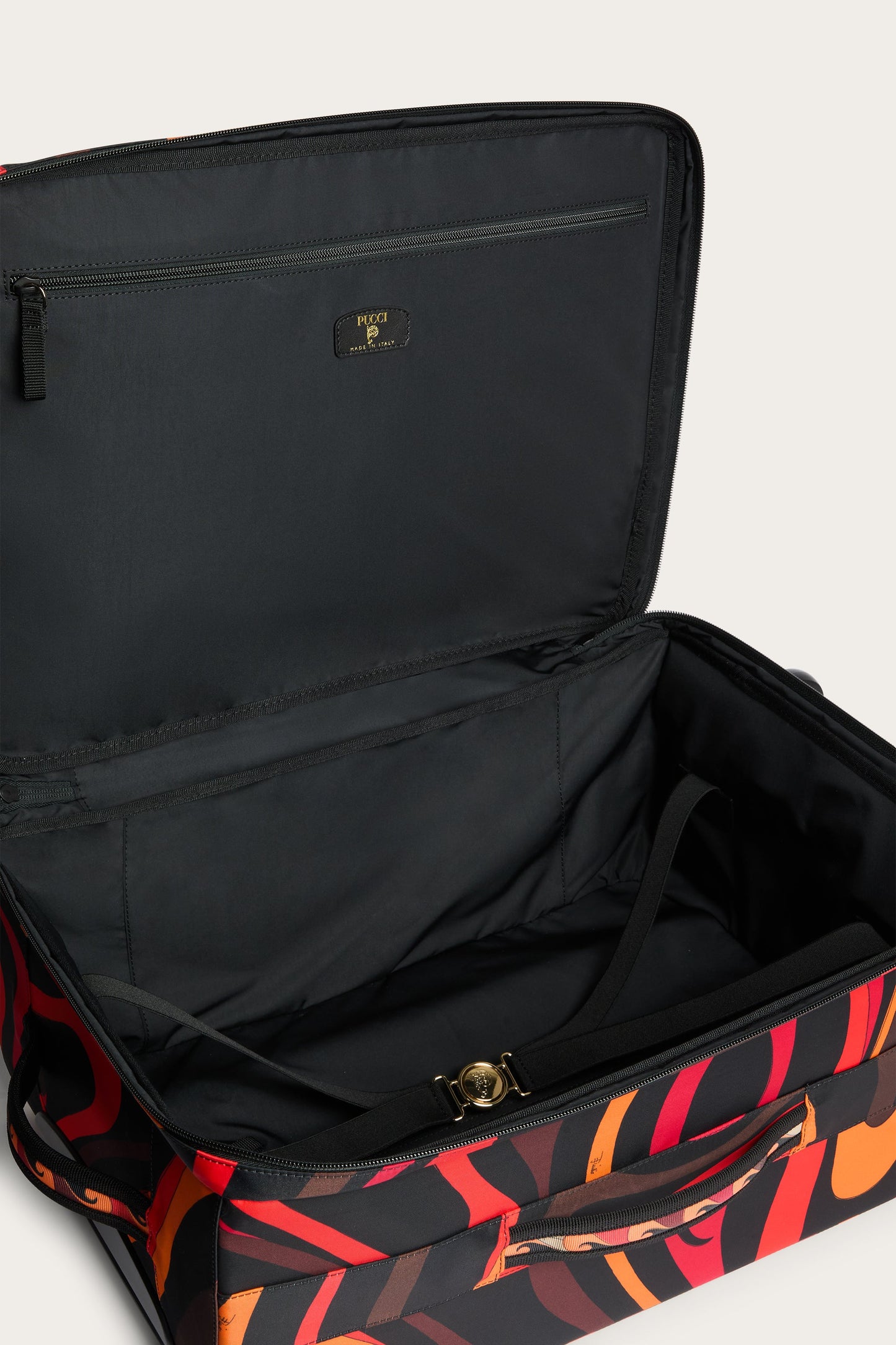 A bold travel accessory where functionality and sophistication meet. This nylon cabin trolley is defined by its orange and black Marmo pattern. The structure is completed by a solid black nylon lining and a practical front pocket designed for a laptop. Inside, a flat zippered pocket allows you to organize your essentials neatly and conveniently. Iconic Pucci details, from the black enamel logo tag to the fish-shaped pull tab, are enhanced by yellow gold-finish metal accessories for a distinctive touch even when traveling.
