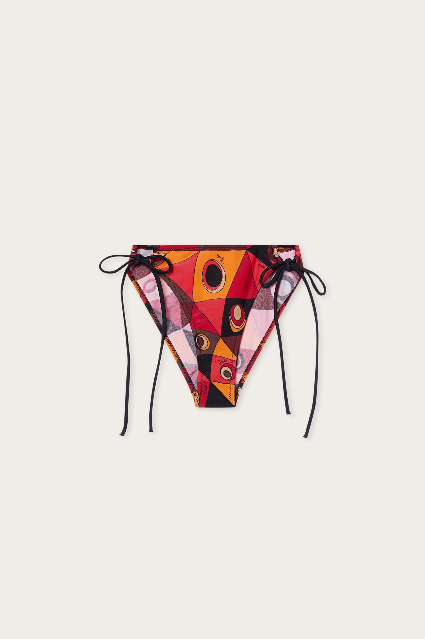 A bikini bottom with a simple, lightweight design that elegantly enhances the Occhi print. The low waist and thin adjustable side ties allow for a natural fit that flows with the body. The orange and black Occhi print covers the surface with a soft and refined luminosity, while the stretch Lycra, combined with the inner lining, ensures comfort and support. A model designed to complete the bikini with balance and femininity.