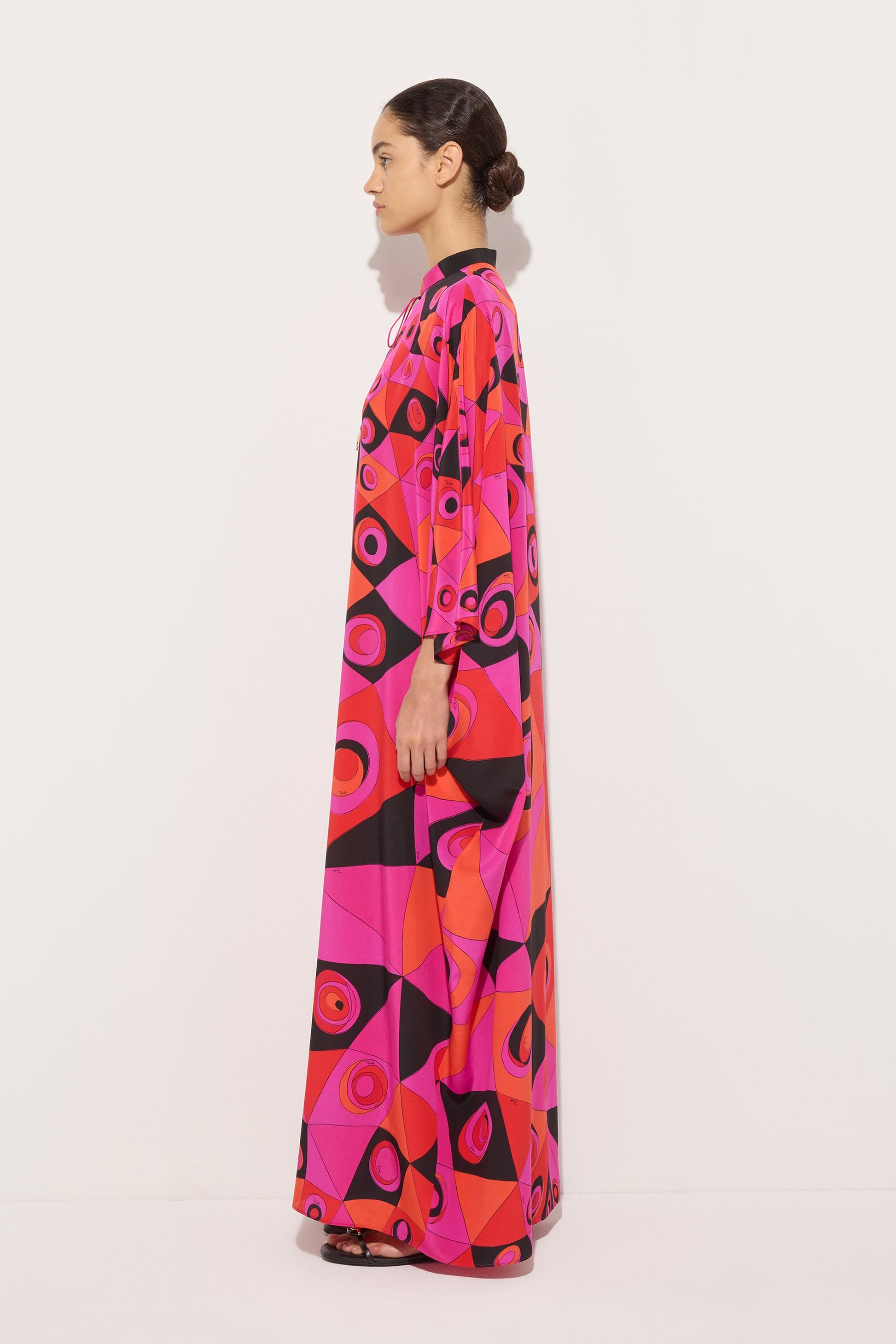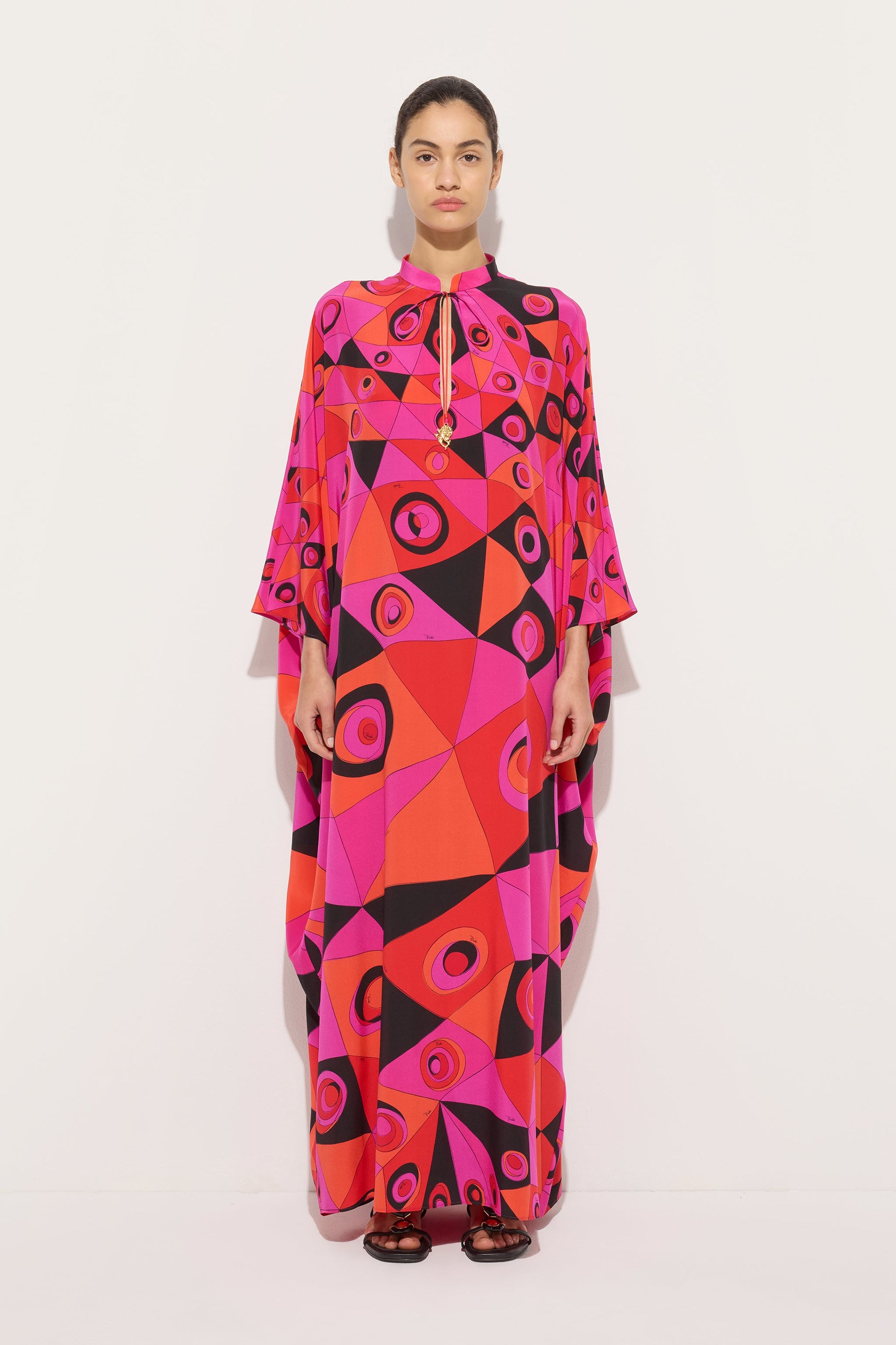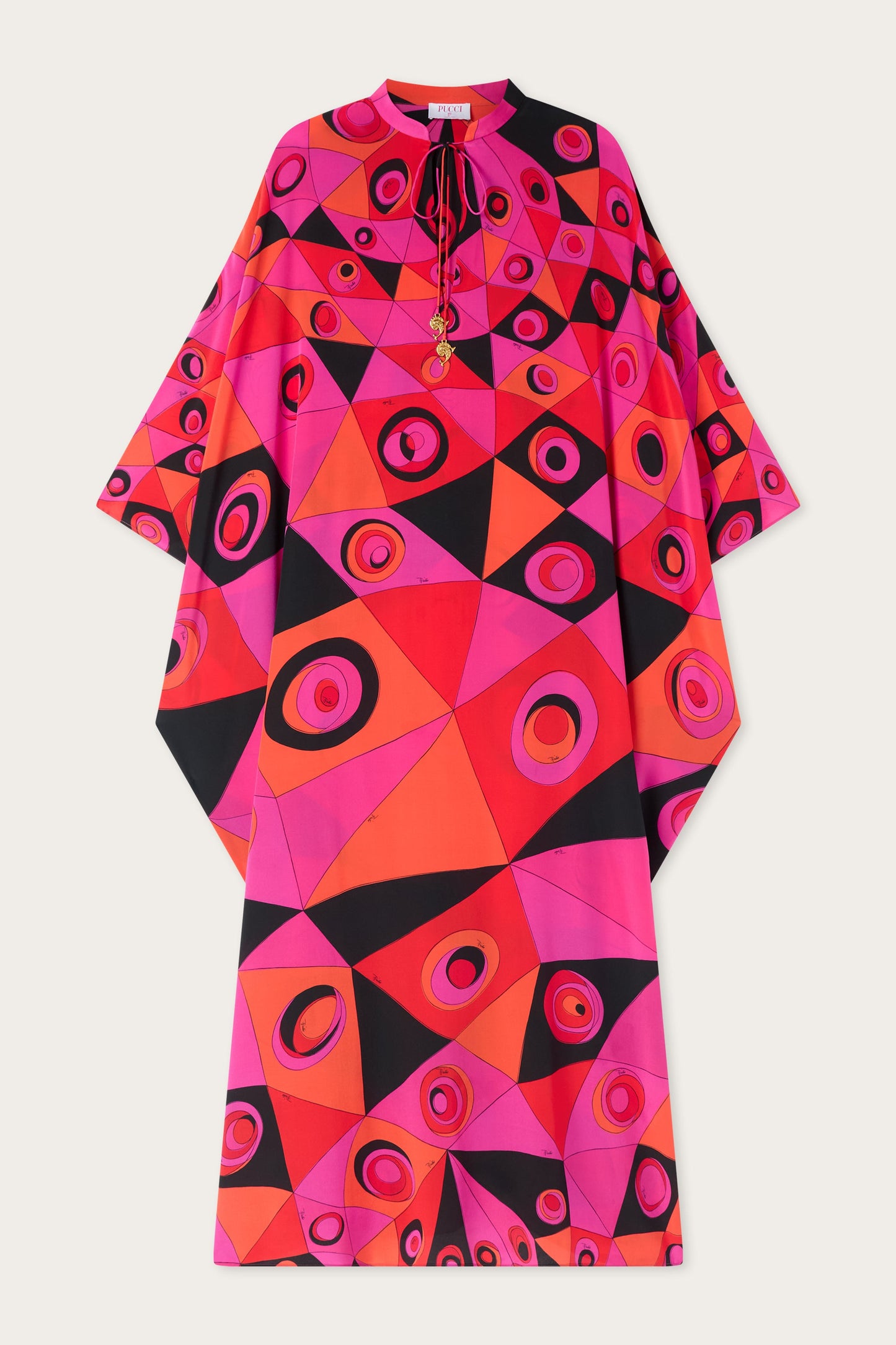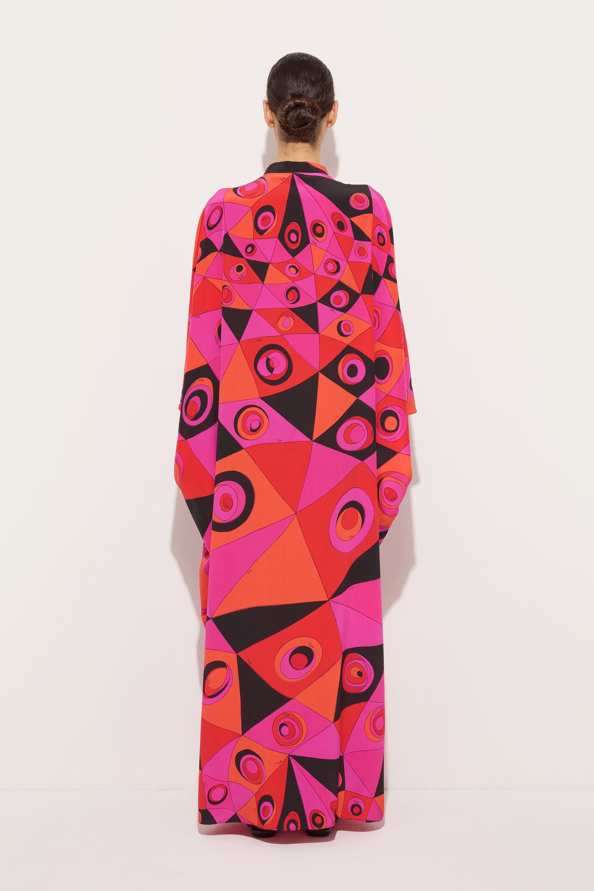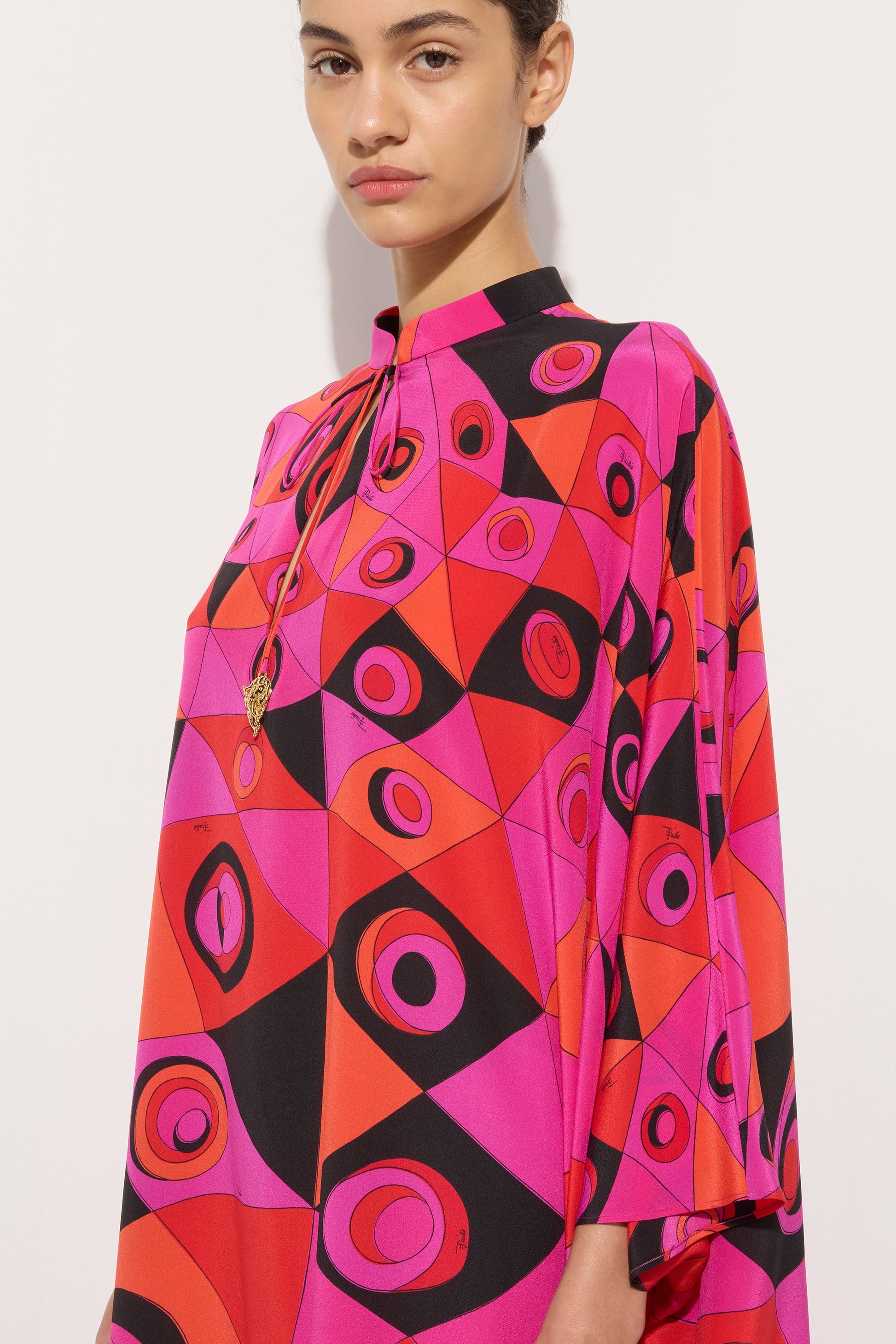 A flowing, enveloping kaftan that interprets Occhi print with lightness and brightness. Made from silk twill, it has a loose fit and long sleeves that move naturally with the body. The neck ties add a delicate and adjustable detail, while the fuchsia and black print runs across the garment with a soft and airy brightness. A refined balance between comfort, movement, and iconic graphics.
