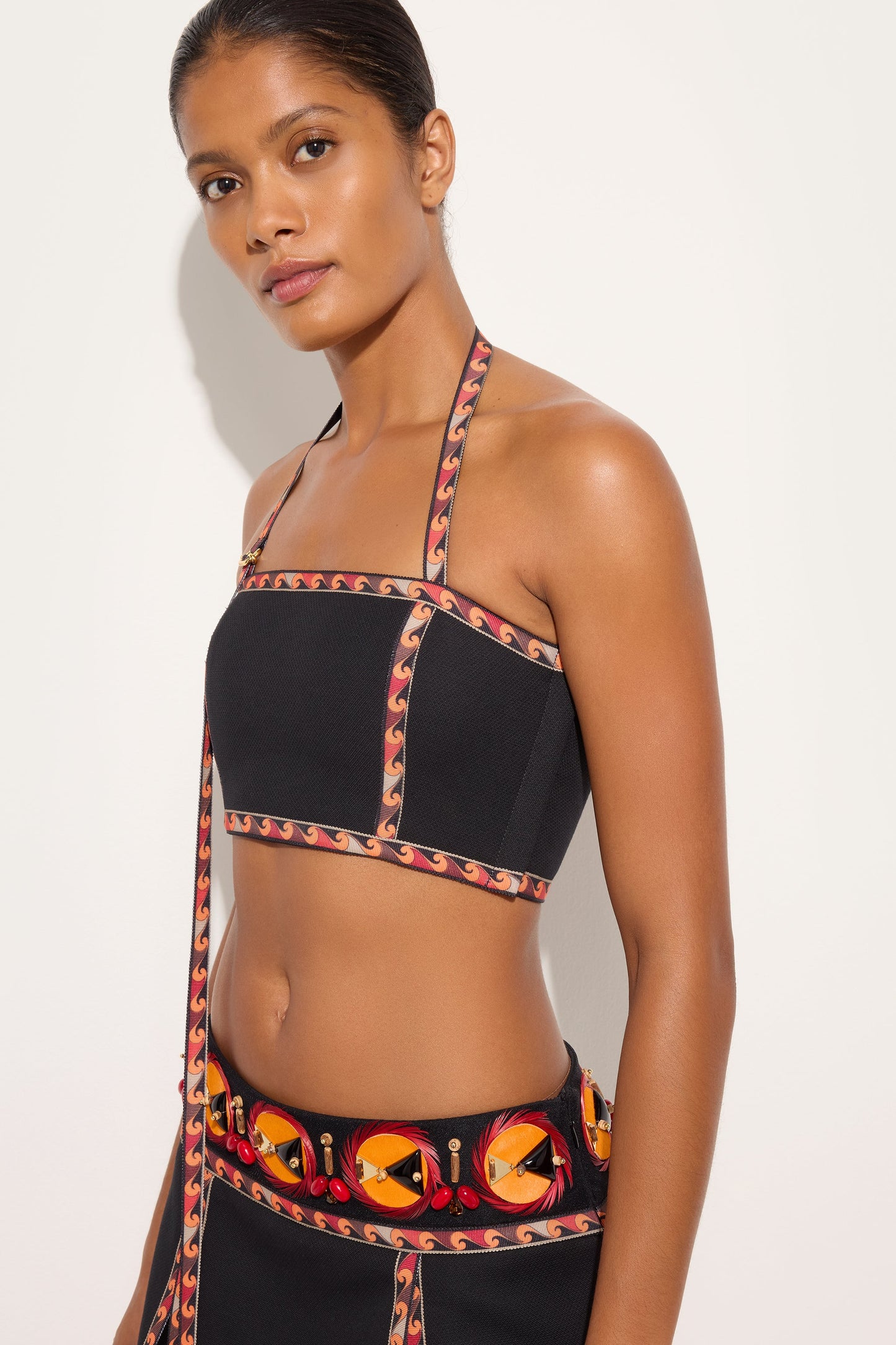 An essential top with a clean, contemporary look, constructed with clean lines and balanced proportions. The texture of the piqué cotton gives structure to the design, while the printed grosgrain straps add a distinctive detail. Versatile and refined, it is designed to complete modern looks with a discreet but always recognizable Pucci touch.