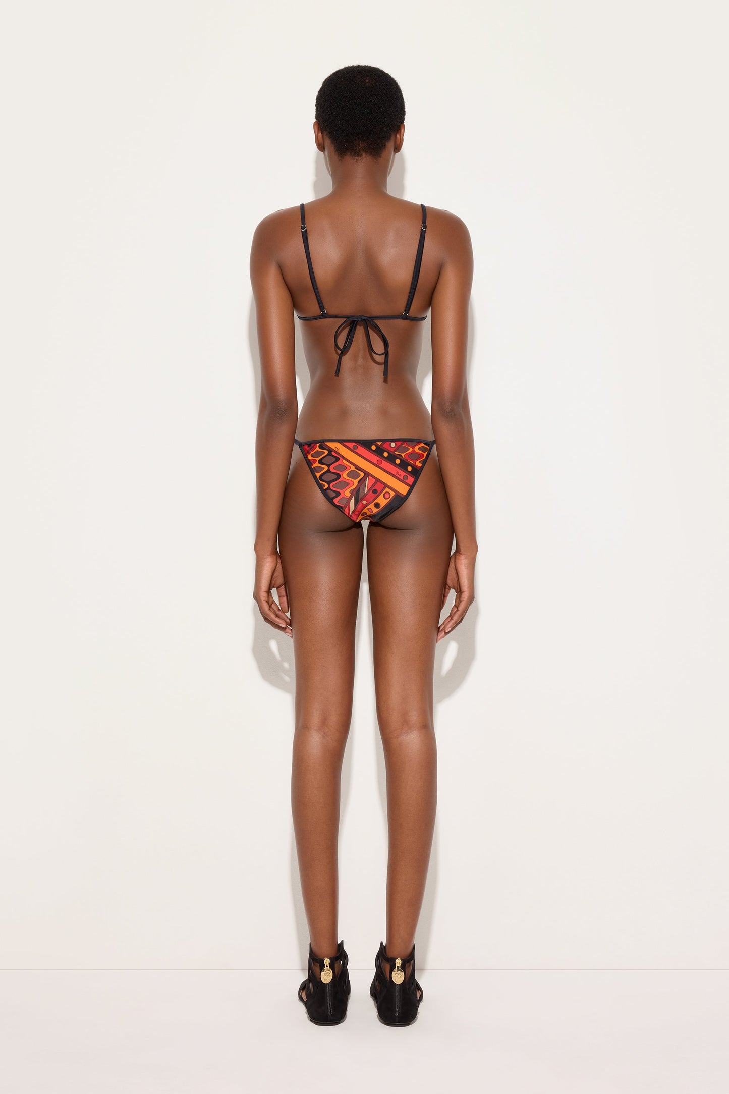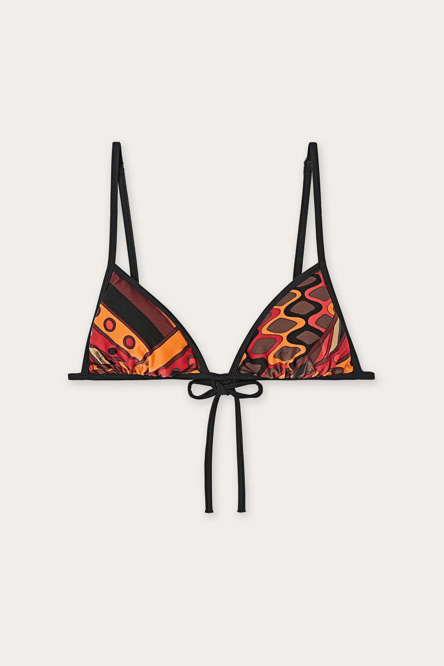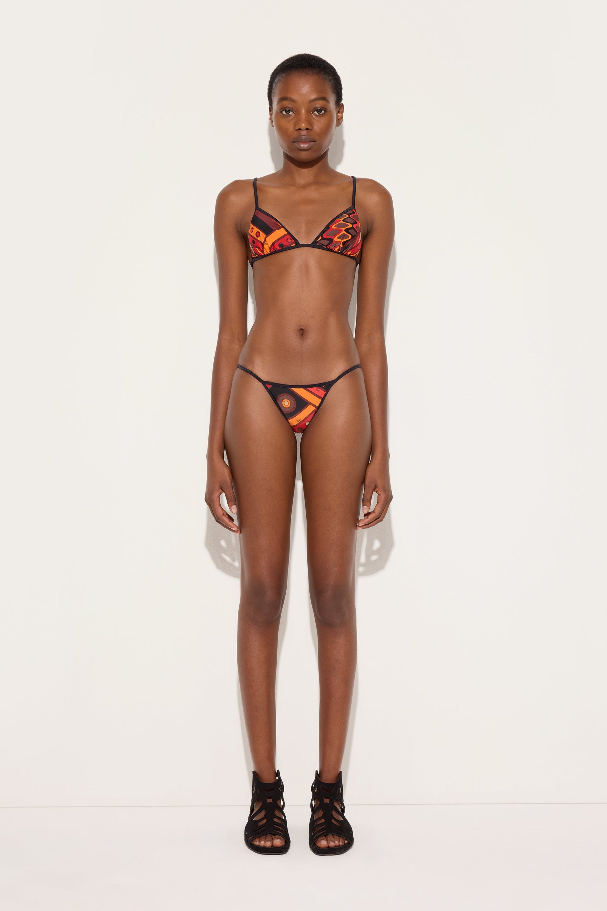 A triangle bikini top with a simple, feminine silhouette, enlivened by the graphic energy of the orange and black Vivara print. The thin, adjustable straps at the back allow you to customize the fit, offering comfort and support with a light, contemporary look. Made from Lycra and finished with an inner lining, this is an iconic and versatile style, perfect for pairing with matching briefs for a bold beachwear look.