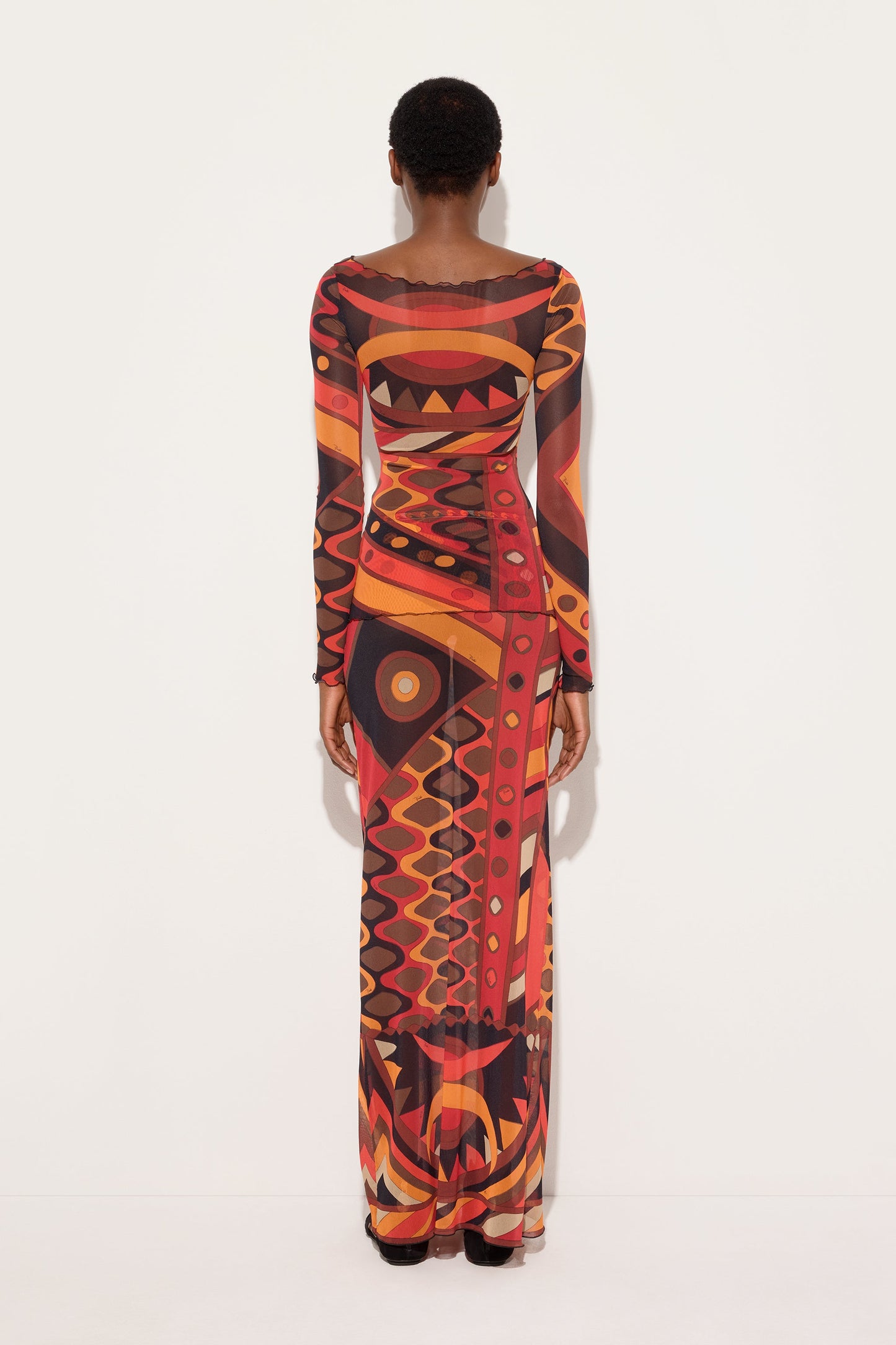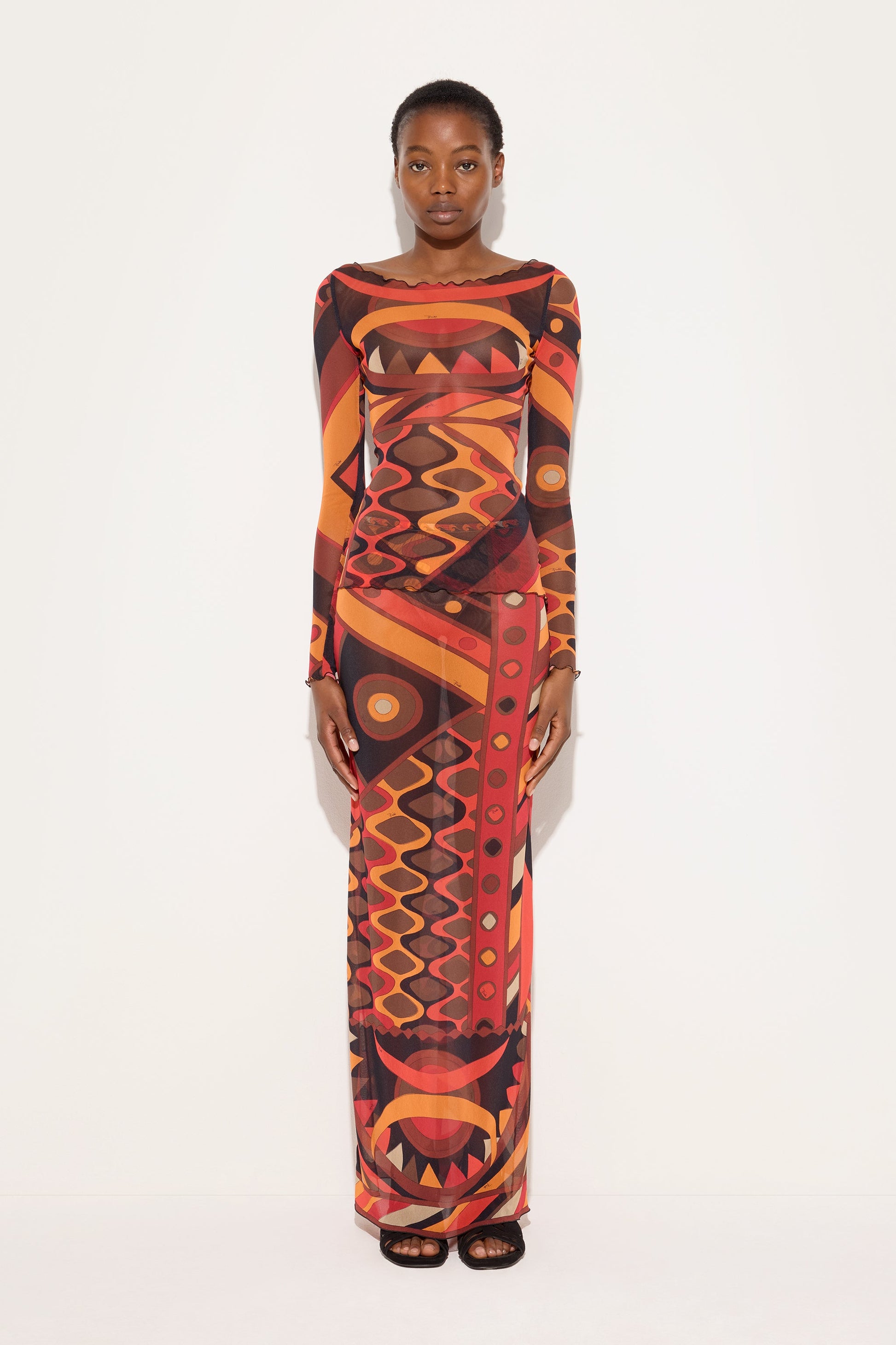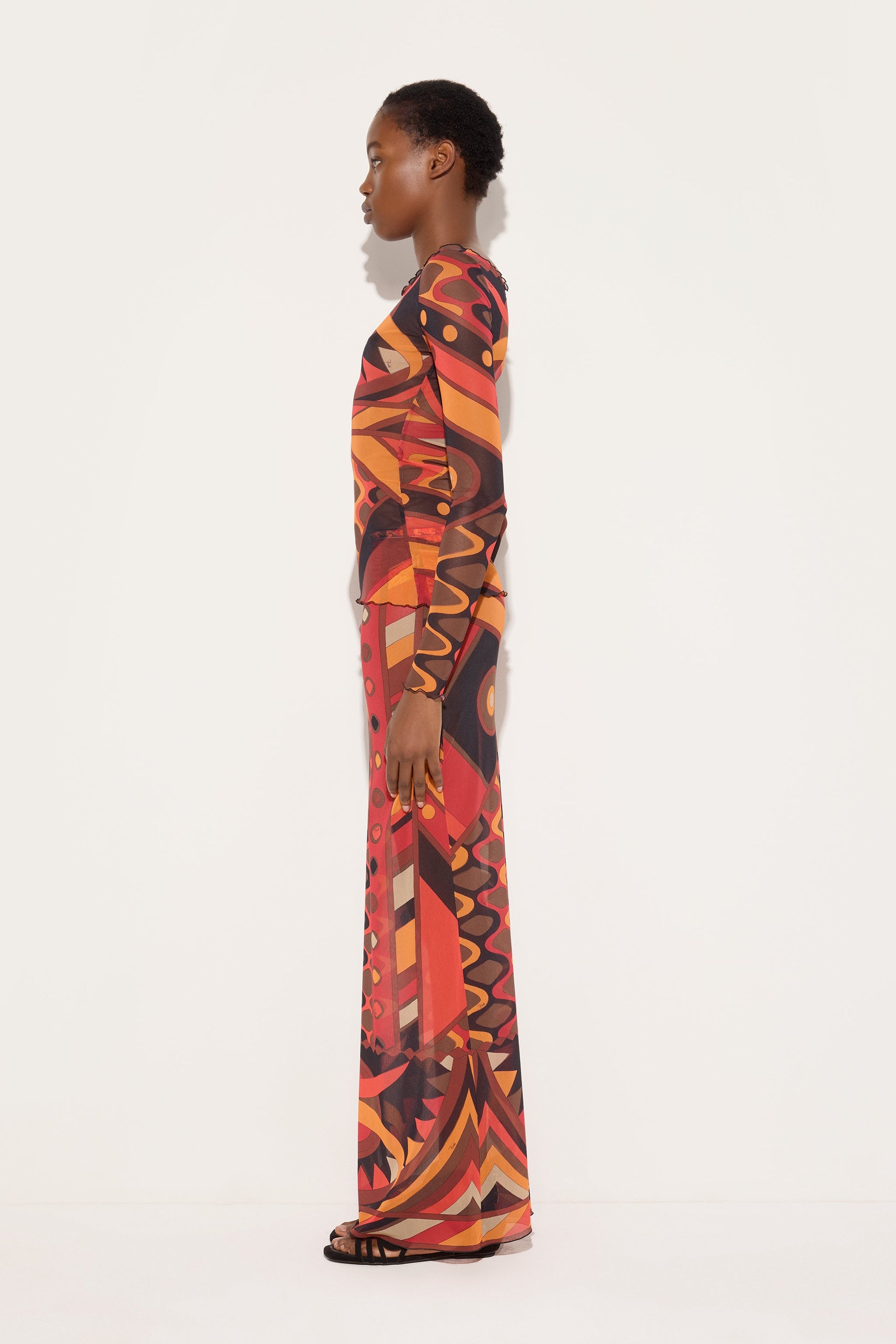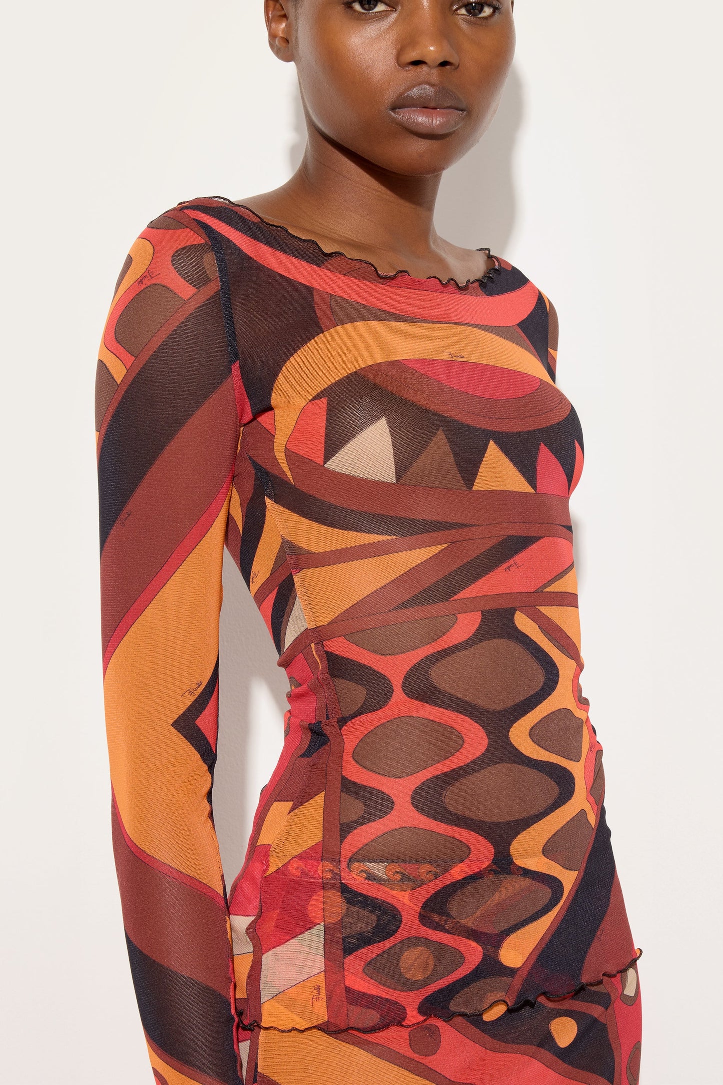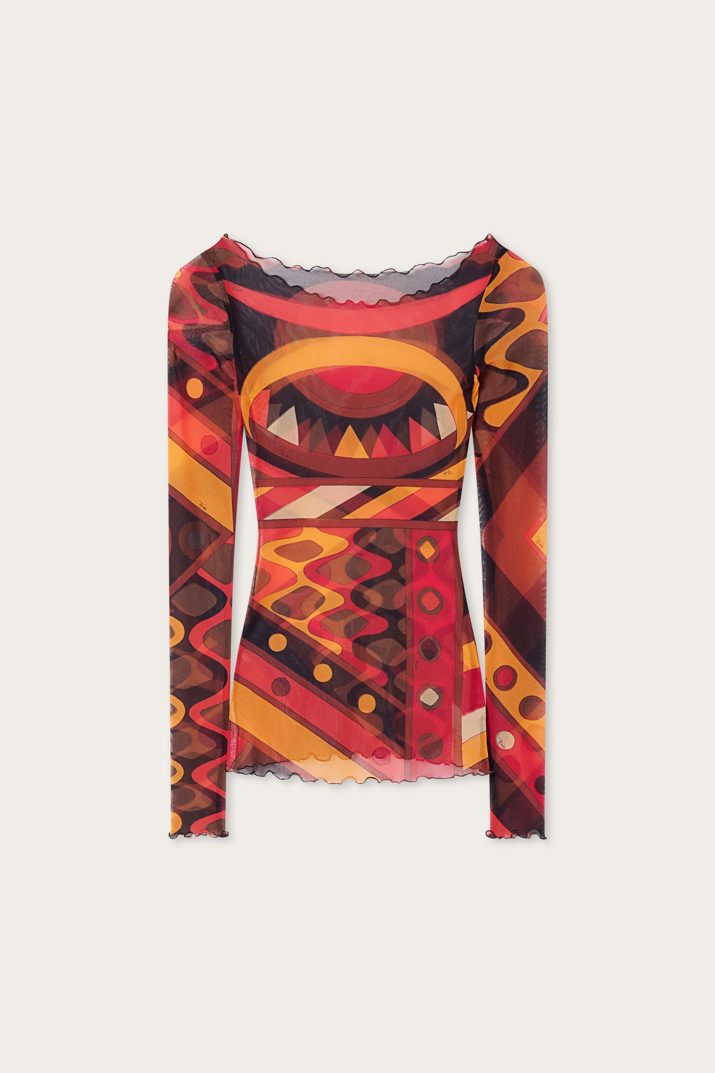 A light and sensual top that plays with transparency. The fitted silhouette is defined by a boat neckline that elegantly enhances the shoulders, while the long tulle sleeves accompany movement with an airy and refined effect. The Vivara print in shades of orange and black flows across the surface, creating a continuous dialogue between light, color, and body. A garment designed for layering or as the centerpiece of an outfit, where lightness and character coexist in balance.