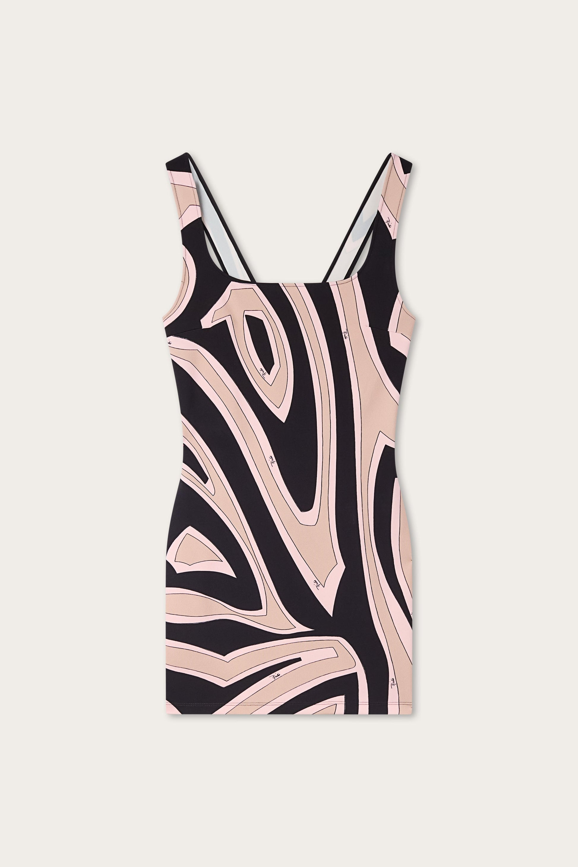 A minimalist, graphic dress that highlights the purity of its lines. The design features a square neckline and thin straps, with a straight cut that naturally accompanies the silhouette. The Labirinto print, in delicate nude tones, adorns the surface with a refined, contemporary rhythm. The stretch viscose fabric ensures comfort and fluidity, making the garment ideal for effortless elegance.