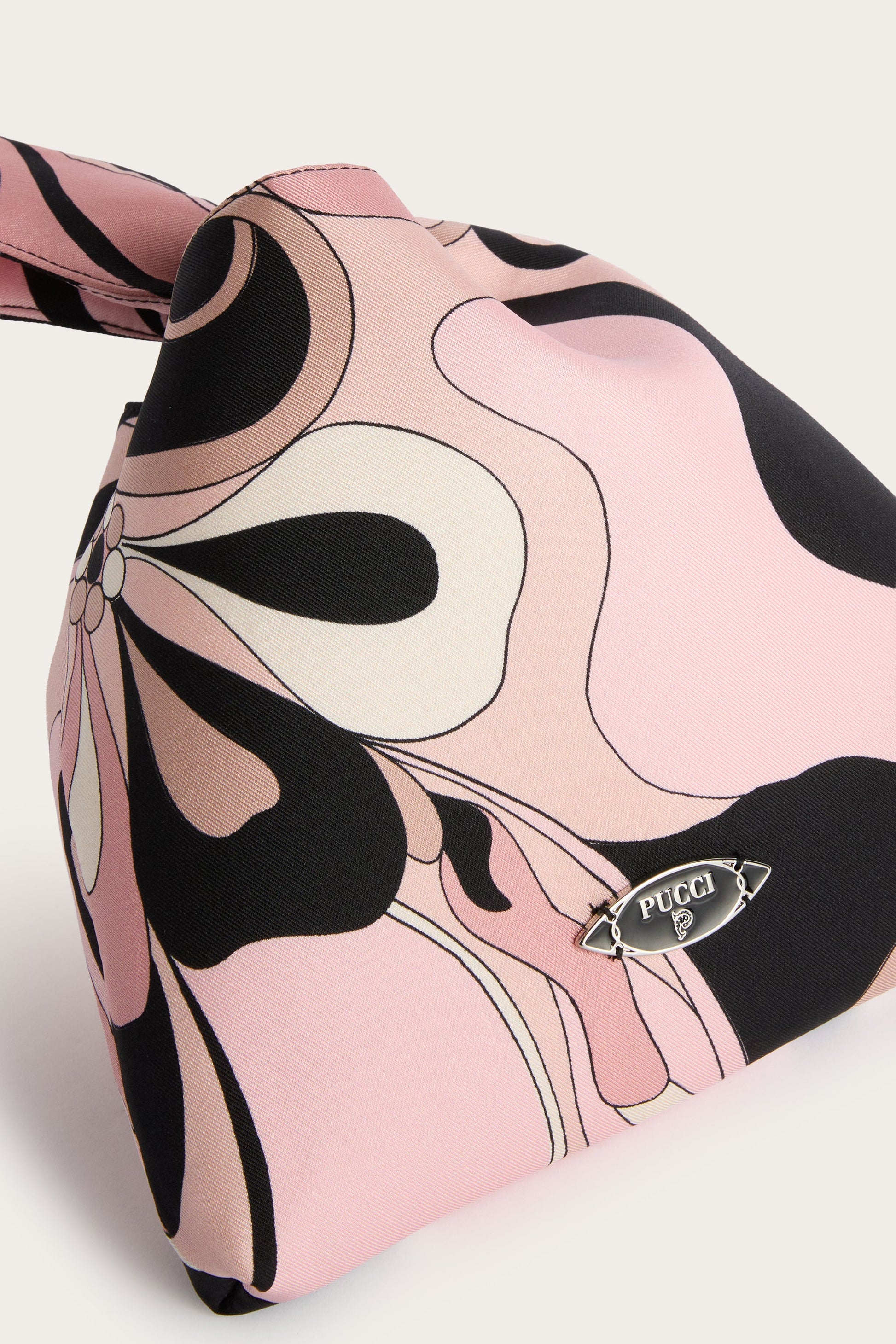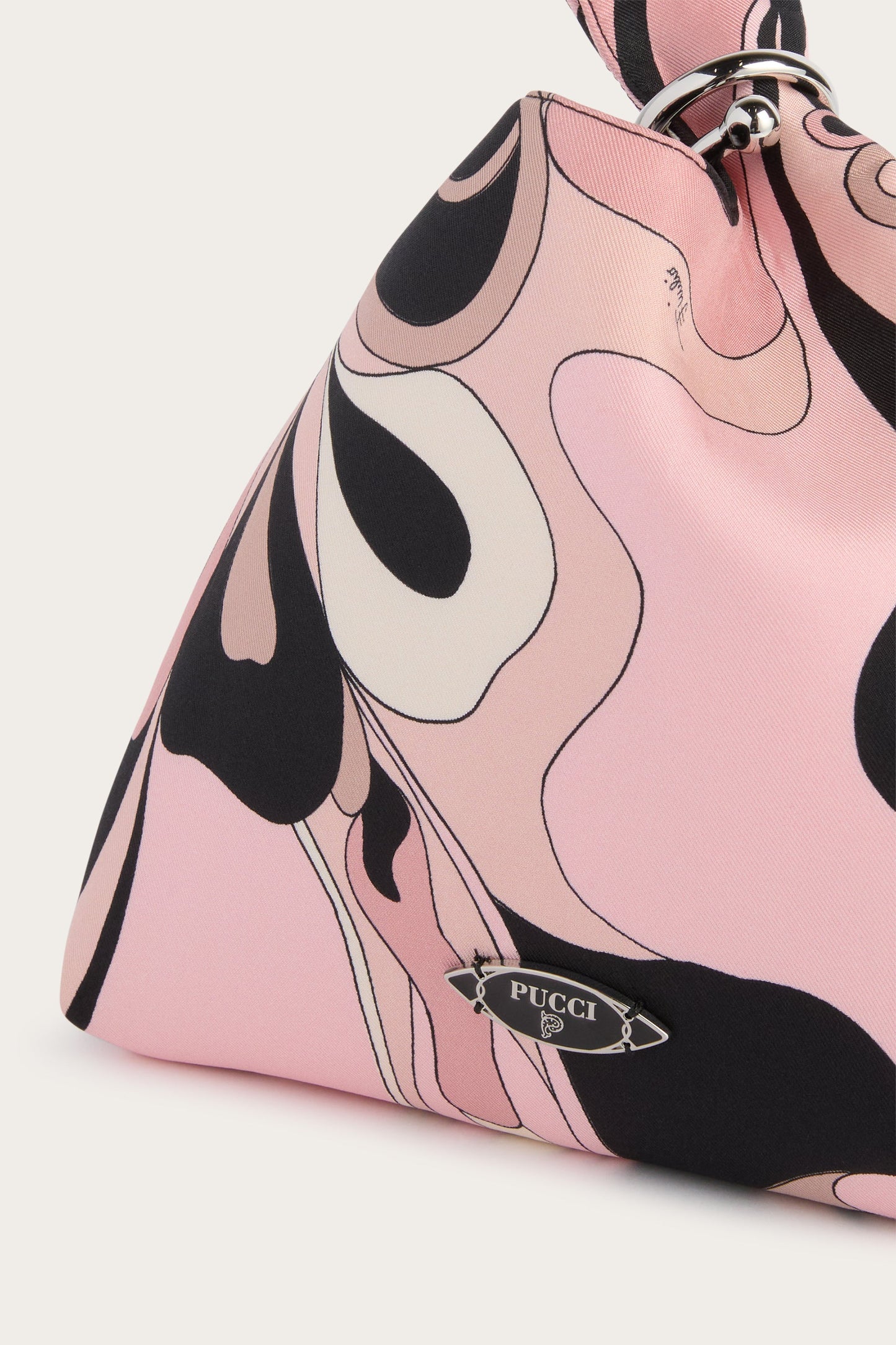 This bag combines graphic elegance with refined detailing. Crafted from printed silk twill, the Emilio Bag features a compact, structured silhouette designed to be carried by hand. The opening is defined by a distinctive metal detail, transforming a functional element into a refined design feature. Metallic accents add a luminous touch, enhanced by a palladium galvanic finish. The nude Orchidee print covers the surface with a delicate and timeless elegance.