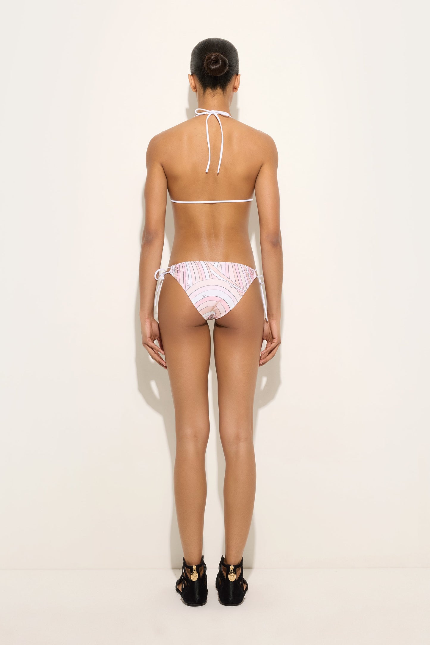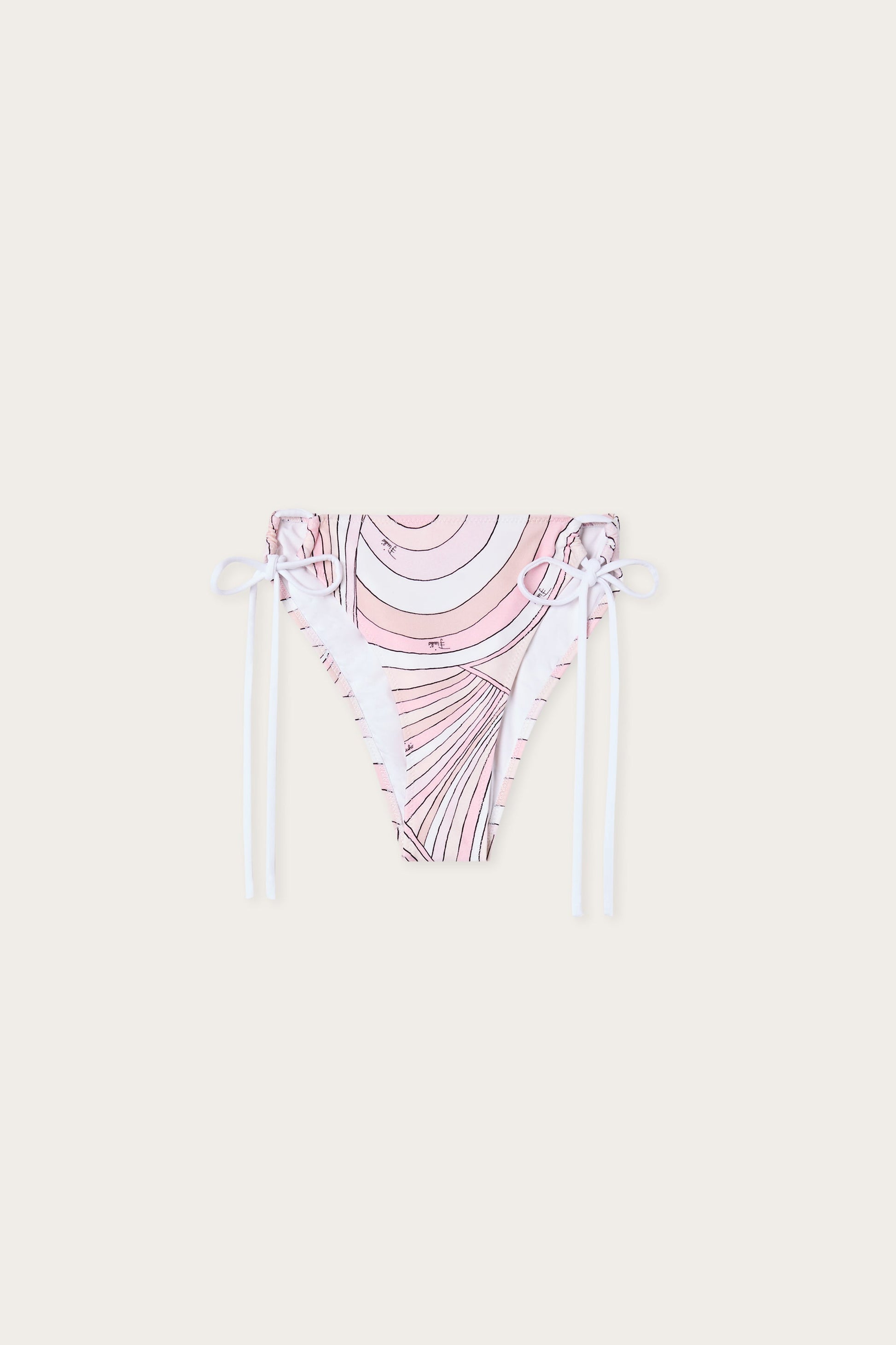Low-rise bikini bottoms featuring thin, adjustable side ties. The pink and nude Iride print adds a delicate, luminous graphic accent. The stretch Lycra offers comfort, protection, and a secure fit.