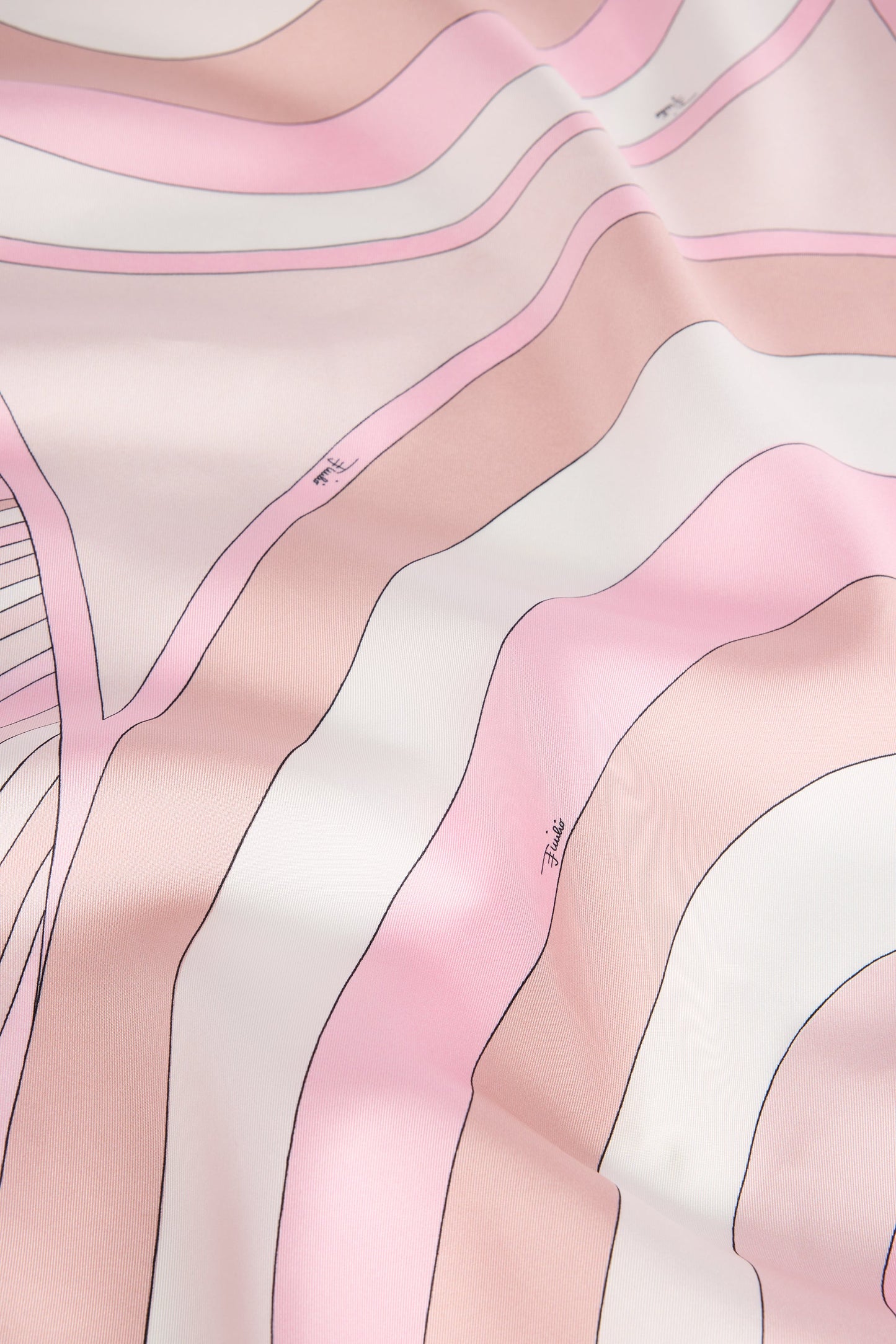 An iconic silk twill scarf featuring a simple, versatile design. The Iride print in shades of pink and nude adds a bright, distinctive graphic accent. The compact silk twill, with its smooth surface, enhances the definition of the design and the fabric’s natural sheen.