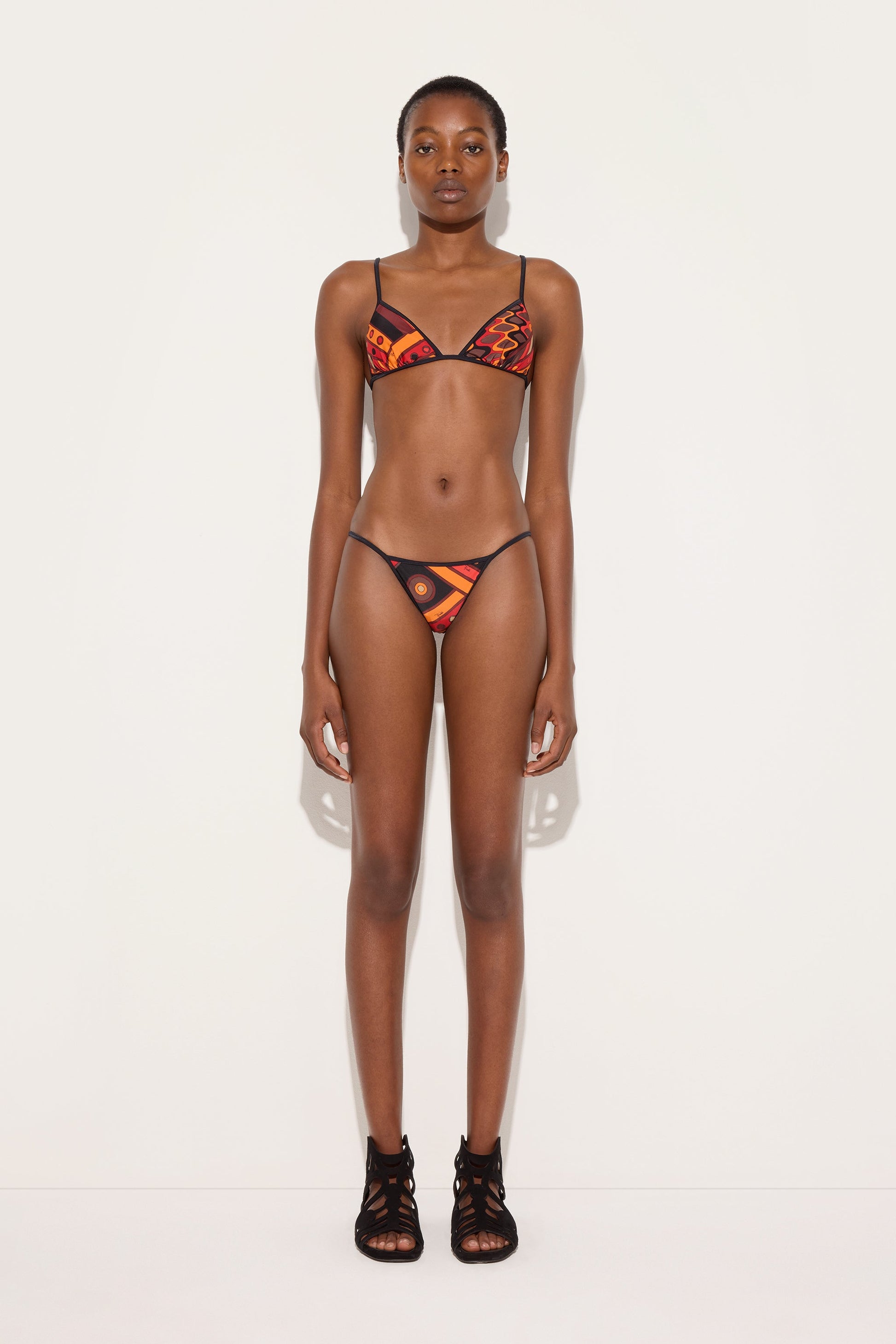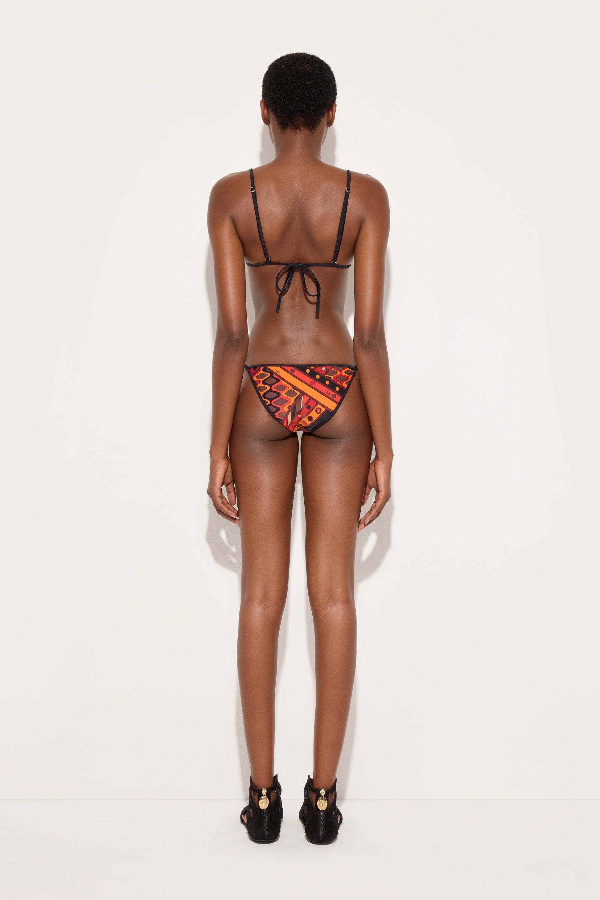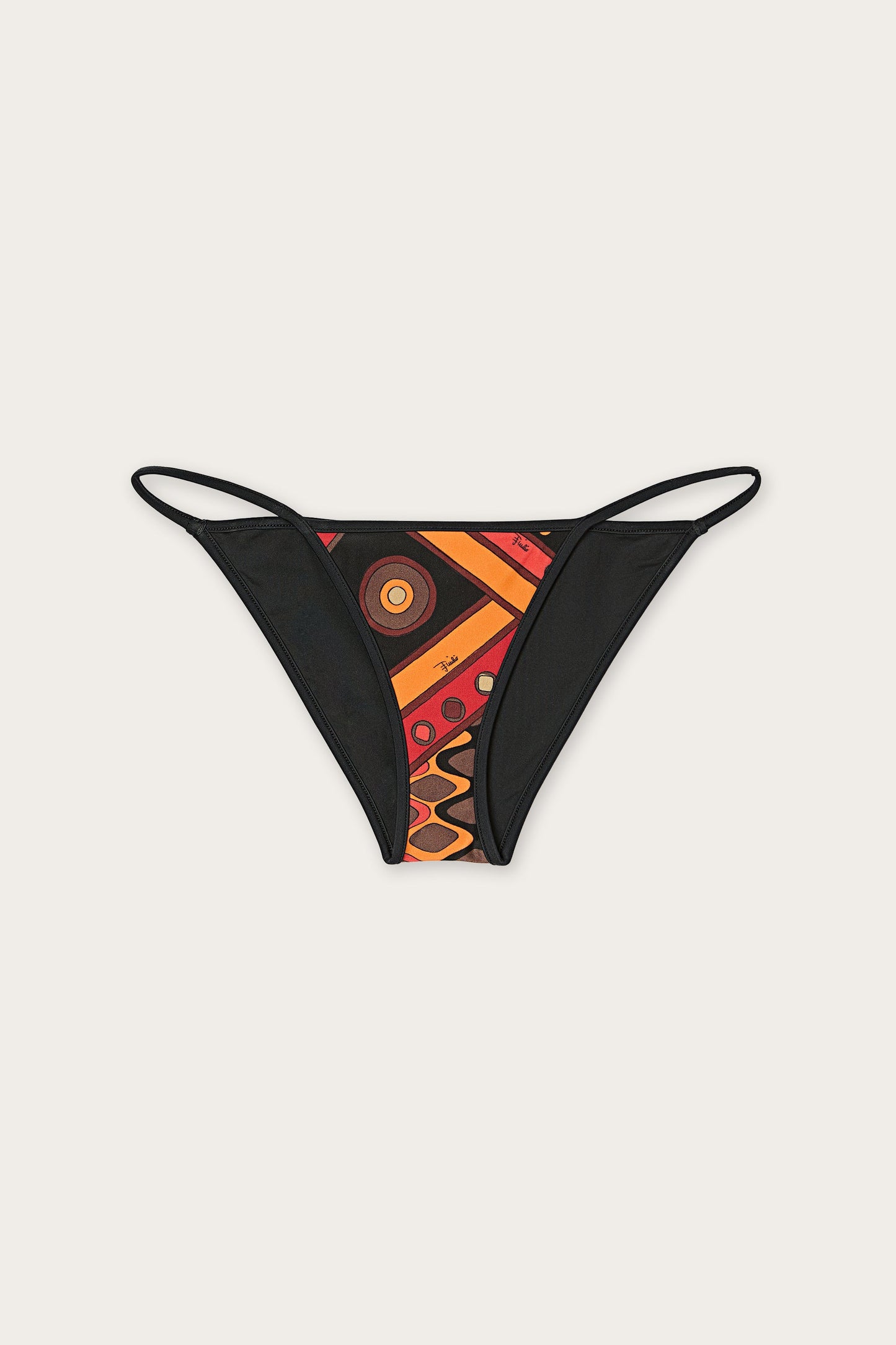 Low-rise bikini bottoms with a minimalist cut, designed for a simple, contemporary look. The thin ties at the hips add a light, feminine detail, allowing you to adjust the fit naturally. The orange and black Vivara print adds energy and character, transforming this style into a statement piece perfect for bold, iconic beachwear.