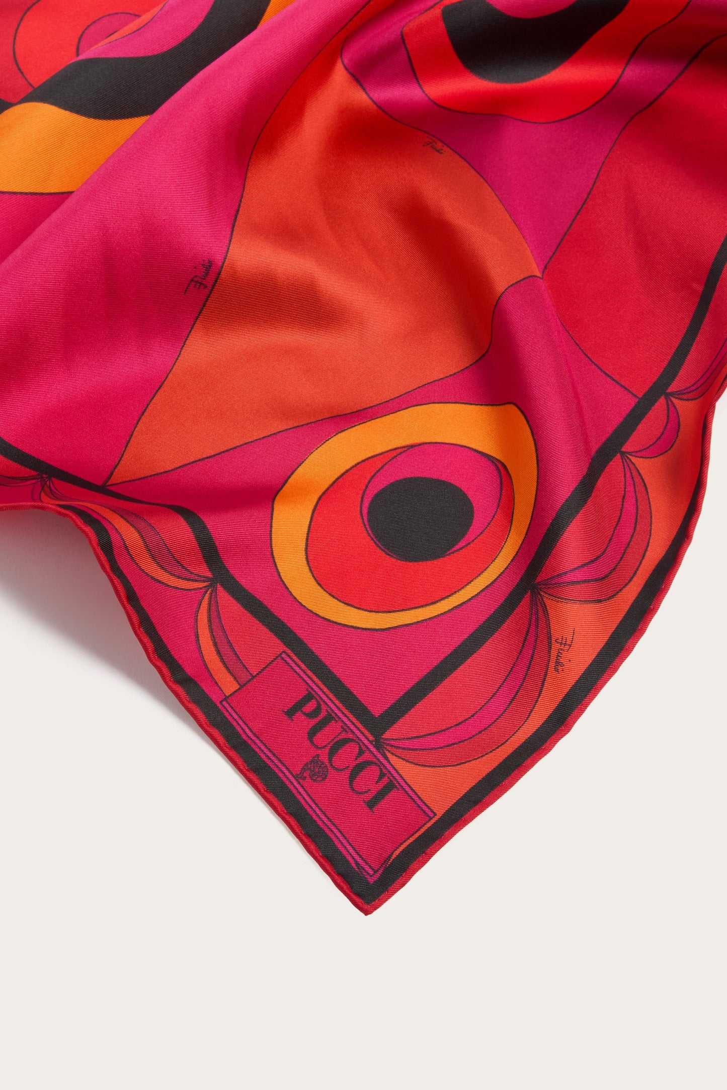 A timeless accessory that embodies all the elegance and color of the Pucci world. This silk twill scarf, with its iconic fuchsia and orange print, is the perfect detail to brighten up any look.Versatile and sophisticated, it can be worn around the neck, tied in the hair, or knotted to a bag for an unmistakable touch of class. A piece that speaks of style and personality, ideal for any occasion.