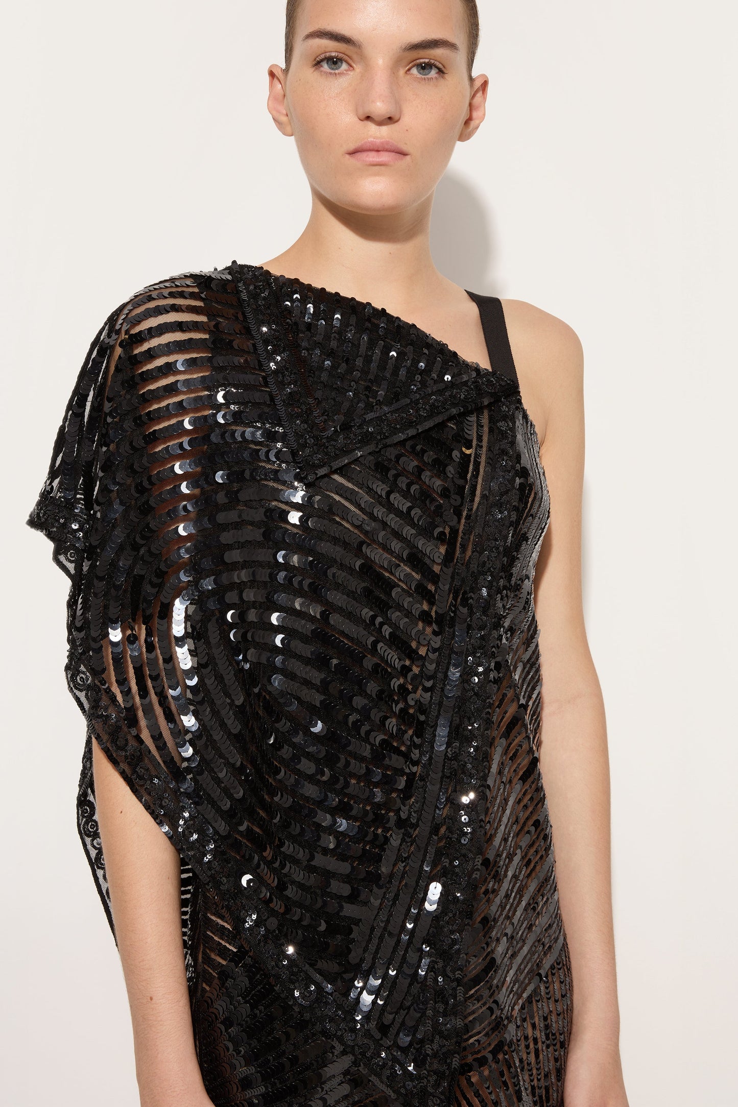 Asymmetric short foulard dress with printed grosgrain strap and logo metal slider, featuring all-over embroidery detailing. The entire surface is machine-embroidered with black sequins of various sizes, reinterpreting the Iride print in a luminous, contemporary key. The result is a sparkling, dynamic effect, designed to capture the light with every movement.