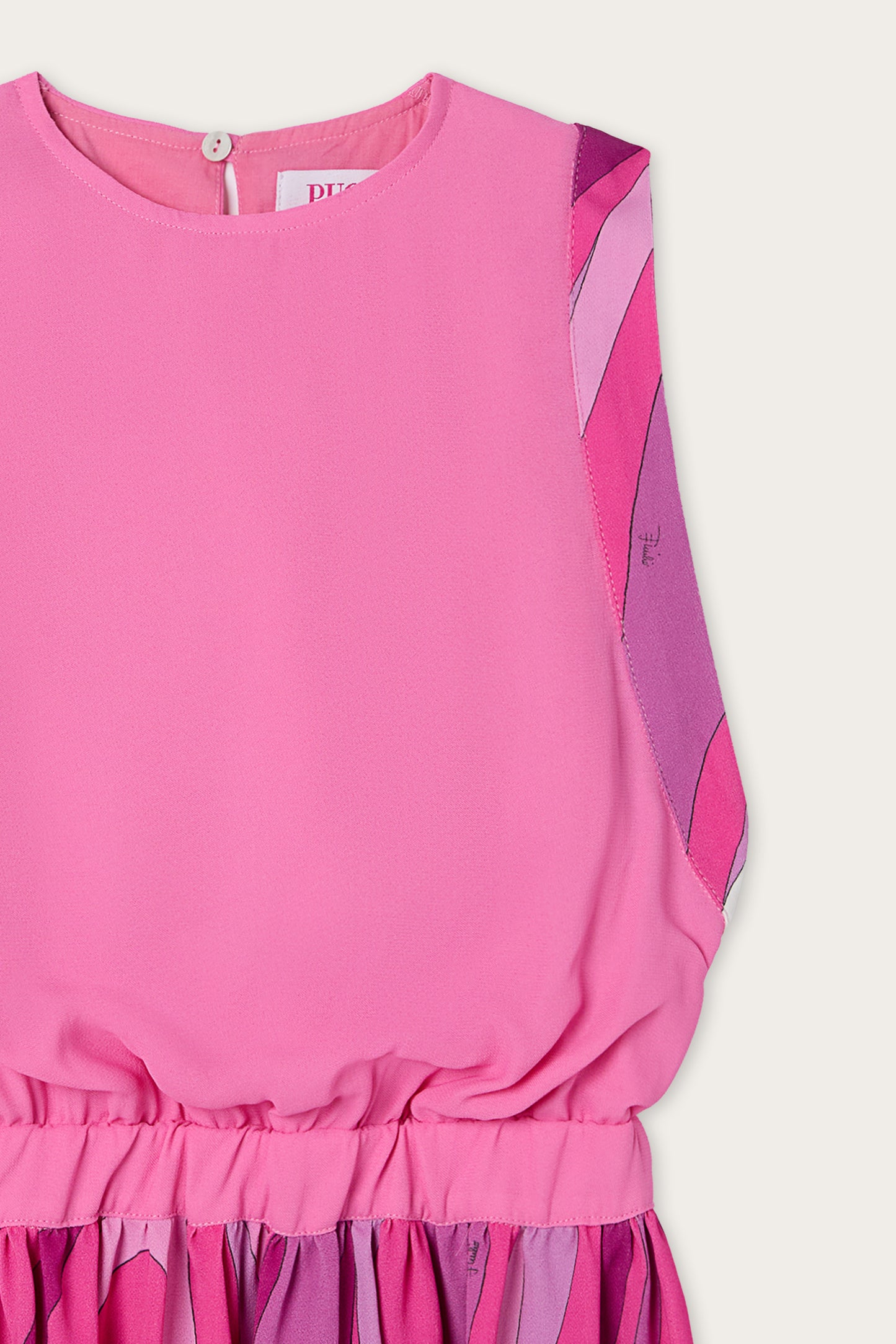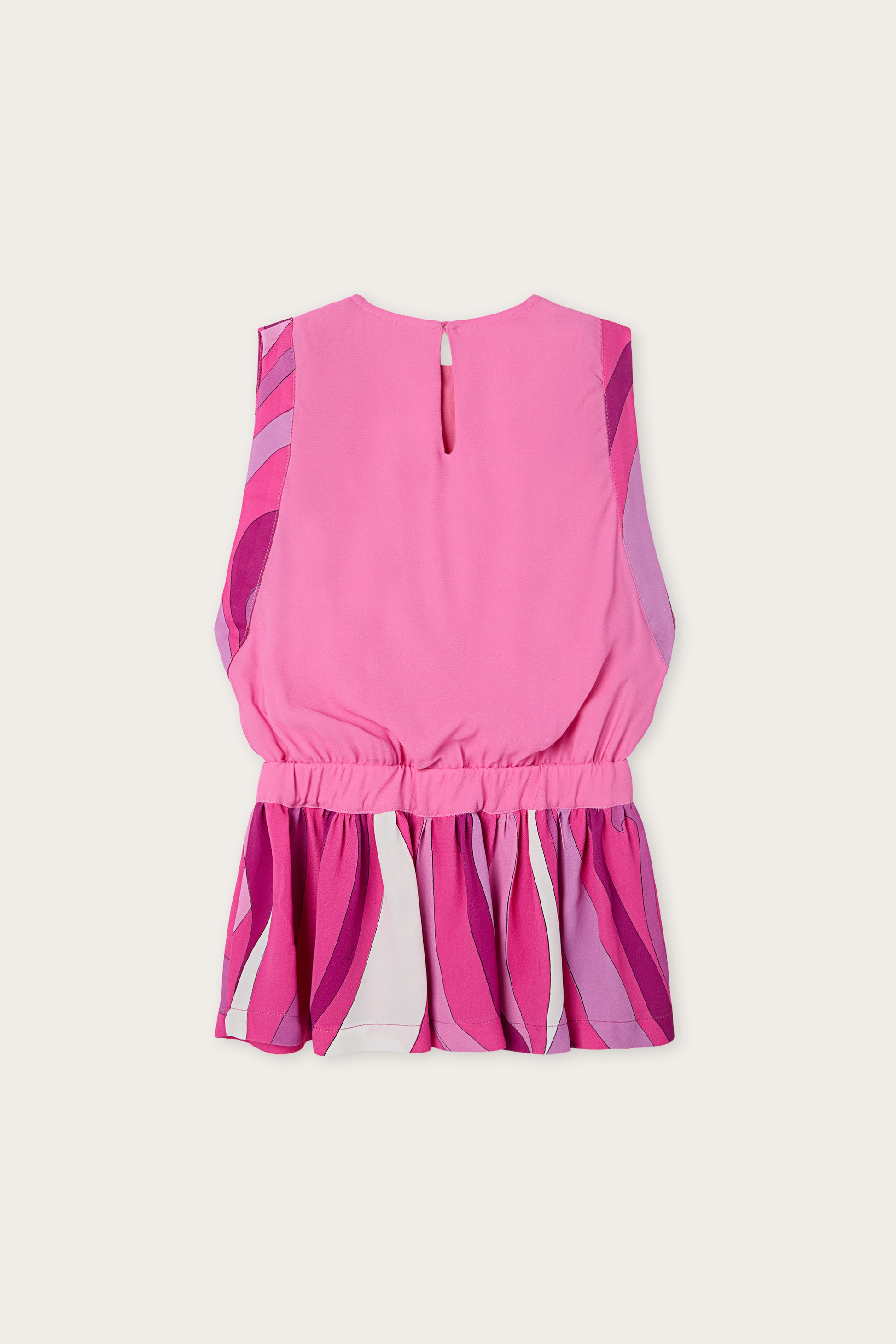 A sleeveless georgette dress featuring a cropped silhouette with a gathered waist and mini skirt.The fuchsia color adds a vibrant and bold accent to the design.The lightweight, flowing fabric creates movement and drapes naturally over the silhouette.