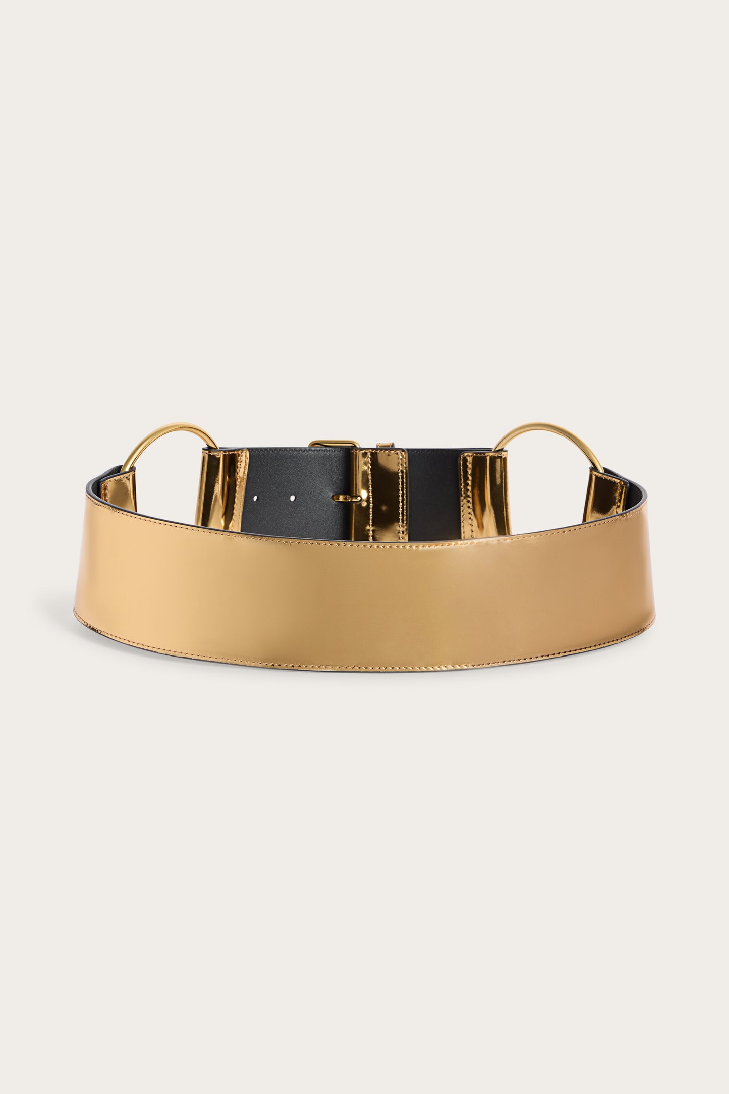 A statement leather belt defined by its structured silhouette and continuous metal accents. Crafted in gold metallic leather and enriched with matching gold-tone plates, it delivers a bold, contemporary aesthetic. The rigid construction and refined hardware lend strong character, transforming it into a distinctive focal point for any look.