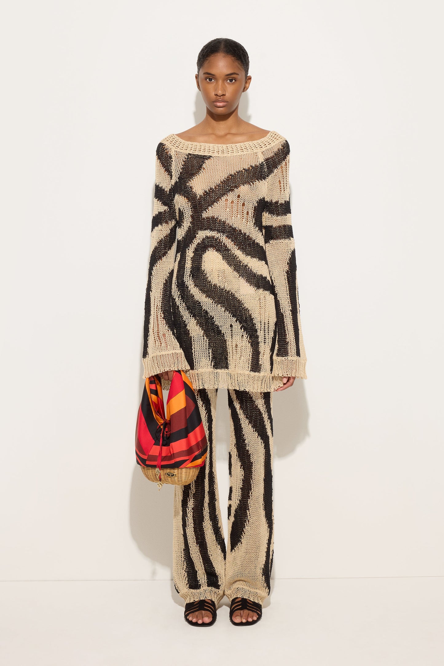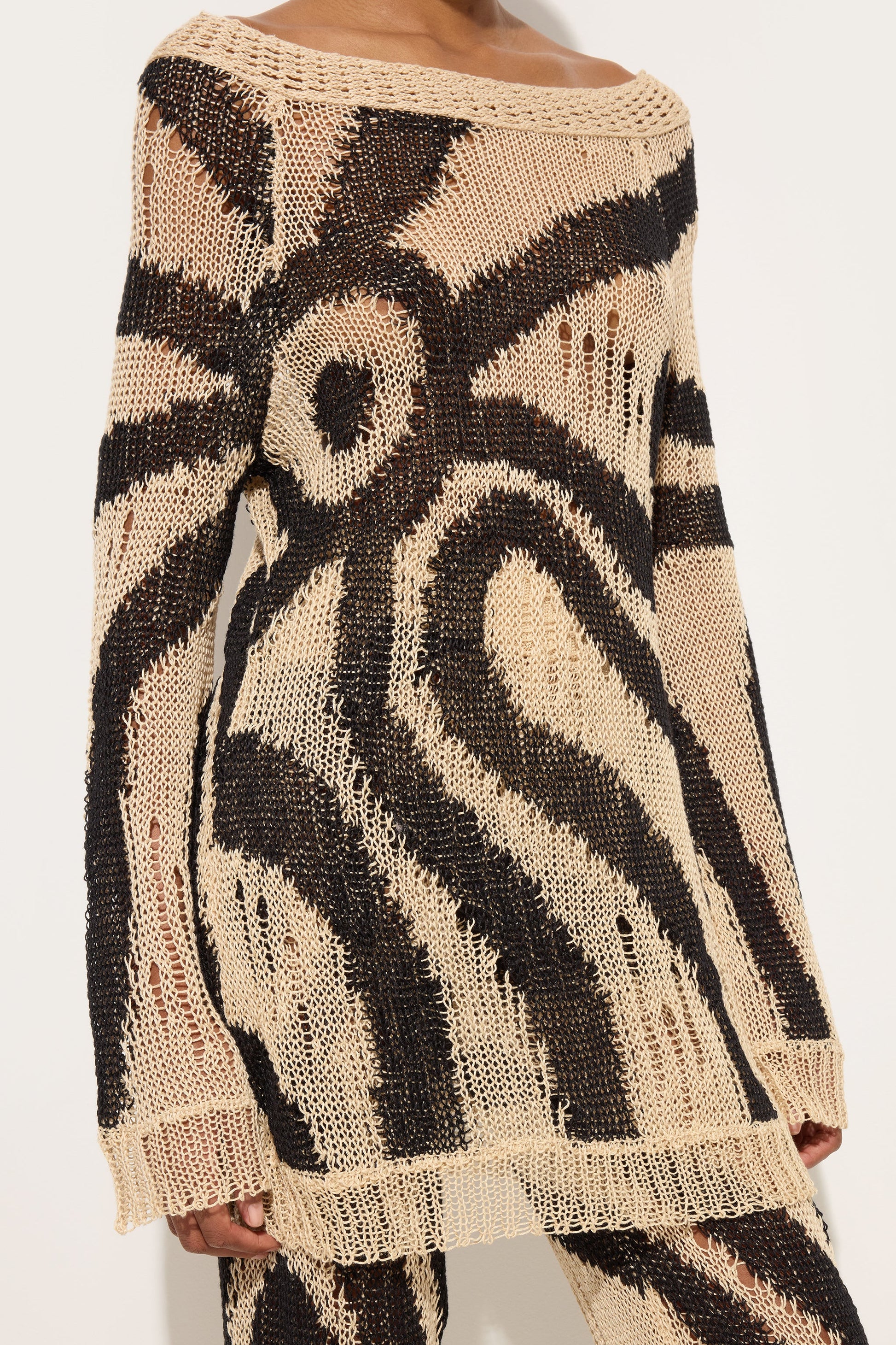 A dress with an artisanal and contemporary character, where the Marmo print becomes a precisely constructed graphic element. Made of linen, it features long sleeves and an inlay that enhances the design with a structured and refined effect. The crocheted edge details add a delicate handmade touch, creating a refined contrast with the bold impact of the pattern. The combination of rope and black adds depth and intensity to a garment that combines tradition and modernity with natural elegance.