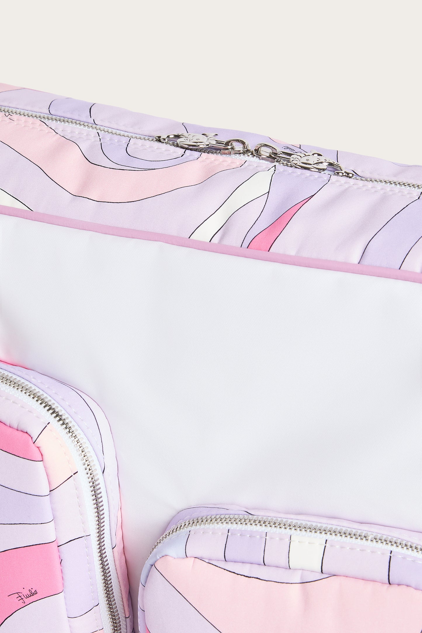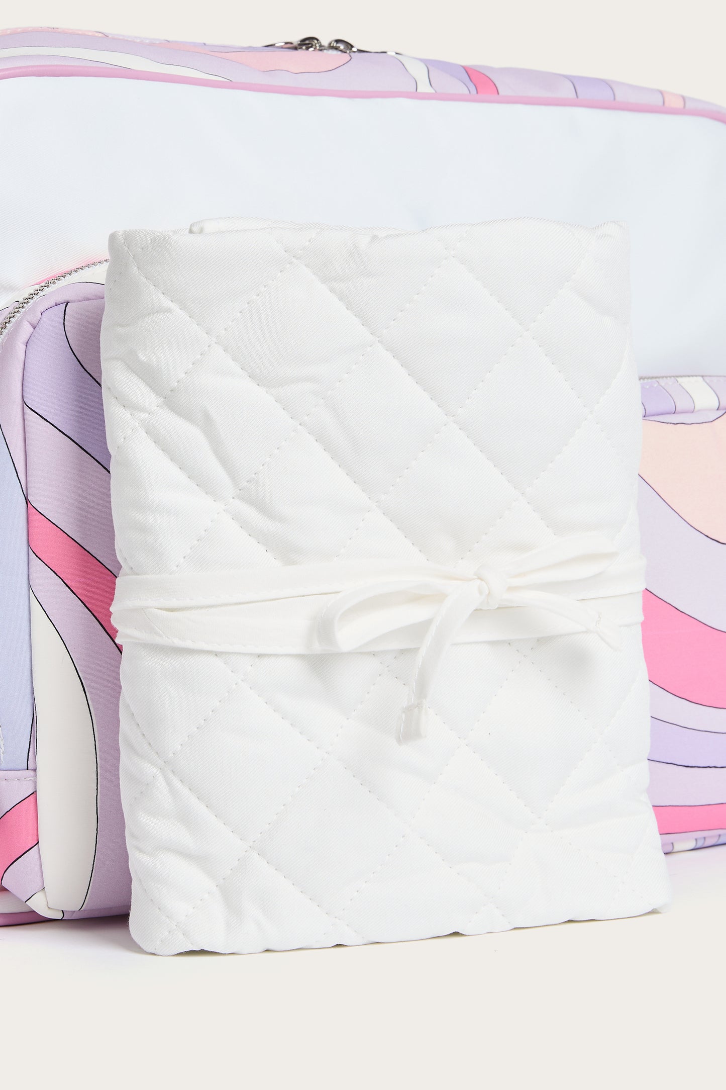 Made from recycled nylon, this diaper bag combines functionality and style. Decorated with the iconic Marmo print in shades of purple and pink, it features an adjustable shoulder strap and external zippered pockets for optimal organization of your baby’s essentials.