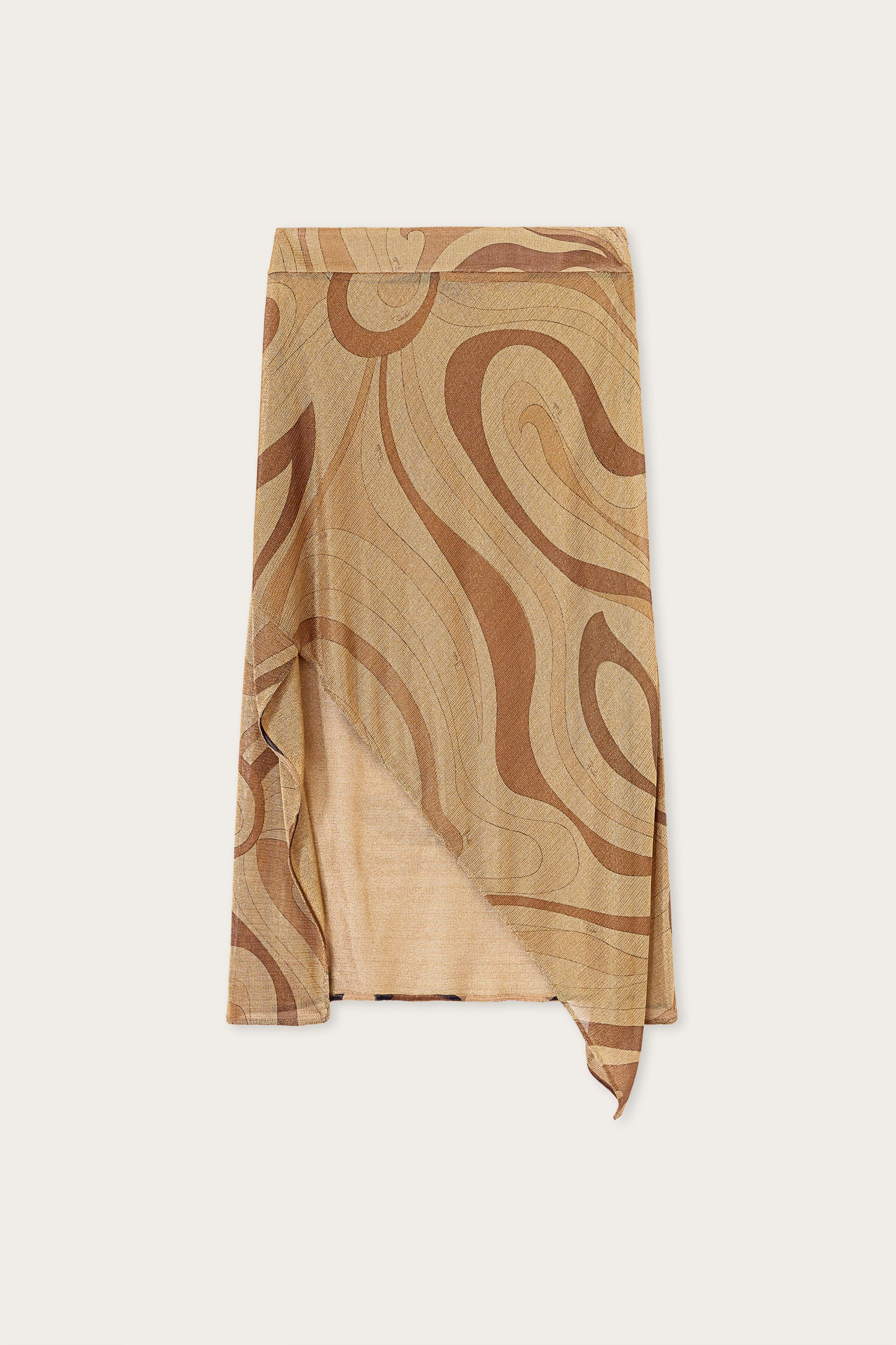 A luminous, contemporary piece that combines texture and movement. Crafted from golden lurex knit, this skirt enhances the fabric’s surface with brilliant reflections that highlight the design.The Marmo print introduces a dynamic graphic rhythm, creating a refined contrast with the lurex’s brilliance and flowing gracefully along the silhouette.