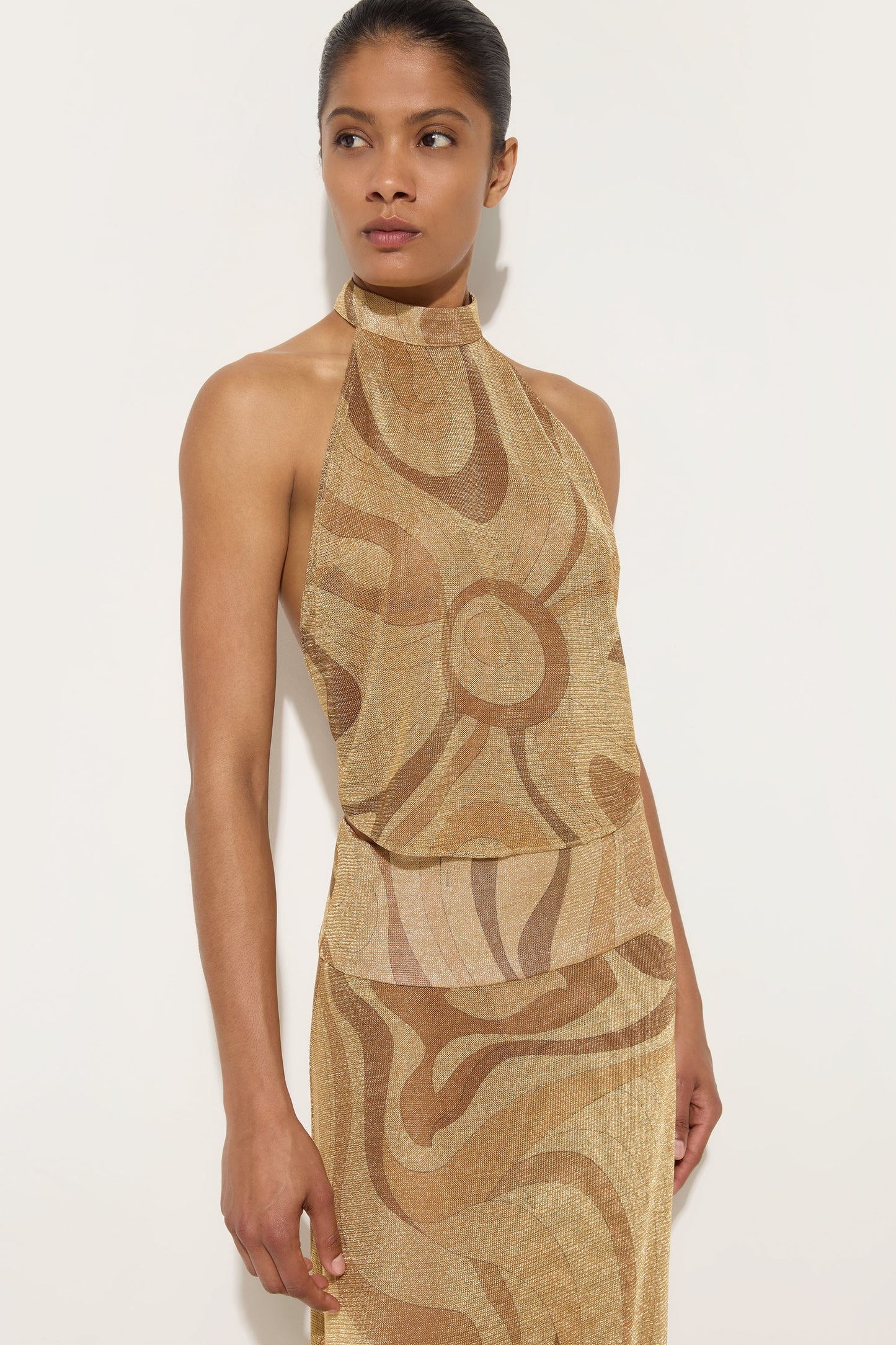 A luminous, eye-catching piece that combines sparkle and movement. Crafted from golden lurex knit, this sleeveless top stands out for its lightweight construction and neck tie, which defines the silhouette with an elegant touch.The Marmo print adds graphic depth to the fabric’s luminous surface, creating a dynamic contrast between light and color.