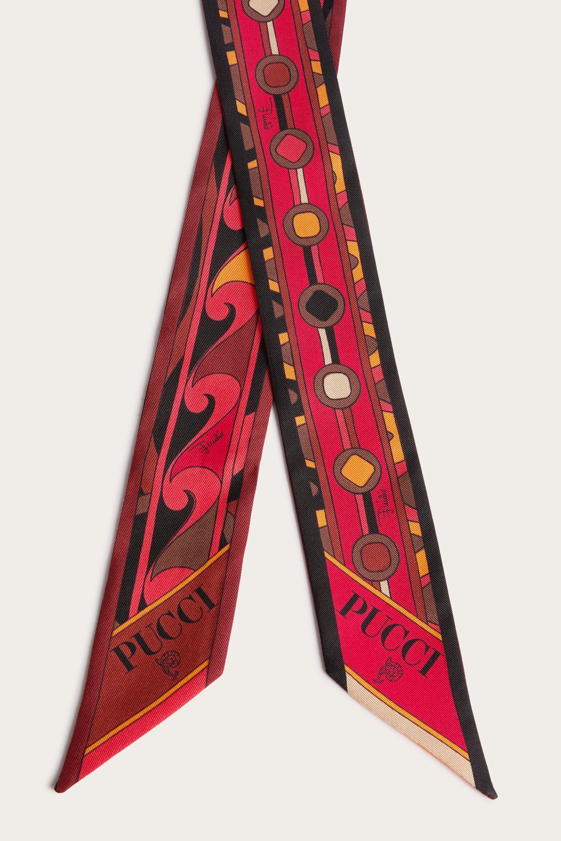An elegant and versatile accessory, perfect for adding a touch of color to any look. This silk twilleau features pointed edges and a refined mix of prints. Lightweight and sophisticated, it can be worn in a variety of ways: as a headband, around the wrist, or tied to a bag for a distinctive detail that expresses the unmistakable Pucci style.