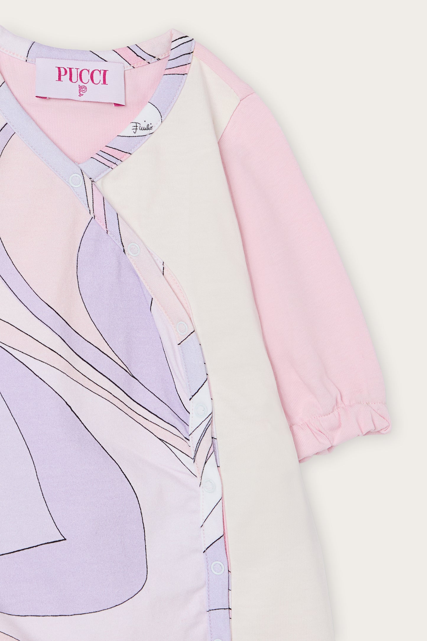 A maternity set consisting of a side-opening onesie, matching bib, and hat, all made from organic jersey.The Onde print in shades of pink and lilac adds a delicate and harmonious graphic accent to all the pieces.The soft and breathable stretch cotton jersey is designed to ensure comfort and gentleness against the skin.