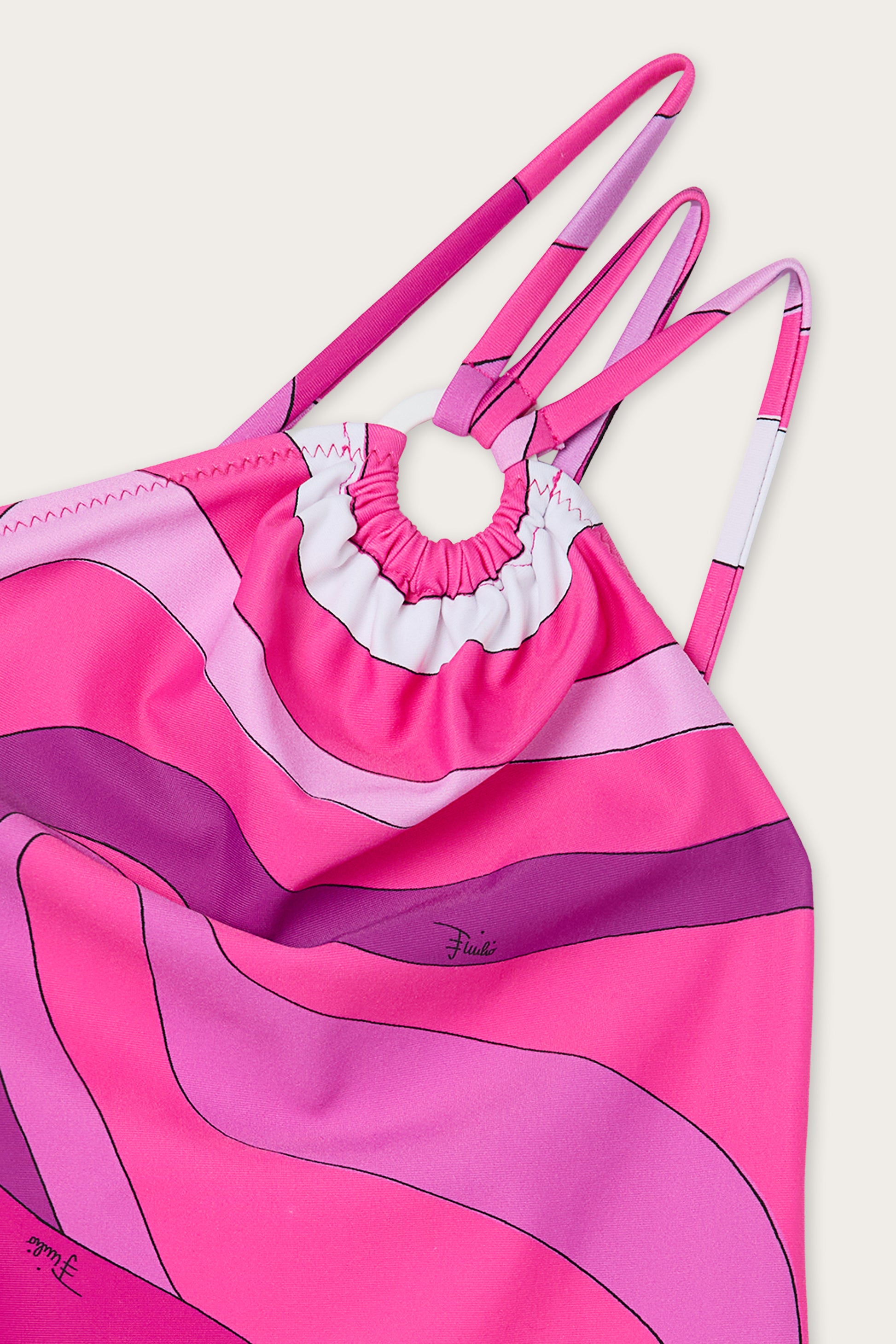 Lycra one-piece swimsuit featuring a one-shoulder design with a ring and a three-strand strap.The Marmo print in shades of purple and white adds a dynamic and distinctive graphic accent.The stretch fabric flexibly follows your movements, ensuring a comfortable fit.
