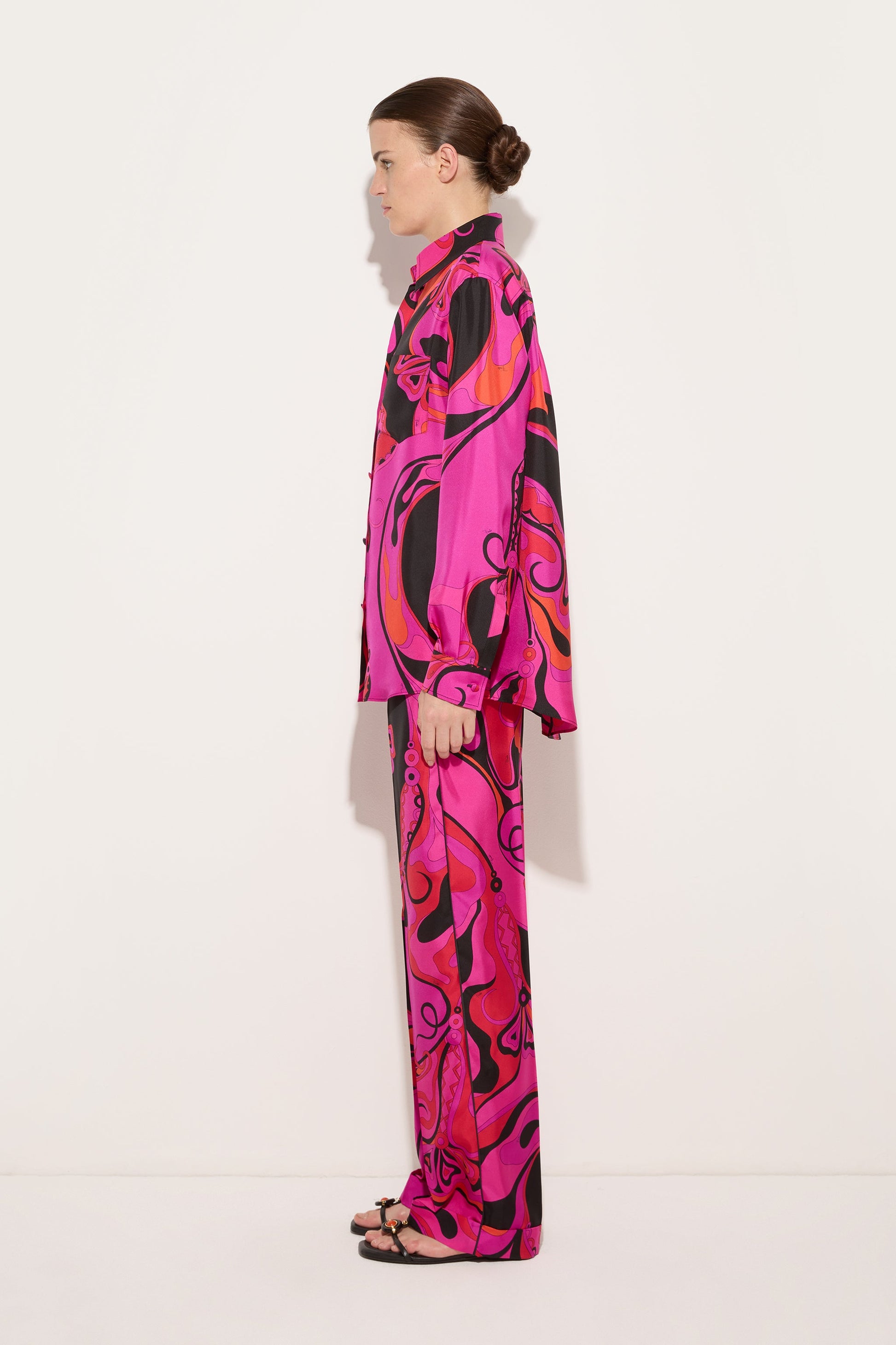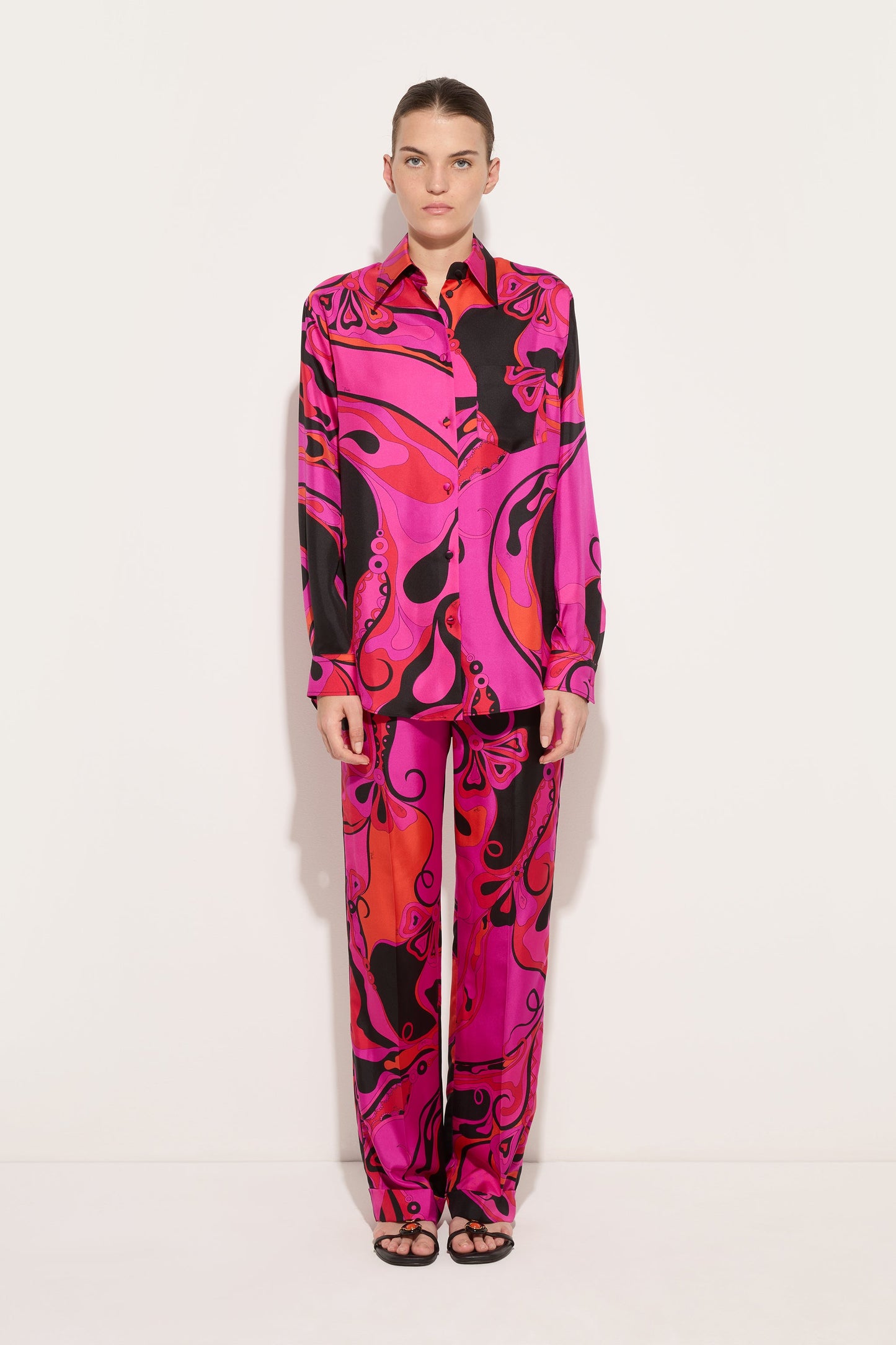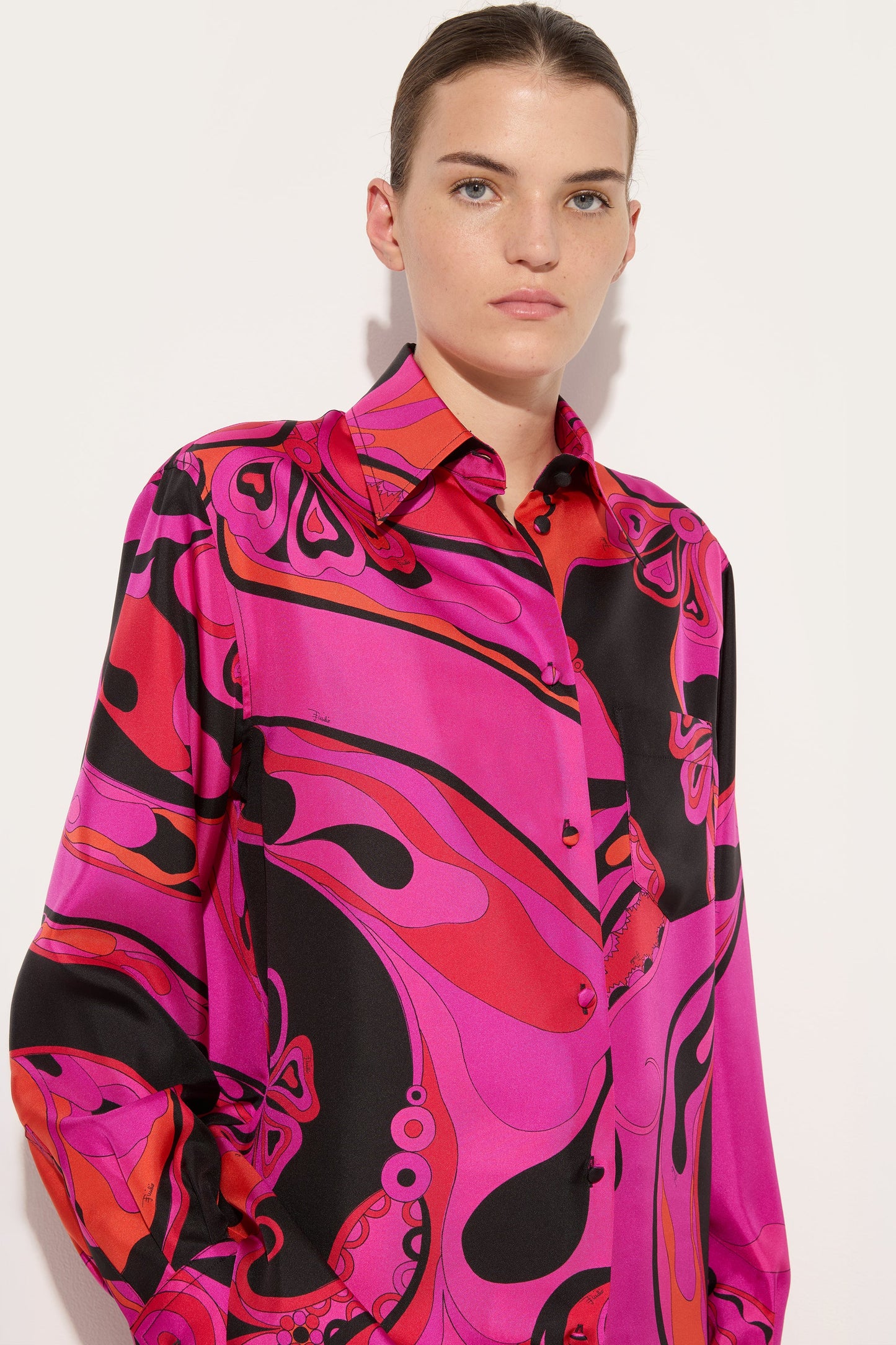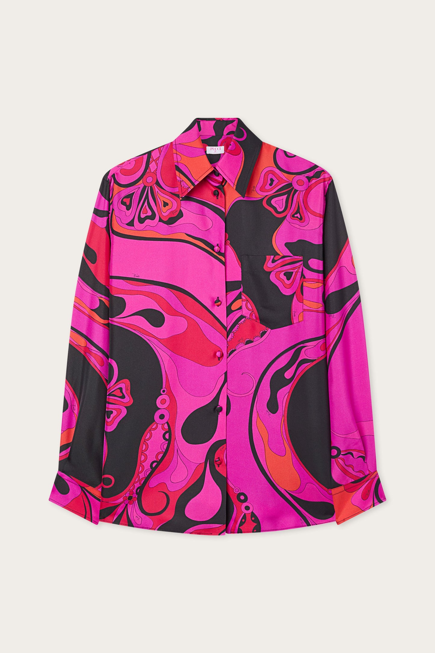 A shirt with essential elegance that highlights the graphic power of the Orchidee print. Made from silk twill, it features a classic collar and a front button closure that defines a clean and timeless line. The regular fit and length naturally accompany the body, while the combination of fuchsia and black illuminates the surface with a bold and contemporary effect. A refined garment, designed to enhance the color and fluidity of the fabric with balance.