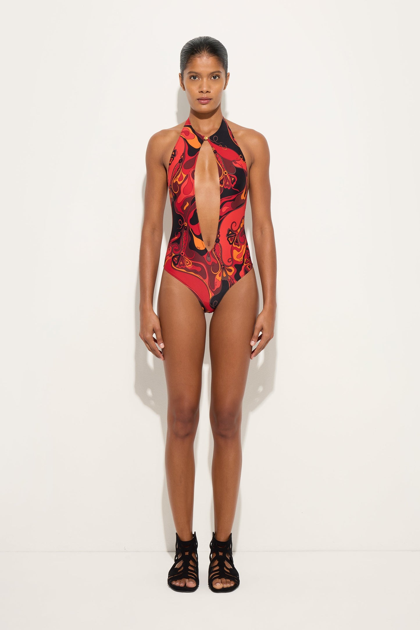 A swimsuit with a strong graphic impact that plays with openings and visual contrasts. The high neck defines the upper part with a clean line, while the central opening at the front introduces a sensual and contemporary element. At the back, the deep neckline leaves the back exposed, balanced by a metal button positioned at the top that adds a bright and functional accent. The Orchidee print in shades of orange and black enlivens the surface with vibrant energy, while the stretch Lycra wraps around the body, ensuring comfort and freedom of movement.