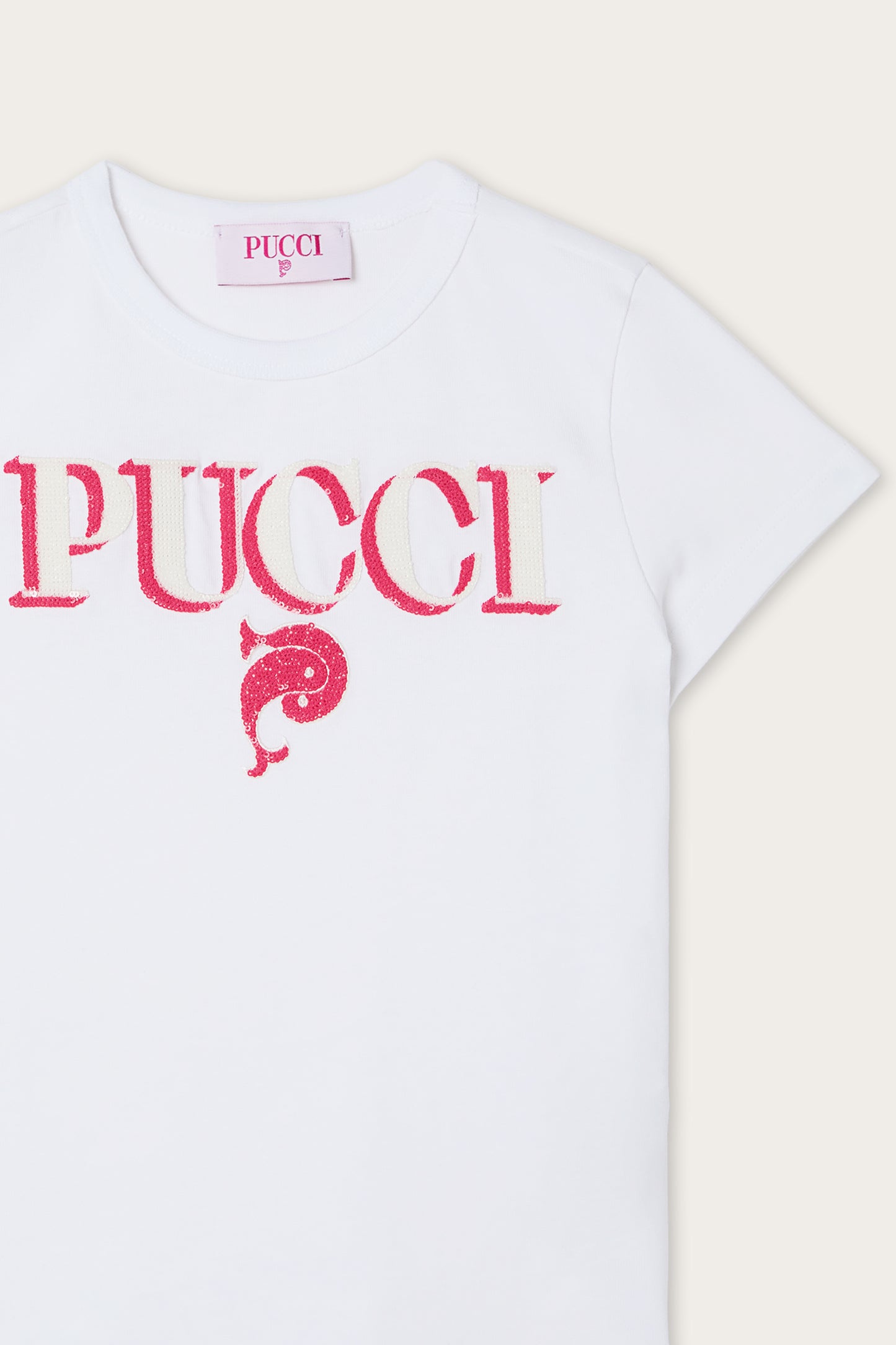 A soft-fit organic jersey T-shirt featuring a minimalist design.The white color is enhanced by the logo and the Pucci fish, embellished with fuchsia sequins that add a three-dimensional effect and a luminous glow.The soft, breathable cotton jersey ensures comfort and moves naturally with your body.